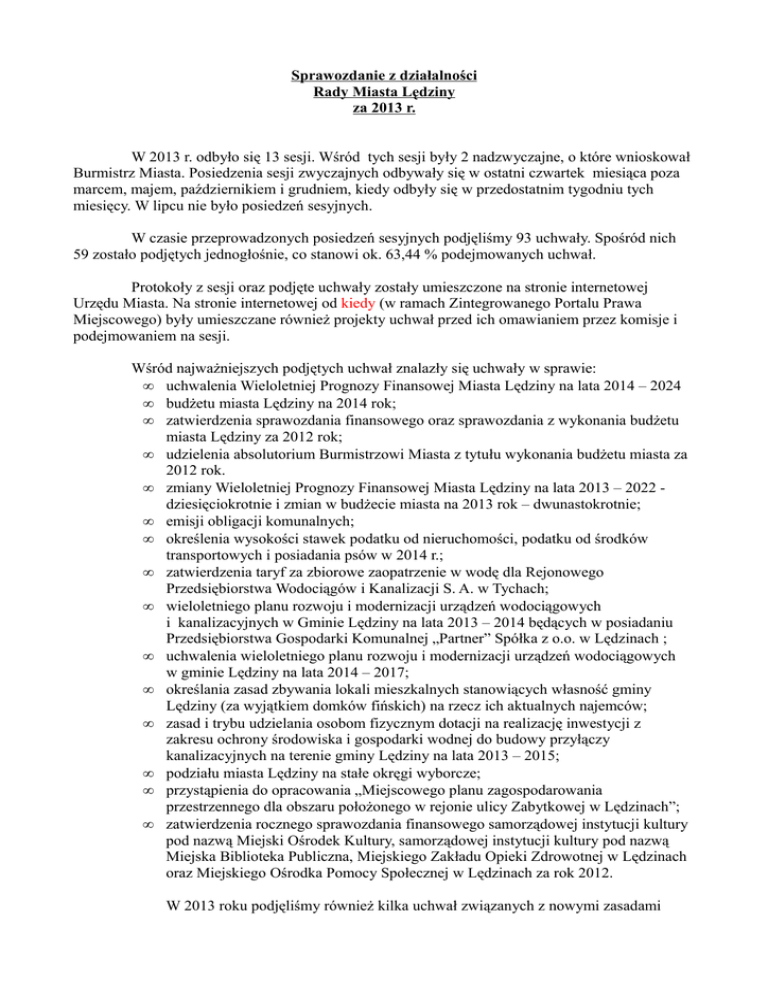Sprawozdanie z działalności Rady Miasta Lędziny za 2013 r. W