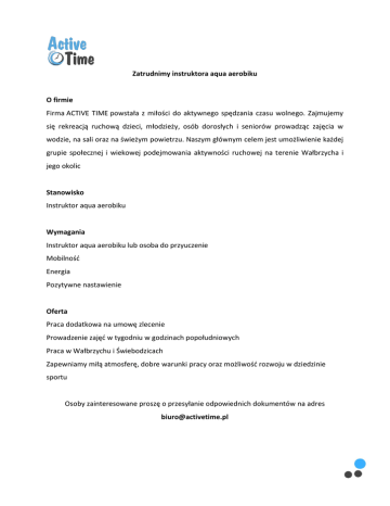 Zatrudnimy instruktora aqua aerobiku O firmie Firma ACTIVE TIME powstała z miłości do aktywnego spędzania czasu wolnego. Zajmujemy się rekreacją ruchową dzieci, młodzieży, osób dorosłych i seniorów prowadząc zajęcia w wodzie, na sali oraz na świeżym powietrzu. Naszym głównym celem jest umożliwienie każdej grupie społecznej i wiekowej podejmowania aktywności ruchowej na terenie Wałbrzycha i jego okolic Stanowisko Instruktor aqua aerobiku Wymagania Instruktor aqua aerobiku lub osoba do przyuczenie Mobilnośd Energia Pozytywne nastawienie Oferta Praca dodatkowa na umowę zlecenie Prowadzenie zajęd w tygodniu w godzinach popołudniowych Praca w Wałbrzychu i Świebodzicach Zapewniamy miłą atmosferę, dobre warunki pracy oraz możliwośd rozwoju w dziedzinie sportu Osoby zainteresowane proszę o przesyłanie odpowiednich dokumentów na adres [email protected]