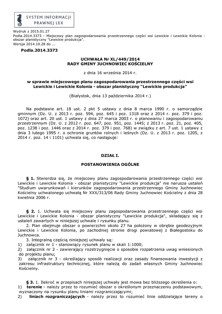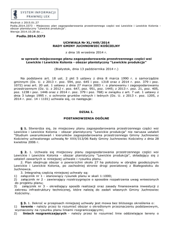 Wydruk z 2015.01.27 Podla.2014.3373 Miejscowy plan zagospodarowania przestrzennego części wsi Lewickie i Lewickie Kolonia obszar planistyczny "Lewickie produkcja". Wersja 2014.10.28 do ... Podla.2014.3373 UCHWAŁA Nr XL/449/2014 RADY GMINY JUCHNOWIEC KOŚCIELNY z dnia 16 września 2014 r. w sprawie miejscowego planu zagospodarowania przestrzennego części wsi Lewickie i Lewickie Kolonia obszar planistyczny "Lewickie produkcja" (Białystok, dnia 13 października 2014 r.) Na podstawie art. 18 ust. 2 pkt 5 ustawy z dnia 8 marca 1990 r. o samorządzie gminnym (Dz. U. z 2013 r. poz. 594, poz. 645 i poz. 1318 oraz z 2014 r. poz. 379 i poz. 1072) oraz art. 20 ust. 1 ustawy z dnia 27 marca 2003 r. o planowaniu i zagospodarowaniu przestrzennym (Dz. U. z 2012 r. poz. 647, poz. 951, poz. 1445; z 2013 r. poz. 21, poz. 405, poz. 1238 i poz. 1446 oraz z 2014 r. poz. 379 i poz. 768) w związku z art. 7 ust. 1 ustawy z dnia 3 lutego 1995 r. o ochronie gruntów rolnych i leśnych (Dz. U. z 2013 r. poz. 1205, z 2014 r. poz. 14 i 1101) uchwala się, co następuje: DZIAŁ I. POSTANOWIENIA OGÓLNE § 1. Stwierdza się, że miejscowy planu zagospodarowania przestrzennego części wsi Lewickie i Lewickie Kolonia obszar planistyczny "Lewickie produkcja" nie narusza ustaleń "Studium uwarunkowań i kierunków zagospodarowania przestrzennego Gminy Juchnowiec Kościelny uchwalonego uchwałą Nr XXX/313/06 Rady Gminy Juchnowiec Kościelny z dnia 28 kwietnia 2006 r. § 2. 1. Uchwala się miejscowy planu zagospodarowania przestrzennego części wsi Lewickie i Lewickie Kolonia obszar planistyczny "Lewickie produkcja", składający się z ustaleń zawartych w niniejszej uchwale i rysunku planu. 2. Plan obejmuje obszar o powierzchni około 27 ha położony w obrębie geodezyjnym Lewickie i Lewickie Kolonia, po zachodniej stronie drogi powiatowej z Białegostoku do Juchnowca. 3. Integralną częścią niniejszej uchwały są: 1) załącznik nr 1 stanowiący rysunek planu w skali 1:1000; 2) załącznik nr 2 zawierający rozstrzygnięcie o sposobie rozpatrzenia uwag wniesionych do projektu planu; 3) załącznik nr 3 określający sposób realizacji oraz zasady finansowania inwestycji z zakresu infrastruktury technicznej, które należą do zadań własnych Gminy Juchnowiec Kościelny. § 3. 1. Ilekroć w przepisach niniejszej uchwały jest mowa bez bliższego określenia o: 1) terenie należy przez to rozumieć obszar o określonym przeznaczeniu podstawowym, wyznaczony na rysunku planu liniami rozgraniczającymi; 2) liniach rozgraniczających należy przez to rozumieć linie oddzielające tereny o różnych funkcjach lub różnych zasadach zagospodarowania; 3) nieprzekraczalnych liniach zabudowy należy przez to rozumieć linie, których nie mogą przekroczyć ściany budynków w kierunku ulicy lub sąsiedniego terenu (nie dotyczy ganków, wykuszy, pilastrów itp., przekraczających tę linię na fragmentach do 25% długości elewacji na głębokość nie większą niż 2 m); 4) zabudowie usługowej należy przez to rozumieć obiekty służące zaspokajaniu potrzeb ludności w szczególności z zakresu użyteczności publicznej i zamieszkania zbiorowego; 5) zabudowie produkcyjnej należy przez to rozumieć obiekty służące do wytwarzania dóbr materialnych na skalę przemysłową i do ich składowania; 6) obiektach i urządzeniach towarzyszących należy przez to rozumieć obiekty i urządzenia ściśle związane z prawidłowym funkcjonowaniem zabudowy na terenie określonym liniami rozgraniczającymi, a w szczególności przyłącza i lokalne urządzenia infrastruktury technicznej, garaże, budynki gospodarcze, podjazdy, parkingi i obiekty małej architektury; 7) powierzchni zabudowy należy przez to rozumieć łączną powierzchnię budynków zlokalizowanych na działce budowlanej lub terenie, na którym realizowana jest inwestycja, liczoną po największym obrysie ich ścian zewnętrznych; 8) powierzchni biologicznie czynnej należy przez to rozumieć powierzchnię gruntu na podłożu rodzimym, zapewniającą naturalną wegetację, zagospodarowaną zielenią lub wodą; 9) wskaźniku intensywności zabudowy należy przez to rozumieć stosunek powierzchni zabudowy pomnożonej przez ilość kondygnacji do powierzchni terenu inwestycji; 10) wysokości zabudowy należy przez to rozumieć wysokość budynku mierzoną od poziomu terenu przy głównym wejściu do budynku do poziomu najwyższego punktu konstrukcji dachu z warstwami wykończeniowymi; 11) zieleni urządzonej należy przez to rozumieć zieleń kształtową świadomie przez człowieka, towarzyszącą zabudowie, podnoszącą jej walory użytkowe i przestrzenne jako zieleń ozdobna, izolacyjna i użytkowa (np. sady i ogrody przydomowe), wzbogacona elementami małej architektury; 12) nośniku informacji należy przez to rozumieć informację o podmiocie i działalności prowadzonej na danym terenie, umieszczoną na tablicy informacyjnej lub szyldzie; 13) nośniku reklamy należy przez to rozumieć informację o charakterze komercyjnym nie związaną z rodzajem działalności prowadzonym na danym terenie, umieszczoną na tablicy reklamowej lub w postaci przestrzennej formy reklamowej; 14) tablicy reklamowej należy przez to rozumieć nośnik reklamy w formie tablicy na budynku lub w formie wolnostojącej; 15) przestrzennej formy reklamowej rodzaj nośnika reklamy w formie kompozycji przestrzennej; 16) tablicy informacyjnej należy przez to rozumieć nośnik informacji umieszczany w formie tablicy na budynku lub w formie wolnostojącej; 17) szyldzie należy przez to rozumieć zewnętrzne oznaczenie stałego miejsca wykonywania działalności gospodarczej lub siedziby instytucji, w formie tablicy informacyjnej o powierzchni nie większej niż 0,5 m2, umieszczonej płasko na ścianie bądź prostopadle do płaszczyzny ściany budynku (szyld semaforowy) przy wejściu/wejściach do budynku, w którym prowadzona jest działalność gospodarcza lub znajduje się siedziba 