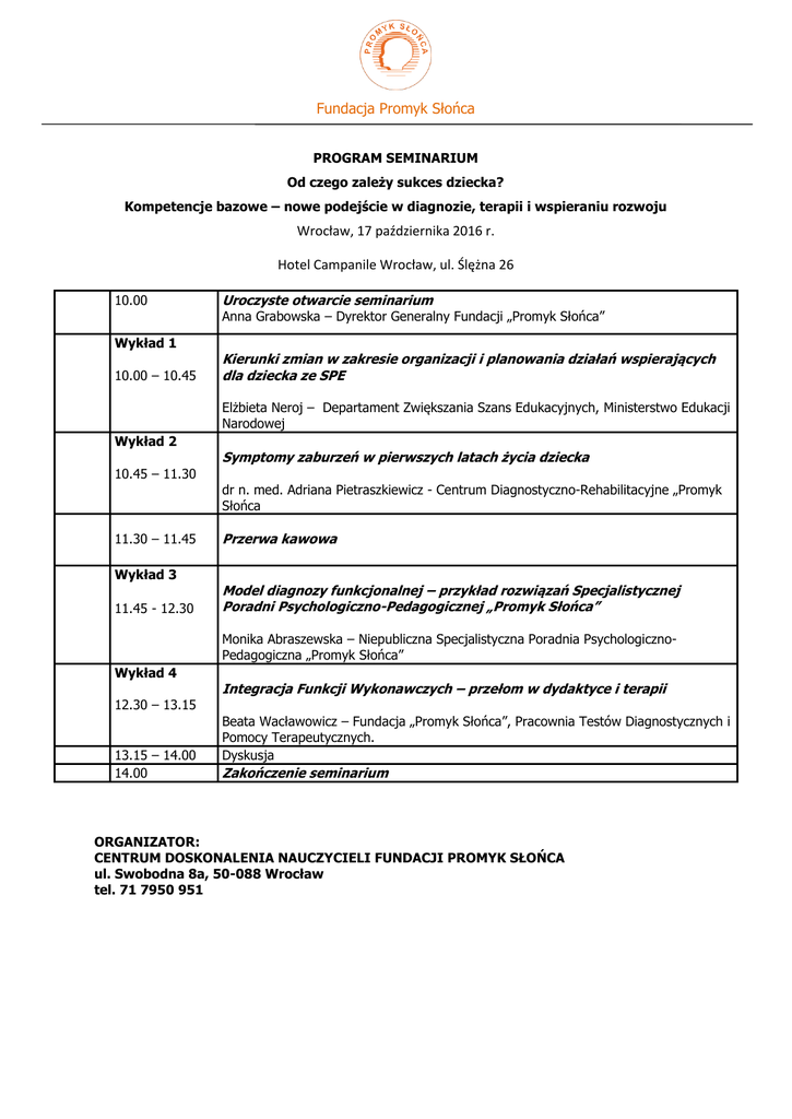 Fundacja Promyk Słońca PROGRAM SEMINARIUM Od czego zależy sukces dziecka? Kompetencje bazowe – nowe podejście w diagnozie, terapii i wspieraniu rozwoju Wrocław, 17 października 2016 r. Hotel Campanile Wrocław, ul. Ślężna 26 10.00 Wykład 1 10.00 – 10.45 Uroczyste otwarcie seminarium Anna Grabowska – Dyrektor Generalny Fundacji „Promyk Słońca” Kierunki zmian w zakresie organizacji i planowania działań wspierających dla dziecka ze SPE Elżbieta Neroj – Departament Zwiększania Szans Edukacyjnych, Ministerstwo Edukacji Narodowej Wykład 2 10.45 – 11.30 11.30 – 11.45 Wykład 3 11.45 - 12.30 Symptomy zaburzeń w pierwszych latach życia dziecka dr n. med. Adriana Pietraszkiewicz - Centrum Diagnostyczno-Rehabilitacyjne „Promyk Słońca Przerwa kawowa Kierunki działań MEN w zakresie wspierania rozwoju dzieci z dysfunkcjami Krystyna Szumilas,funkcjonalnej Sekretarz Stanu–wprzykład Ministerstwie EdukacjiSpecjalistycznej Narodowej Model diagnozy rozwiązań Poradni Psychologiczno-Pedagogicznej „Promyk Słońca” Monika Abraszewska – Niepubliczna Specjalistyczna Poradnia PsychologicznoPedagogiczna „Promyk Słońca” Wykład 4 12.30 – 13.15 13.15 – 14.00 14.00 Integracja Funkcji Wykonawczych – przełom w dydaktyce i terapii Beata Wacławowicz – Fundacja „Promyk Słońca”, Pracownia Testów Diagnostycznych i Pomocy Terapeutycznych. Dyskusja Zakończenie seminarium ORGANIZATOR: CENTRUM DOSKONALENIA NAUCZYCIELI FUNDACJI PROMYK SŁOŃCA ul. Swobodna 8a, 50-088 Wrocław tel. 71 7950 951