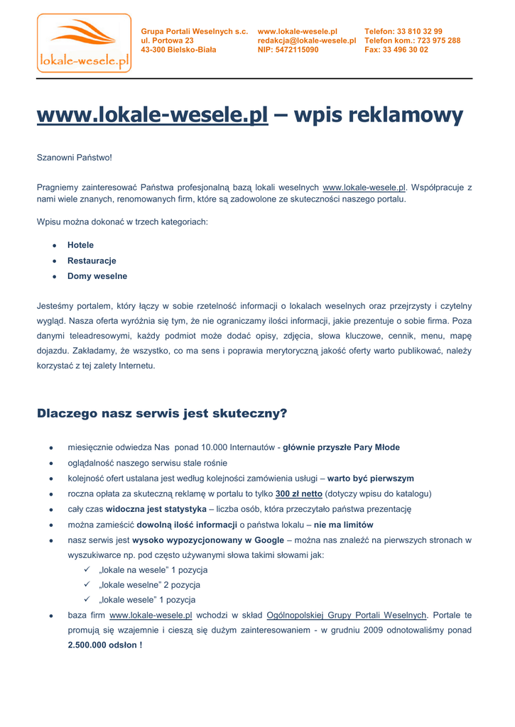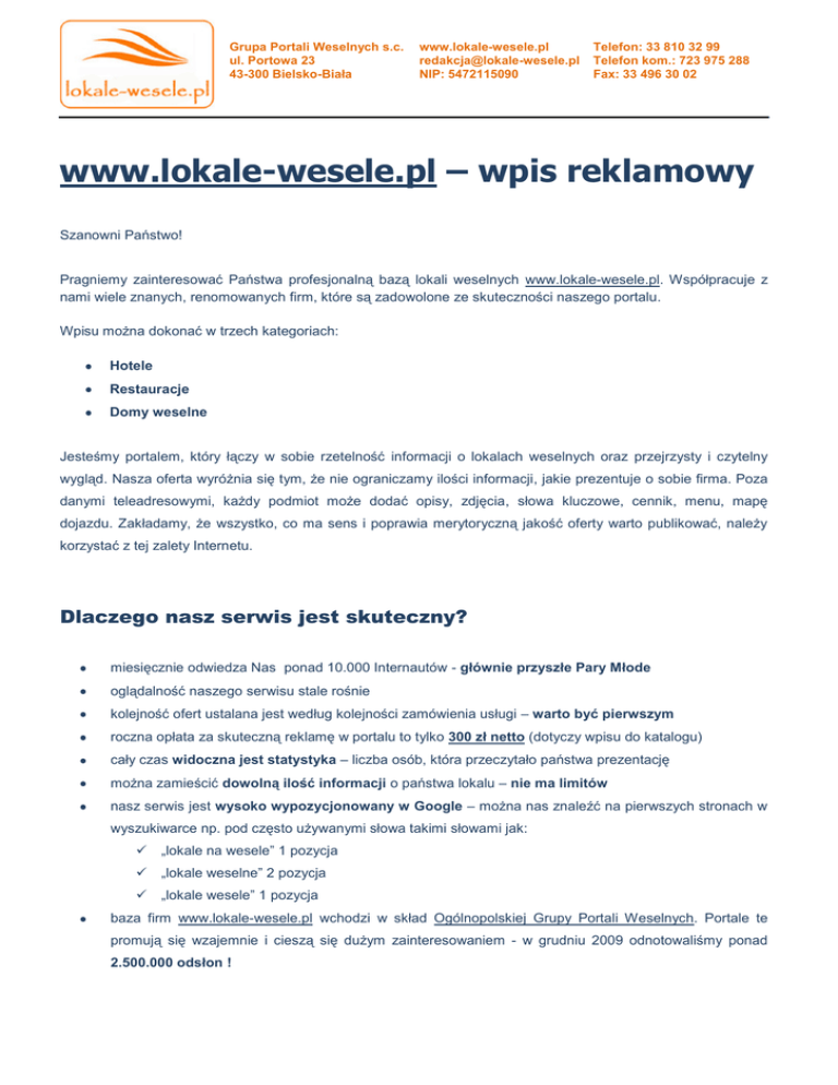 Grupa Portali Weselnych s.c. ul. Portowa 23 43-300 Bielsko-Biała www.lokale-wesele.pl [email protected] NIP: 5472115090 Telefon: 33 810 32 99 Telefon kom.: 723 975 288 Fax: 33 496 30 02 www.lokale-wesele.pl – wpis reklamowy Szanowni Państwo! Pragniemy zainteresować Państwa profesjonalną bazą lokali weselnych www.lokale-wesele.pl. Współpracuje z nami wiele znanych, renomowanych firm, które są zadowolone ze skuteczności naszego portalu. Wpisu można dokonać w trzech kategoriach: Hotele Restauracje Domy weselne Jesteśmy portalem, który łączy w sobie rzetelność informacji o lokalach weselnych oraz przejrzysty i czytelny wygląd. Nasza oferta wyróżnia się tym, że nie ograniczamy ilości informacji, jakie prezentuje o sobie firma. Poza danymi teleadresowymi, każdy podmiot może dodać opisy, zdjęcia, słowa kluczowe, cennik, menu, mapę dojazdu. Zakładamy, że wszystko, co ma sens i poprawia merytoryczną jakość oferty warto publikować, należy korzystać z tej zalety Internetu. Dlaczego nasz serwis jest skuteczny? miesięcznie odwiedza Nas ponad 10.000 Internautów - głównie przyszłe Pary Młode oglądalność naszego serwisu stale rośnie kolejność ofert ustalana jest według kolejności zamówienia usługi – warto być pierwszym roczna opłata za skuteczną reklamę w portalu to tylko 300 zł netto (dotyczy wpisu do katalogu) cały czas widoczna jest statystyka – liczba osób, która przeczytało państwa prezentację można zamieścić dowolną ilość informacji o państwa lokalu – nie ma limitów nasz serwis jest wysoko wypozycjonowany w Google – można nas znaleźć na pierwszych stronach w wyszukiwarce np. pod często używanymi słowa takimi słowami jak: „lokale na wesele” 1 pozycja „lokale weselne” 2 pozycja „lokale wesele” 1 pozycja baza firm www.lokale-wesele.pl wchodzi w skład Ogólnopolskiej Grupy Portali Weselnych. Portale te promują się wzajemnie i cieszą się dużym zainteresowaniem - w grudniu 2009 odnotowaliśmy ponad 2.500.000 odsłon ! Grupa Portali Weselnych s.c. ul. Portowa 23 43-300 Bielsko-Biała www.lokale-wesele.pl [email protected] NIP: 5472115090 Telefon: 33 810 32 99 Telefon kom.: 723 975 288 Fax: 33 496 30 02 Wpis reklamowy w portalu www.lokale-wesele.pl Wizytówka firmy składa się z następujących informacji: Nazwa firmy Ulica, kod miasto Województwo Telefon(y) Adres www Adres email Rodzaj lokalu (hotel, restauracja, dom weselny) Mapa dojazdu Zdjęcia Opis firmy Cennik Informacje o wyposażeniu: parking, kuchnia, klimatyzacja, miejsca noclegowe. Cennik wpisu reklamowego Forma reklamy Cena netto Wpis do katalogu 300 zł / rok Wpis do katalogu i promocja wizytówki na stronie głównej (dół – „Promowane”) + 180 zł / miesiąc Wpis do katalogu i promocja wizytówki na stronie głównej (prawa strona – „Polecane”) + 220 zł / miesiąc Jak zamówić usługę? Zapraszamy do kontaktu z naszym konsultantem w formie elektronicznej [email protected] lub w formie telefonicznej pod numerem: +48 33 810 32 99, + 48 723 975 288.
