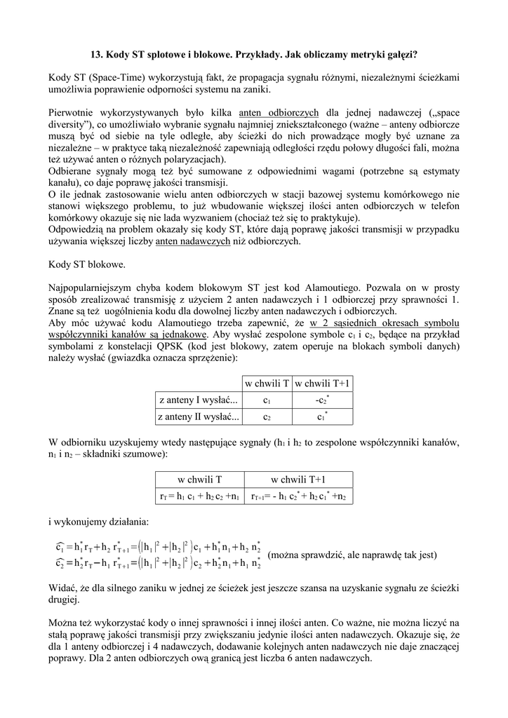 13. Kody ST splotowe i blokowe. Przykłady. Jak obliczamy metryki gał zi? ę Kody ST (Space-Time) wykorzystują fakt, Ŝe propagacja sygnału róŜnymi, niezaleŜnymi ścieŜkami umoŜliwia poprawienie odporności systemu na zaniki. Pierwotnie wykorzystywanych było kilka anten odbiorczych dla jednej nadawczej („space diversity”), co umoŜliwiało wybranie sygnału najmniej zniekształconego (waŜne – anteny odbiorcze muszą być od siebie na tyle odległe, aby ścieŜki do nich prowadzące mogły być uznane za niezaleŜne – w praktyce taką niezaleŜność zapewniają odległości rzędu połowy długości fali, moŜna teŜ uŜywać anten o róŜnych polaryzacjach). Odbierane sygnały mogą teŜ być sumowane z odpowiednimi wagami (potrzebne są estymaty kanału), co daje poprawę jakości transmisji. O ile jednak zastosowanie wielu anten odbiorczych w stacji bazowej systemu komórkowego nie stanowi większego problemu, to juŜ wbudowanie większej ilości anten odbiorczych w telefon komórkowy okazuje się nie lada wyzwaniem (chociaŜ teŜ się to praktykuje). Odpowiedzią na problem okazały się kody ST, które dają poprawę jakości transmisji w przypadku uŜywania większej liczby anten nadawczych niŜ odbiorczych. Kody ST blokowe. Najpopularniejszym chyba kodem blokowym ST jest kod Alamoutiego. Pozwala on w prosty sposób zrealizować transmisję z uŜyciem 2 anten nadawczych i 1 odbiorczej przy sprawności 1. Znane są teŜ uogólnienia kodu dla dowolnej liczby anten nadawczych i odbiorczych. Aby móc uŜywać kodu Alamoutiego trzeba zapewnić, Ŝe w 2 sąsiednich okresach symbolu współczynniki kanałów są jednakowe. Aby wysłać zespolone symbole c1 i c2, będące na przykład symbolami z konstelacji QPSK (kod jest blokowy, zatem operuje na blokach symboli danych) naleŜy wysłać (gwiazdka oznacza sprzęŜenie): w chwili T w chwili T+1 z anteny I wysłać... c1 -c2* z anteny II wysłać... c2 c1* W odbiorniku uzyskujemy wtedy następujące sygnały (h1 i h2 to zespolone współczynniki kanałów, n1 i n2 – składniki szumowe): w chwili T w chwili T+1 rT = h1 c1 + h2 c2 +n1 rT+1= - h1 c2* + h2 c1* +n2 i wykonujemy działania: c1 = h *1 r T h 2 r *T 1 c2 = h *2 r T h 1 r *T 1 = = 2 h1 h1 2 2 h2 c1 h *1 n 1 h 2 n *2 h2 2 c2 h *2 n 1 h 1 n *2 (moŜna sprawdzić, ale naprawdę tak jest) Widać, Ŝe dla silnego zaniku w jednej ze ścieŜek jest jeszcze szansa na uzyskanie sygnału ze ścieŜki drugiej. MoŜna teŜ wykorzystać kody o innej sprawności i innej ilości anten. Co waŜne, nie moŜna liczyć na stałą poprawę jakości transmisji przy zwiększaniu jedynie ilości anten nadawczych. Okazuje się, Ŝe dla 1 anteny odbiorczej i 4 nadawczych, dodawanie kolejnych anten nadawczych nie daje znaczącej poprawy. Dla 2 anten odbiorczych ową granicą jest liczba 6 anten nadawczych. 1 Przykładowy kod o sprawności 2 i 3 antenach nadawczych (w kolejnych chwilach nadawane są kolejne wiersze macierzy, przy czym pierwsza kolumna przez antenę I, druga przez antenę II, 3 przez antenę III). Przez cały czas nadawania bloku trzeba zapewnić stałe współczynniki odpowiednich kanałów. [ ] c1 c2 c3 c 2 c1 c 4 c 3 c 4 c1 c 4 c 3 c 2 * * * c1 c2 c3 c*2 c *1 c*4 * c4 * c 3 * c 3 * c1 * c 4 * c2 Kody ST kratowe (splotowe?). Kody splotowe ST działają na tej samej zasadzie, co kody blokowe – wykorzystują propagację po niezaleŜnych drogach. W ich przypadku nie jest jednak moŜliwe proste dekodowanie za pomocą liniowej kombinacji odebranych sygnałów. Dają jednak lepsze wyniki niŜ kody blokowe. Do dekodowania kodów splotowych nadaje się dekoder Viterbiego. Przykładowa krata 8 stanowa dla transmisji 4-PSK z uŜyciem 2 anten nadawczych. Pierwszy z 2 symboli przy kracie oznacza symbol wchodzący w danej chwili. Antena I nadaje ... (symbol przychodzący) 00,10 20,30 01,11,21,31 Antena II nadaje... 02 02,12,22,32 12 22 32 02,12,22,32 03,13,23,33 22,32,02,12 Konstelacja: 1 23,33,03,13 20,30,00,10 2 0 21,31,01,11 3 W odbiorniku koszt przejścia przez gałąź kraty liczony jest według wzoru (m – liczba anten odbiorczych, n – liczba anten nadawczych): m ∣ n ∑ r ∑ h i , j q j=1 j t i=1 2 ∣ i t gdzie r tj to sygnał odebrany w chwili t przez antenę j, natomiast q it to sygnał nadany przez antenę i przy danym przejściu na kracie. Natomiast h i , j to współczynnik kanału między anteną nadawczą i a anteną odbiorczą j w chwili t. Wartości wyliczone z tego wzoru dla kaŜdego moŜliwego przejścia są potrzebne przy obliczaniu ścieŜki o najmniejszym koszcie za pomocą algorytmu Viterbiego. (wzór za „Space-Time Codes for High Data Rate Wireless Communication: Performance Criterion and Code Construction”, V. Tarokh, N. Seshadri, A.R.Calderbank, IEEE Trans. On Inf. Theory, Vol 44, no. 2, march 1998, str. 752, prawy dolny róg)
