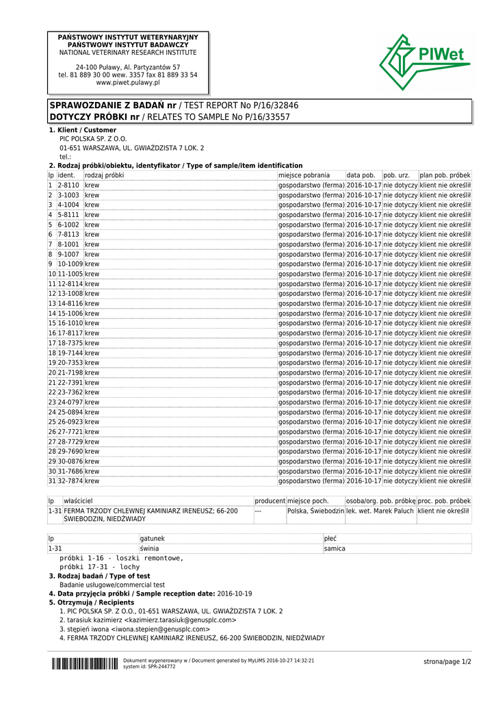 PAŃSTWOWY INSTYTUT WETERYNARYJNY PAŃSTWOWY INSTYTUT BADAWCZY NATIONAL VETERINARY RESEARCH INSTITUTE 24-100 Puławy, Al. Partyzantów 57 tel. 81 889 30 00 wew. 3357 fax 81 889 33 54 www.piwet.pulawy.pl SPRAWOZDANIE Z BADAŃ nr / TEST REPORT No P/16/32846 DOTYCZY PRÓBKI nr / RELATES TO SAMPLE No P/16/33557 1. Klient / Customer PIC POLSKA SP. Z O.O. 01-651 WARSZAWA, UL. GWIAŹDZISTA 7 LOK. 2 tel.: 2. Rodzaj próbki/obiektu, identyfikator / Type of sample/item identification lp ident. rodzaj próbki miejsce pobrania data pob. pob. urz. plan pob. próbek 1 2-8110 krew gospodarstwo (ferma) 2016-10-17 nie dotyczy klient nie określił 2 3-1003 krew gospodarstwo (ferma) 2016-10-17 nie dotyczy klient nie określił 3 4-1004 krew gospodarstwo (ferma) 2016-10-17 nie dotyczy klient nie określił 4 5-8111 krew gospodarstwo (ferma) 2016-10-17 nie dotyczy klient nie określił 5 6-1002 krew gospodarstwo (ferma) 2016-10-17 nie dotyczy klient nie określił 6 7-8113 krew gospodarstwo (ferma) 2016-10-17 nie dotyczy klient nie określił 7 8-1001 krew gospodarstwo (ferma) 2016-10-17 nie dotyczy klient nie określił 8 9-1007 krew gospodarstwo (ferma) 2016-10-17 nie dotyczy klient nie określił 9 10-1009 krew gospodarstwo (ferma) 2016-10-17 nie dotyczy klient nie określił 10 11-1005 krew gospodarstwo (ferma) 2016-10-17 nie dotyczy klient nie określił 11 12-8114 krew gospodarstwo (ferma) 2016-10-17 nie dotyczy klient nie określił 12 13-1008 krew gospodarstwo (ferma) 2016-10-17 nie dotyczy klient nie określił 13 14-8116 krew gospodarstwo (ferma) 2016-10-17 nie dotyczy klient nie określił 14 15-1006 krew gospodarstwo (ferma) 2016-10-17 nie dotyczy klient nie określił 15 16-1010 krew gospodarstwo (ferma) 2016-10-17 nie dotyczy klient nie określił 16 17-8117 krew gospodarstwo (ferma) 2016-10-17 nie dotyczy klient nie określił 17 18-7375 krew gospodarstwo (ferma) 2016-10-17 nie dotyczy klient nie określił 18 19-7144 krew gospodarstwo (ferma) 2016-10-17 nie dotyczy klient nie określił 19 20-7353 krew gospodarstwo (ferma) 2016-10-17 nie dotyczy klient nie określił 20 21-7198 krew gospodarstwo (ferma) 2016-10-17 nie dotyczy klient nie określił 21 22-7391 krew gospodarstwo (ferma) 2016-10-17 nie dotyczy klient nie określił 22 23-7362 krew gospodarstwo (ferma) 2016-10-17 nie dotyczy klient nie określił 23 24-0797 krew gospodarstwo (ferma) 2016-10-17 nie dotyczy klient nie określił 24 25-0894 krew gospodarstwo (ferma) 2016-10-17 nie dotyczy klient nie określił 25 26-0923 krew gospodarstwo (ferma) 2016-10-17 nie dotyczy klient nie określił 26 27-7721 krew gospodarstwo (ferma) 2016-10-17 nie dotyczy klient nie określił 27 28-7729 krew gospodarstwo (ferma) 2016-10-17 nie dotyczy klient nie określił 28 29-7690 krew gospodarstwo (ferma) 2016-10-17 nie dotyczy klient nie określił 29 30-0876 krew gospodarstwo (ferma) 2016-10-17 nie dotyczy klient nie określił 30 31-7686 krew gospodarstwo (ferma) 2016-10-17 nie dotyczy klient nie określił 31 32-7874 krew gospodarstwo (ferma) 2016-10-17 nie dotyczy klient nie określił lp właściciel 1-31 FERMA TRZODY CHLEWNEJ KAMINIARZ IRENEUSZ; 66-200 ŚWIEBODZIN, NIEDŹWIADY producent miejsce poch. osoba/org. pob. próbkę proc. pob. próbek --Polska, Świebodzin lek. wet. Marek Paluch klient nie określił lp gatunek płeć 1-31 świnia samica próbki 1-16 - loszki remontowe, próbki 17-31 - lochy 3. Rodzaj badań / Type of test Badanie usługowe/commercial test 4. Data przyjęcia próbki / Sample reception date: 2016-10-19 5. Otrzymują / Recipients 1. PIC POLSKA SP. Z O.O., 01-651 WARSZAWA, UL. GWIAŹDZISTA 7 LOK. 2 2. tarasiuk kazimierz <[email protected]> 3. stępień iwona <[email protected]> 4. FERMA TRZODY CHLEWNEJ KAMINIARZ IRENEUSZ, 66-200 ŚWIEBODZIN, NIEDŹWIADY Dokument wygenerowany w / Document generated by MyLIMS 2016-10-27 14:32:21 system id: SPR-244772 strona/page 1/2 SPRAWOZDANIE Z BADAŃ nr / TEST REPORT No P/16/32846 DOTYCZY PRÓBKI nr / RELATES TO SAMPLE No P/16/33557 5. LEK.WET. PALUCH MAREK, 66-200 ŚWIEBODZIN, UL. SŁONECZNA 38A/2 6. a/a 6. Wyniki badań / Test results ZAKŁAD CHORÓB ŚWIŃ DEPARTMENT OF SWINE DISEASES Raport nr / Report No: P/16/33557/ZCHS/2898(1-31)/16 system id: 403128 Stan próbki / Condition of the sample przydatne do badań Badania/Tests: - zespół rozrodczo-oddechowy świń (PRRS); Test ELISA do wykrywania przeciwciał dla wirusa PRRS (ZCHS/PB-14 wydanie: 3, 2014-11-25) Wyniki/Results: Raport dotyczy próbki/próbek nr: 1-31 Testem ELISA w badanych próbkach nie stwierdzono obecności przeciwciał dla wirusa PRRS. 2016.10.25 Joanna Jężak Dla zastosowanej metody zidentyfikowano potencjalne źródła wpływające na niepewność wyniku. Laboratorium nie ponosi odpowiedzialności za pobieranie i transport próbek. Dla etapu przedlaboratoryjnego zidentyfikowano potencjalne źródła niepewności. Sporządził / Prepared by: Monika Grzesiak dnia / date: 2016-10-27 Sprawdził / Verified by: dr Katarzyna Podgórska dnia / date: 2016-10-27 Autoryzował / Authorised by: prof. dr hab. Zygmunt Pejsak, Kierownik ZCHS dnia / date: 2016-10-27 7. Sporządził / Prepared by: 8. Sprawdził / Verified by: 9. Zatwierdził kwalifikowanym podpisem elektronicznym/ inż. Kamila Kozak Elżbieta Franas Approved with qualified electronic signature by: dnia / date: 2016-10-27 dnia / date: 2016-10-27 prof. dr hab. Krzysztof Kwiatek 10. Kod weryfikacyjny / Verification code: 26D54-8949B-31E0D-C50C7 Uwaga 1. Wynik dotyczy badanej próbki. / Note 1. The results relate only to the items tested. Uwaga 2. Bez pisemnej zgody PIWet-PIB sprawozdanie z badania nie może być powielane inaczej jak tylko w całości. / Note 2. The test report shall not be reproduced except in full, without written approval of NVRI. Uwaga 3. - stosowane skróty / Note 3. - abbreviations used in the report: ident. - identyfikator / identifier data pob. - data pobrania / date of sampling pob. urz. - pobranie urzędowe / sampling by veterinary author