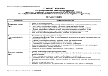 Standardy wymagań z projektu KOMPUTEROWE OPOWIEŚCI STANDARDY WYMAGAŃ z zajęć komputerowych dla klas IV szkoły podstawowej opracowany na podstawie programu nauczania KOMPUTEROWE OPOWIEŚCI oraz podręcznika KOMPUTEROWE OPOWIEŚCI dla starszych klas szkoły podstawowej (271/2010) POSTAWY UCZNIÓW Taksonomia/pkt. Charakterystyka postawy ucznia A Uczestnictwo w działaniu (1 pkt) • • • • • • • Rzadko jest przygotowany do zajęć. Podczas wykonywania ćwiczeń i zadań potrzebuje mobilizowania i pomocy ze strony nauczyciela i innych uczniów. Tylko czasami przestrzega zasad ustalonych w regulaminie szkolnej pracowni komputerowej. Jego praca cechuje się niewielką samodzielnością, wykonane ćwiczenia i zadania są niezbyt estetyczne. Choć słabo zaangażowany w pracę klasy czy grupy, stara się jednak dostosować do powstałych sytuacji. Rzadko wspiera dobrą komunikację w grupie i nie umie okazywać szacunku innym członkom grupy. Bywa, że nie zawsze przestrzega zasad bezpiecznej i higienicznej pracy z komputerem. B Podejmowanie działania (2 pkt.) • • Często zdarza się, że jest nieprzygotowany do zajęć. Podczas wykonywania ćwiczeń i zadań zazwyczaj stara się być samodzielny, jednak brak mu jeszcze staranności i systematyczności w działaniu. Zazwyczaj przestrzega zasad ustalonych w regulaminie szkolnej pracowni komputerowej. Wybiera z dostępnych zbiorów informacji te, które wolno wykorzystać w pracy. Zazwyczaj zaangażowany w pracę klasy, grupy, stara się być aktywny i odpowiedzialny. Czasami zachęca do dobrej komunikacji w grupie, nie zawsze jednak umie okazać szacunek innym członkom grupy. Jeszcze niezbyt efektywnie wykorzystuje czas pracy. Dostosowuje się do obowiązujących zasad bezpiecznej i higienicznej pracy z komputerem. • • • • • • C Nastawienie na działanie (3 pkt.) • • • • • • • Wystąpiły sporadyczne przypadki nieprzygotowania do zajęć. Podczas wykonywania ćwiczeń i zadań jest samodzielny, nie zawsze jednak dość staranny, brak jeszcze czasem spój ności w jego działaniu. Zawsze przestrzega zasad ustalonych w regulaminie szkolnej pracowni komputerowej. Zaangażowany w pracę klasy i grupy, zachęca innych do działania, zazwyczaj odpowiedzialny i aktywny. Często zachęca do dobrej komunikacji w grupie, zwykle odnosi się z szacunkiem do innych, jest skłonny do kompromisu. Racjonalnie wykorzystuje czas pracy. Prawidłowo organizuje stanowisko pracy z komputerem oraz przeprowadza krótką gimnastykę relaksacyjną. Opracowanie: Małgorzata Jakutowicz, © Wyd. CZARNY KRUK, 1 Standardy wymagań z projektu KOMPUTEROWE OPOWIEŚCI D System działań (4 pkt.) • • • • • • • • • • • • • • Zawsze przygotowany do zajęć, często posiada informacje z innych źródeł niż podręcznik. Samodzielnie wykonuje wszystkie ćwiczenia i zadania przewidziane w programie oraz jest operatywny w wykorzystaniu wiadomości i umiejętności do rozwiązywania zadań trudnych, w nowych sytuacjach. Bierze udział w ustalaniu zasad obowiązujących w pracowni komputerowej i jednocześnie dba o ich przestrzeganie przez innych uczniów. Mocno zaangażowany w pracę klasy, grupy, bardzo aktywny i odpowiedzialny, skutecznie motywuje innych uczestników zajęć do pokonywania trudności. Zachęca do dobrej komunikacji w grupie, wyraża uznanie dla cudzych pomysłów i ich autorów. Podczas wykonywania zadań wykazuje się dużą starannością i sumiennością. Dąży do samodoskonalenia i twórczego rozwoju własnych uzdolnień. Dostosowuje stanowisko pracy z komputerem do potrzeb, przestrzegając przy tym wszelkich zasad bezpieczeństwa, hi gieny i organizacji pracy. Przejawia inicjatywę, nauczyciel może na niego zawsze liczyć – jest niezawodny. Wykorzystuje z własnej inicjatywy umiejętności informatyczne na lekcjach innych przedmiotów. Przygotowuje na zajęcia informacje dodatkowe o wysokich walorach edukacyjnych.* Wykonuje prace nadobowiązkowe.* Przejawia dużą aktywność w zajęciach pozalekcyjnych związanych z przedmiotem.* Startuje, a bywa nawet, że odnosi sukcesy, w konkursach informatycznych.* * Działania umożliwiające otrzymanie przez ucznia oceny celującej za postawę. Opracowanie: Małgorzata Jakutowicz, © Wyd. CZARNY KRUK, 2 Standardy wymagań z projektu KOMPUTEROWE OPOWIEŚCI Wymagania edukacyjne w zakresie wiadomości i umiejętności Zakres lekcji Dział lub zagadnienie programowe 1–11 Komputer jako narzędzie pracy Uczeń: Rodzaj wymagań Podstawowe • • • • • Wymienia zasady prawidłowej organizacji pracy z komputerem. Objaśnia zasady prawidłowego uruchamiania i wyłączania komputera. Omawia zastosowanie elementów podstawowego zestawu komputerowego (jednostka centralna, monitor, klawiatura, mysz). Wymienia przykłady urządzeń współpracujących z komputerem. Dokonuje podziału urządzeń współpracujących na urządzenia wejścia i wyjścia. Wymienia przykłady nośników pamięci zewnętrznych komputera (dyskietka, dysk twardy, płyta CDROM, płyta DVD). Nazywa urządzenia do zapisywania i odczytywania danych na nośnikach pamięci. Wyjaśnia pojęcia: licencja, piractwo komputerowe. • Dostosowuje stanowisko pracy do wymagań bezpiecznej i higienicznej pracy. • Obsługuje szkolny sprzęt komputerowy zgodnie z poznanymi zasadami. • Wykorzystuje klawiaturę jako narzędzie do pisania tekstów (pisanie małych i wielkich liter). • Korzysta ze wskazanych zbiorów informacji. • Przestrzega zasad zgodnego z prawem korzystania z oprogramowania. • • • • • • Wyjaśnia różnicę między urządzeniami wejścia i urządzeniami wyjścia współpracującymi z komputerem. Omawia funkcje wybranych urządzeń współpracujących z komputerem (np.: głośników, słuchawek, mikrofonu, drukarki, skanera). Omawia najważniejsze elementy budowy wewnętrznej komputera (procesor, płyta główna, pamięć operacyjna). Wymienia prawa i przyw