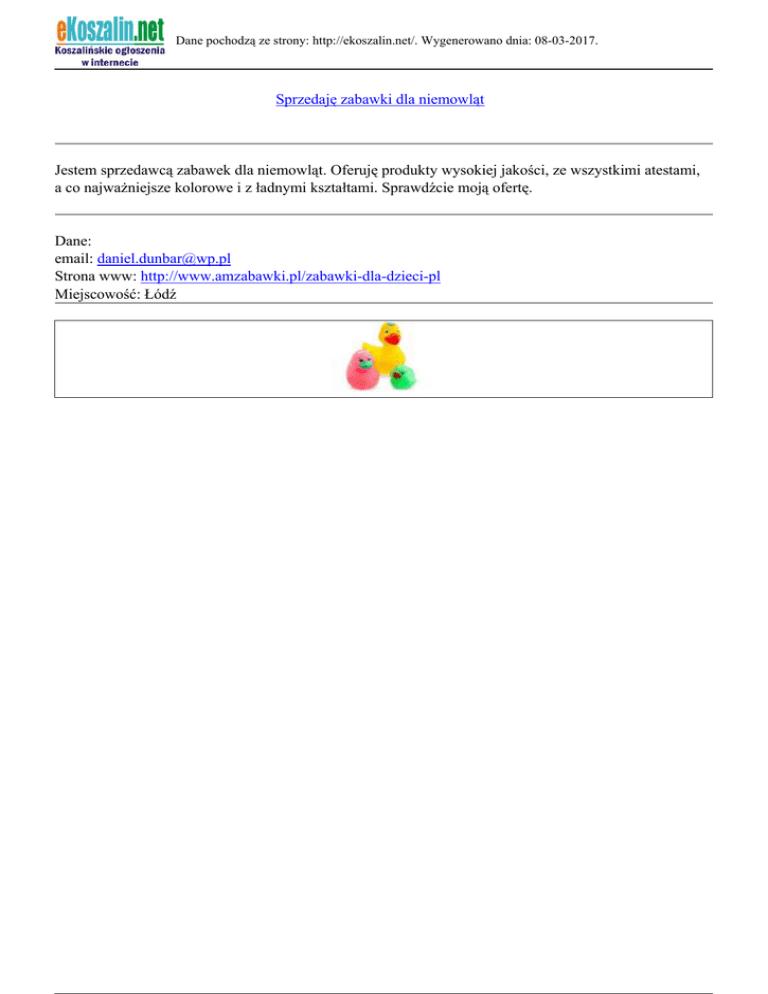 Dane pochodzą ze strony: http://ekoszalin.net/. Wygenerowano dnia: 08-03-2017. Sprzedaję zabawki dla niemowląt Jestem sprzedawcą zabawek dla niemowląt. Oferuję produkty wysokiej jakości, ze wszystkimi atestami, a co najważniejsze kolorowe i z ładnymi kształtami. Sprawdźcie moją ofertę. Dane: email: [email protected] Strona www: http://www.amzabawki.pl/zabawki-dla-dzieci-pl Miejscowość: Łódź