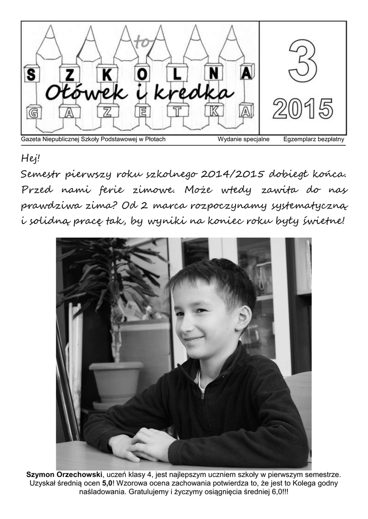 Gazeta Niepublicznej Szkoły Podstawowej w Płotach Wydanie specjalne Egzemplarz bezpłatny Hej! Semestr pierwszy roku szkolnego 2014/2015 dobiegł końca. Przed nami ferie zimowe. Może wtedy zawita do nas prawdziwa zima? Od 2 marca rozpoczynamy systematyczną i solidną pracę tak, by wyniki na koniec roku były świetne! Szymon Orzechowski, uczeń klasy 4, jest najlepszym uczniem szkoły w pierwszym semestrze. Uzyskał średnią ocen 5,0! Wzorowa ocena zachowania potwierdza to, że jest to Kolega godny naśladowania. Gratulujemy i życzymy osiągnięcia średniej 6,0!!! Szkolne wieści Co nas czeka w drugim semestrze? Data 12 lutego 2015 r. 16 lutego - 1 marca 2015 r. 17 marca 2015 r. 20 marca 2015 r. Wydarzenie Szkolny Konkurs Recytatorski Ferie zimowe Spotkania rodziców z wychowawcami i nauczycielami Pierwszy Dzień Wiosny i Szkolna Olimpiada Sportowa „W zdrowym ciele - zdrowy duch” 24 marca 2015 r. 31 marca 2015 r. 1 kwietnia 2015 r. 1 kwietnia 2015 r. 2-7 kwietnia 2015 r. 21 kwietnia 2015 r. 21 kwietnia 2014 r. 30 kwietnia 2014 r. 12 maja 2014 r. 26 maja 2014 r. 1 czerwca 2015 r. 5 czerwca 2015 r. 16 czerwca 2015 r. 26 czerwca 2015 r. 27 czerwca 31 sierpnia 2015 r. Dzień Otwartych Drzwi - warsztaty wielkanocne, występy teatralne Dziecięca Manufaktura Pomysłów VI Sprawdzian szóstoklasistów OKE Dzień wolny od zajęć lekcyjnych w klasach 1-5 Wiosenna przerwa świąteczna Indywidualne spotkania rodziców z wychowawcami i nauczycielami Dziecięca Manufaktura Pomysłów VII Uroczystość z okazji Święta Konstytucji 3. Maja Dziecięca Manufaktura Pomysłów VIII Spotkania rodziców z wychowawcami i nauczycielami Skarby i cuda Dolnego Śląska wycieczka do Kowar i Karpacza Dodatkowy dzień wolny od zajęć lekcyjnych Indywidualne spotkania rodziców z wychowawcami i nauczycielami Uroczyste zakończenie roku szkolnego 2014/2015 Ferie letnie, czyli WAKACJE Redakcja gazetki zaprasza chętnych do pracy nad kolejnym, czwartym numerem, który będzie redagowany po feriach zimowych. Jeżeli masz pomysł, chcesz się wypróbować w roli dziennikarza, masz swój wiersz, opowiadanie lub rysunek, czy fotografię, to zgłoś się do pana Piotra Januszka, osobiście lub mailowo: [email protected] Atlas sukcesów Poza Szymonem Orzechowskim, do grona najlepszych dołączyli: - w klasie 5 - Nikola Kwiatkowska, - w klasie 6 - Maciej Niesyn. Gratulacje!!! Nie samymi ocenami uczeń żyje Okazuje się, że każdy ma wiele innych, bardzo ważnych sukcesów. Oto ich przykłady: Wygrana w turnieju warcabowym z całą moją rodziną. Wygrana z moim tatą w bilarda. „Nabicie” 66 level’a w grze Margonem. Wygrana Blitz SG w Minecrafcie. Wgrana z bratem w piłkę nożną. Wygrana w konkursie organizowanym przez świetlicę wiejską. Uczenie brata gry w cs. Założenie bloga o szkole. Zwycięstwo w turnieju 1 ligi w „FIFA World”. Zostanie kapitanem drużyny sportowej. Pochwała pani Katarzyny Zaremby, za dokładne zrozumienie i przeczytanie lektury. Udział w ligowych zawodach piłki nożnej. Pomoc moim bliskim w rozwiązaniu ich problemów. Poznanie nowych ludzi. Pomoc koledze w założeniu gmail’a. Aktywny występ w jasełkach, po raz pierwszy! Pisanie książki. Piszę ją na komputerze, gdy mam czas lub gdy w domu nie ma internetu. Przez pisanie książki lubię, w ogóle, dużo pisać. Nauczenie brata i kuzynki liczenia do 100 oraz dodawania i odejmowania. Wyróżnienie w konkursie z gry AQW - trzeba było zaprojektować ubranie. Nauczenie się poprawnego wymawiania jednego zdania po japońsku. Bardzo mi na tym zależało, ponieważ uczę się w domu języka japońskiego. Nauczenie mojego brata liczenia do dziesięciu oraz odejmowania i dodawania dziesiątkami. Moim największym osiągnięciem roku 2014 był występ w Jasełkach. Wszyscy chwalili szkołę, że były to najlepsze jasełka, jakie widzieli. Nauczenie się wielu nowych umiejętności na wuefie, np. stania na rękach. Nauczenie się i rozwinięcie swoich umiejętności w zespole tanecznym. Udało mi się nauczyć moją siostrę liczyć. Pomaganie osobom niepełnosprawnym i radość z tego, że wszystko wyszło dobrze. Wstąpienie do szkolnego zespołu tanecznego i rozwinięcie talentu artystycznego (np. malowania). Uzyskiwanie dobrych ocen w szkole, nie chodząc do polskich szkół przez 4 lata. Mam zdolności artystyczne i muzyczne. Pochwała za „plastyczność”. Moim zdaniem jest moja najlepsza ocena z muzyki bo bardzo lubię śpiewać. Przygotowania do konkursu recytatorskiego. Bardzo dobry wynik w biegach, nie jest najlepszy, ale dla mnie wyjątkowo dobry. Występy na scenie, np. w „Kopciuszku”. Pierwsze sukcesy na lekcjach przyrody! Pochwała za nauczenie się miast i województw. Trzecie miejsce w konkursie z j. polskiego. Najlepszy wynik z toru przeszkód na wuefie. Drugie miejsce w czasie przejścia toru przeszkód. Pochwała nauczyciela. Rodzice mnie chwalą za mycie naczyń i opiekę nad siostrą. Pochwała od mamy za samodzielne umycie podłogi i uprzątnięcie klatki chomika. Rodzice chwalą mnie za sprzątanie, mycie naczyń, mycie podłóg, podlewanie kwiatów i odkurzanie. Pochwała pani od matematyki za grzeczne zachowanie i aktywność. Pochwała od mamy za sprzątanie pokoju.