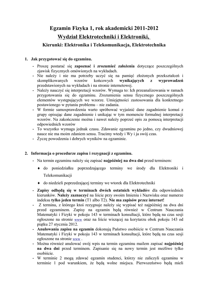 Egzamin Fizyka 1, rok akademicki 2011-2012 Wydział Elektrotechniki i Elektroniki, Kierunki: Elektronika i Telekomunikacja, Elektrotechnika 1. Jak przygotować się do egzaminu. • • • • • • Proszę postarać się zapoznać i zrozumieć założenia dotyczące poszczególnych zjawisk fizycznych omówionych na wykładach. Nie należy i nie ma potrzeby uczyć się na pamięć złożonych przekształceń i skomplikowanych wzorów końcowych wynikających z wyprowadzeń przedstawionych na wykładach i na stronie internetowej. Należy nauczyć się interpretacji wzorów. Wymaga to: Ich przeanalizowania w ramach przygotowania się do egzaminu. Zrozumienia sensu fizycznego poszczególnych elementów występujących we wzorze. Umiejętności zastosowania dla konkretnego postawionego w pytaniu problemu – nie zadania. W formie samosprawdzenia warto spróbować wyjaśnić dane zagadnienie komuś z grupy opisując dane zagadnienie i unikając w tym momencie formalnej interpretacji wzorów. Na zakończenie można i nawet należy poprzeć opis za pomocą interpretacji odpowiednich wzorów To wszystko wymaga jednak czasu. Zdawanie egzaminu po jedno, czy dwudniowej nauce nie ma moim zdaniem sensu. Tracimy wtedy i Wy i ja swój czas. Życzę powodzenia i dobrych wyników na egzaminie. 2. Informacja o procedurze zapisu i rezygnacji z egzaminu. • Na termin egzaminu należy się zapisać najpóźniej na dwa dni przed terminem: ♦ do poniedziałku poprzedzającego terminy we środy dla Elektroniki i Telekomunikacji ♦ do niedzieli poprzedzającej terminy we wtorek dla Elektrotechniki • • • • • Zapisy odbędą się w terminach dwóch ostatnich wykładów dla odpowiednich kierunków. Należy zaznaczyć na liście przy swoim Imieniu i Nazwisku oraz numerze indeksu tylko jeden termin (T1 albo T2). Nie ma zapisów przez internet! Z terminu, z którego ktoś rezygnuje należy się wypisać też najpóźniej na dwa dni przed egzaminem. Zapisy na egzamin będą również w Centrum Nauczania Matematyki i Fizyki w pokoju 143 w terminach konsultacji, które będą na czas sesji ogłoszone na stronie www oraz na liście wiszącej na korytarzu obok pokoju 143 od piątku 27 stycznia 2012. Anulowania zapisu na egzamin dokonują Państwo osobiście w Centrum Nauczania Matematyki i Fizyki w pokoju 143 w terminach konsultacji, które będą na czas sesji ogłoszone na stronie www . Można również anulować swój wpis na termin egzaminu mailem zapisać najpóźniej na dwa dni przed terminem. Zapisanie się na nowy termin jest możliwe tylko osobiście. W terminie 2 mogą zdawać egzamin studenci, którzy nie zaliczyli egzaminu w terminie 1 pod warunkiem, że będą wolne miejsca. Pierwszeństwo będą mieli • • • studenci, którzy nie zdawali w terminie 1. Zapisy na termin poprawkowy będzie możliwy po ogłoszeniu wyników egzaminu. Kolejne terminy dla studentów, którzy nie zaliczą w terminie poprawkowym będą w sesji letniej - czerwiec 2011/2012 oraz poprawkowej –wrzesień 2011/2012. Podczas zapisów na egzamin będą obowiązywały limity ilości studentów. Każdy student będzie miał możliwość pisania egzaminu w sesji oraz w terminie poprawkowym w sesji zimowej 2011/2012 3. Informacja o wymaganiach formalnych. • Na egzamin proszę się nie spóźnić, czyli być przynajmniej 10 minut przed podanym terminem, zostawiając płaszcze w szatni. • Rezygnacja z egzaminu niedostatecznej. • • • • • • • • • • po otrzymaniu pytań oznacza otrzymanie oceny UWAGA: Nie pojawienie się na egzaminie zapisanej na dany termin osoby będzie powodowało przesunięcie jej na termin poprawkowy egzaminu. Proszę przynieść arkusz papieru podaniowego (podwójny arkusz A4) w kratkę. Dla szczególnie skłonnych do rozwlekłych wypowiedzi maksymalnie dwa takie arkusze muszą wystarczyć. Nie piszemy egzaminu na kartkach o innym formacie. Proszę przynieść na egzamin legitymację studencką. Podczas egzaminu powinien on być na ławce obok zdającego. Jest to konieczny warunek do dopuszczenia studenta do egzaminu Proszę przynieść linijkę, ołówek i wyraźnie piszący długopis (czarny lub niebieski). Proszę nie używać koloru czerwonego bo ja go będę używał podczas sprawdzania prac oraz kolorów niewidocznych lub słabo widocznych (żółty itp.). Kalkulator nie będzie potrzebny i nie należy go przynosić. Telefony komórkowe należy na czas egzaminu wyłączyć i schować do torby. W czasie egzaminu na ławce są tylko arkusz papieru, przybory do pisania, linijka i legitymacja studencka, pod ławką nie ma żadnych plików papierów, książek itp. Egzamin jest typu zamkniętego, nie korzystamy z notatek ani z żadnych innych źródeł. Niesamodzielna praca, przeszkadzanie sąsiadom, udostępnianie swojego arkusza sąsiadom, korzystanie z niedozwolonych pomocy skutkuje wynikiem negatywnym egzaminu. Rozmowy między zdającymi od momentu otrzymania pytań do zebrania prac są zabronione i powodują wynik negatywny egzaminu. Proszę nie robić głupich ruchów ponieważ potem jest z tego powodu problem. 4. Informacja o formie egzaminu. • Egzamin ma formę wyłącznie pisemną. • Piszemy na arkuszach formatu A4 lub złożonym na pół formacie A3. Nie używamy innych formatów papieru. Każdy arkusz oraz treści zadań podpisujemy imieniem i nazwiskiem. Po skończeniu egzaminu luźne kartki A4 łączymy zszywaczem albo spinaczem. Egzamin będzie się składał z 8 zagadnień obejmujących cały zakres Piszę to aby zapobiec “obstawianiu” przez zdających czego nie będzie na egzaminie. Po prostu • • wszystko będzie tyle, że po trochu. Pytania będą miały charakter szczegółowy ale dwustopniowy. Będzie trzeba zdefiniować pojęcie, a następnie wykorzystać to do analizy. Podam przykład zadania z poziomu szkoły średniej (nasze będą nieco bardziej złożone): Zadanie 1. Jaki ruch nazywamy ruchem jednostajnym, prostoliniowym? Czy w takim ruchu wekto
