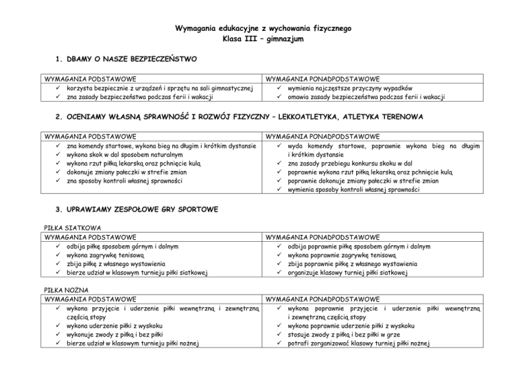 Wymagania edukacyjne z wychowania fizycznego Klasa III – gimnazjum 1. DBAMY O NASZE BEZPIECZEŃSTWO WYMAGANIA PODSTAWOWE korzysta bezpiecznie z urządzeń i sprzętu na sali gimnastycznej zna zasady bezpieczeństwa podczas ferii i wakacji WYMAGANIA PONADPODSTAWOWE wymienia najczęstsze przyczyny wypadków omawia zasady bezpieczeństwa podczas ferii i wakacji 2. OCENIAMY WŁASNĄ SPRAWNOŚĆ I ROZWÓJ FIZYCZNY – LEKKOATLETYKA, ATLETYKA TERENOWA WYMAGANIA PODSTAWOWE zna komendy startowe, wykona bieg na długim i krótkim dystansie wykona skok w dal sposobem naturalnym wykona rzut piłką lekarską oraz pchnięcie kulą dokonuje zmiany pałeczki w strefie zmian zna sposoby kontroli własnej sprawności WYMAGANIA PONADPODSTAWOWE wyda komendy startowe, poprawnie wykona bieg na długim i krótkim dystansie zna zasady przebiegu konkursu skoku w dal poprawnie wykona rzut piłką lekarską oraz pchnięcie kulą poprawnie dokonuje zmiany pałeczki w strefie zmian wymienia sposoby kontroli własnej sprawności 3. UPRAWIAMY ZESPOŁOWE GRY SPORTOWE PIŁKA SIATKOWA WYMAGANIA PODSTAWOWE odbija piłkę sposobem górnym i dolnym wykona zagrywkę tenisową zbija piłkę z własnego wystawienia bierze udział w klasowym turnieju piłki siatkowej WYMAGANIA PONADPODSTAWOWE odbija poprawnie piłkę sposobem górnym i dolnym wykona poprawnie zagrywkę tenisową zbija poprawnie piłkę z własnego wystawienia organizuje klasowy turniej piłki siatkowej PIŁKA NOŻNA WYMAGANIA PODSTAWOWE wykona przyjęcie i uderzenie piłki wewnętrzną i zewnętrzną częścią stopy wykona uderzenie piłki z wyskoku wykonuje zwody z piłką i bez piłki bierze udział w klasowym turnieju piłki nożnej WYMAGANIA PONADPODSTAWOWE wykona poprawnie przyjęcie i uderzenie piłki i zewnętrzną częścią stopy wykona poprawnie uderzenie piłki z wyskoku stosuje zwody z piłką i bez piłki w grze potrafi zorganizować klasowy turniej piłki nożnej wewnętrzną PIŁKA KOSZYKOWA WYMAGANIA PODSTAWOWE wykona podanie i chwyt piłki ze zmianą miejsc wykona rzuty do kosza różnymi sposobami wie na czym polega atak pozycyjny i szybki wykona kozłowanie piłki z wymijaniem przeciwnika wykona zwody z piłką i bez piłki WYMAGANIA PONADPODSTAWOWE wykona poprawnie podanie i chwyt ze zmianą miejsc wykona poprawnie rzuty do kosza różnymi sposobami stosuje atak pozycyjny i szybki w grze wykona poprawnie kozłowanie piłki z wymijaniem przeciwnika stosuje zwody z piłką i bez piłki w grze PIŁKA RĘCZNA WYMAGANIA PODSTAWOWE wykona zwód z piłką i bez piłki wykona rzut na bramkę z różnych pozycji przeprowadza atak szybki wykona chwyt i podanie piłki w biegu WYMAGANIA PONADPODSTAWOWE wykona poprawnie zwód z piłka i bez piłki wykona poprawnie rzut na bramkę z różnych pozycji stosuje poprawnie atak szybki w grze wykona poprawnie chwyt i podanie piłki w biegu 4. WYRABIAMY UMIEJĘTNOŚCI GIMNASTYCZNE WYMAGANIA PODSTAWOWE wykona przewrót w przód i w tył z różnych pozycji wykona wymyk i odmyk na drążku wykona mostek z leżenia tyłem wykona skok zawrotny przez skrzynię wykona piramidę dwójkową WYMAGANIA PONADPODSTAWOWE wykona poprawnie przewrót w przód i w tył z różnych pozycji wykona poprawnie wymyk i odmyk wykona prawidłowo mostek z leżenia tyłem wykona poprawnie skok zawrotny przez skrzynię wykona piramidy dwójkowe i trójkowe 5. DBAMY O PRAWIDŁOWĄ POSTAWĘ CIAŁA WYMAGANIA PODSTAWOWE zna podstawowe ćwiczenia na poszczególne wady postawy WYMAGANIA PONADPODSTAWOWE potrafi zademonstrować ćwiczenia na poszczególne wady postawy 6. HARTUJEMY OGRANIZM WYMAGANIA PODSTAWOWE zna zabawy na śniegu i lodzie WYMAGANIA PONADPODSTAWOWE potrafi przeprowadzić zabawy na śniegu i lodzie 7. KSZTAŁTUJEMY POCZUCIE RYTMU – RYTM, MUZYKA, TANIEC WYMAGANIA PODSTAWOWE wykona improwizację ruchową do wybranej muzyki potrafi zademonstrować podstawowe kroki aerobiku potrafi zademonstrować kroki Poloneza zna ćwiczenia z przyborem: hantle, duża piłka, taśmy WYMAGANIA PONADPODSTAWOWE wykona improwizację ruchową do wybranej muzyki potrafi poprawnie zademonstrować podstawowe kroki aerobiku potrafi zademonstrować poprawnie kroki Poloneza potrafi zademonstrować ćwiczenia z przyborem: hantle, duża piłka, taśmy 8. SPORTY CAŁEGO ŻYCIA WYMAGANIA PODSTAWOWE RINGO stosuje technikę podczas gry KOMETKA stosuje w grze zagrywkę, forhend i bekhend TENIS STOŁOWY wykonuje serwis krótki i długi wykonuje atak i obronę wykonuje zagrywkę rotacyjną UNIHOKEJ stosuje technikę podczas gry stosuje taktykę obrony i ataku w grze WYMAGANIA PONADPODSTAWOWE RINGO stosuje prawidłową technikę podczas gry KOMETKA poprawnie wykonuje w grze zagrywkę, forhend i bekhend TENIS STOŁOWY poprawnie wykonuje serwis krótki i długi wykonuje poprawnie atak i obronę wykonuje poprawnie zagrywkę rotacyjną UNIHOKEJ stosuje prawidłową technikę podczas gry stosuje prawidłową taktykę ataku i obrony w grze 9. ODPOCZYWAMY CZYNNIE WYMAGANIA PODSTAWOWE bierze udział w zabawach rekreacyjnych w terenie uczestniczy we wszelkich formach rekreacyjnych WYMAGANIA PONADPODSTAWOWE organizuje dowolną zabawę rekreacyjną w terenie wymienia korzyści płynące z uprawiania aktywności fizycznej 10. FAKULTET REKREACYJNO – ZDROWOTNY WYMAGANIA PODSTAWOWE RINGO stosuje w grze rzuty i chwyty kółka ringo; potrafi wykonać serwis; KOMETKA prawidłowo trzyma rakietkę; wykonuje zagrywkę różnymi sposobami; TENIS STOŁOWY odbija piłeczkę różnymi sposobami; zna podstawowe zasady gry; ZABAWY I GRY TERENOWE pokonuje terenowy tor przeszkód; PIŁKA PLAŻOWA zna przepisy gry; bierze udział w zawodach klasowych; SIATKONOGA zna przepisy gry; bierze udział w zawodach klasowych; PALANT, KWADRANT zna przepisy gry; bierze udział w zawodach klasowych; DWA OGNIE, CZTERY OGNIE zna przepisy gry; bierze udział w zawodach klasowych; 11. WYMAGANIA PONADPODSTAWOWE RINGO stosuje w grze poprawne rzuty i chwyty kółka ringo; potrafi poprawnie wykonać serwis; KOM