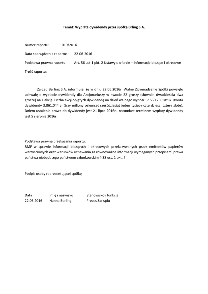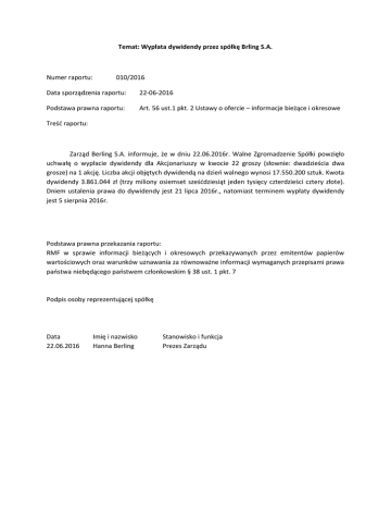 Temat: Wypłata dywidendy przez spółkę Brling S.A. Numer raportu: 010/2016 Data sporządzenia raportu: 22-06-2016 Podstawa prawna raportu: Art. 56 ust.1 pkt. 2 Ustawy o ofercie – informacje bieżące i okresowe Treść raportu: Zarząd Berling S.A. informuje, że w dniu 22.06.2016r. Walne Zgromadzenie Spółki powzięło uchwałę o wypłacie dywidendy dla Akcjonariuszy w kwocie 22 groszy (słownie: dwadzieścia dwa grosze) na 1 akcję. Liczba akcji objętych dywidendą na dzień walnego wynosi 17.550.200 sztuk. Kwota dywidendy 3.861.044 zł (trzy miliony osiemset sześćdziesiąt jeden tysięcy czterdzieści cztery złote). Dniem ustalenia prawa do dywidendy jest 21 lipca 2016r., natomiast terminem wypłaty dywidendy jest 5 sierpnia 2016r. Podstawa prawna przekazania raportu: RMF w sprawie informacji bieżących i okresowych przekazywanych przez emitentów papierów wartościowych oraz warunków uznawania za równoważne informacji wymaganych przepisami prawa państwa niebędącego państwem członkowskim § 38 ust. 1 pkt. 7 Podpis osoby reprezentującej spółkę Data 22.06.2016 Imię i nazwisko Hanna Berling Stanowisko i funkcja Prezes Zarządu