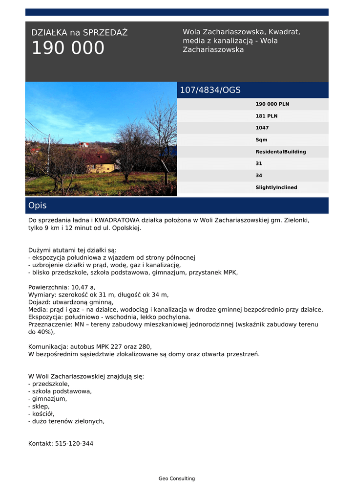 DZIAŁKA na SPRZEDAŻ 190 000 Wola Zachariaszowska, Kwadrat, media z kanalizacją - Wola Zachariaszowska 107/4834/OGS 190 000 PLN 181 PLN 1047 Sqm ResidentalBuilding 31 34 SlightlyInclined Opis Do sprzedania ładna i KWADRATOWA działka położona w Woli Zachariaszowskiej gm. Zielonki, tylko 9 km i 12 minut od ul. Opolskiej. Dużymi atutami tej działki są: - ekspozycja południowa z wjazdem od strony północnej - uzbrojenie działki w prąd, wodę, gaz i kanalizację, - blisko przedszkole, szkoła podstawowa, gimnazjum, przystanek MPK, Powierzchnia: 10,47 a, Wymiary: szerokość ok 31 m, długość ok 34 m, Dojazd: utwardzoną gminną, Media: prąd i gaz – na działce, wodociąg i kanalizacja w drodze gminnej bezpośrednio przy działce, Ekspozycja: południowo - wschodnia, lekko pochylona. Przeznaczenie: MN – tereny zabudowy mieszkaniowej jednorodzinnej (wskaźnik zabudowy terenu do 40%), Komunikacja: autobus MPK 227 oraz 280, W bezpośrednim sąsiedztwie zlokalizowane są domy oraz otwarta przestrzeń. W Woli Zachariaszowskiej znajdują się: - przedszkole, - szkoła podstawowa, - gimnazjum, - sklep, - kościół, - dużo terenów zielonych, Kontakt: 515-120-344 Geo Consulting Najlepsze oferty z lokalnego rynku znajdziesz na: geo-consulting.pl Uwaga: Niniejszy opis oferty sporządzany jest na podstawie oględzin nieruchomości oraz informacji uzyskanych od właściciela, może podlegać aktualizacji i nie stanowi oferty określonej w art. 66 i następnych K.C. Maciej Trela tel. 515-120-344 email: [email protected] Geo Consulting Powered by TCPDF (www.tcpdf.org)