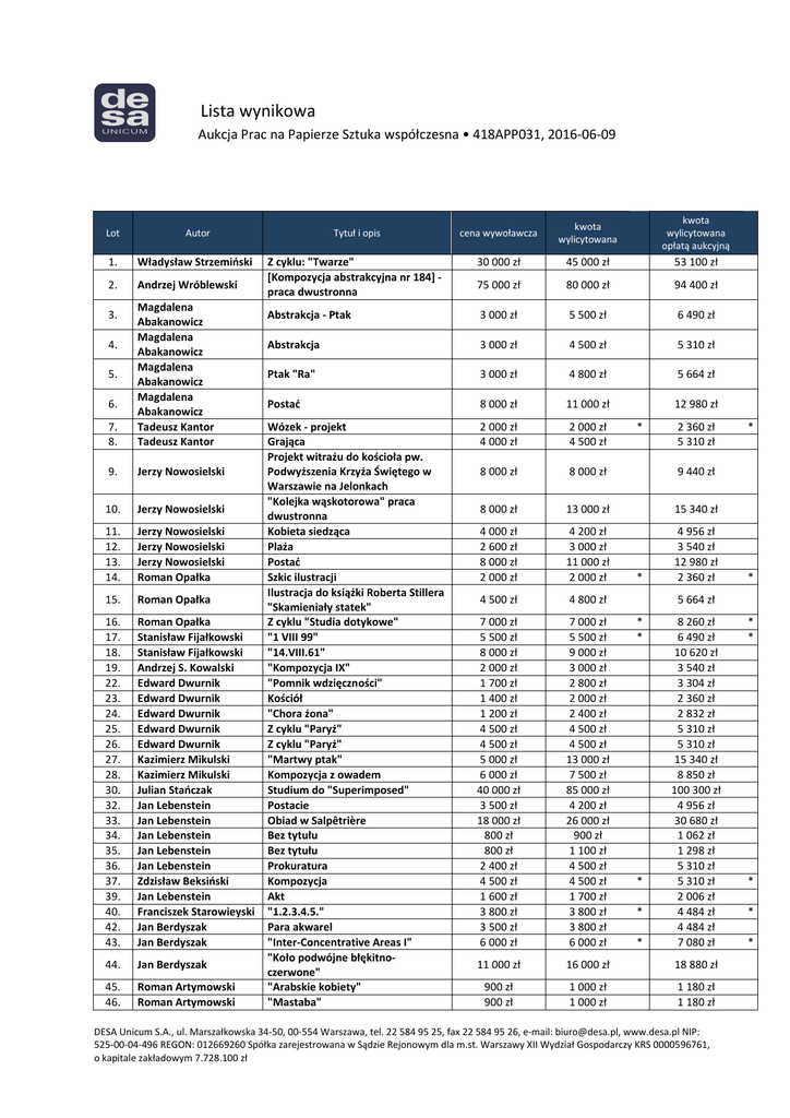 Lista wynikowa Aukcja Prac na Papierze Sztuka współczesna • 418APP031, 2016-06-09 Lot Autor Tytuł i opis cena wywoławcza kwota wylicytowana kwota wylicytowana opłatą aukcyjną 1. Władysław Strzemiński 30 000 zł 45 000 zł 53 100 zł 2. Andrzej Wróblewski Z cyklu: "Twarze" [Kompozycja abstrakcyjna nr 184] praca dwustronna 75 000 zł 80 000 zł 94 400 zł Abstrakcja - Ptak 3 000 zł 5 500 zł 6 490 zł Abstrakcja 3 000 zł 4 500 zł 5 310 zł Ptak "Ra" 3 000 zł 4 800 zł 5 664 zł Postać 8 000 zł 11 000 zł 12 980 zł Wózek - projekt Grająca Projekt witrażu do kościoła pw. Podwyższenia Krzyża Świętego w Warszawie na Jelonkach "Kolejka wąskotorowa" praca dwustronna Kobieta siedząca Plaża Postać Szkic ilustracji Ilustracja do książki Roberta Stillera "Skamieniały statek" Z cyklu "Studia dotykowe" "1 VIII 99" "14.VIII.61" "Kompozycja IX" "Pomnik wdzięczności" Kościół "Chora żona" Z cyklu "Paryż" Z cyklu "Paryż" "Martwy ptak" Kompozycja z owadem Studium do "Superimposed" Postacie Obiad w Salpêtrière Bez tytułu Bez tytułu Prokuratura Kompozycja Akt "1.2.3.4.5." Para akwarel "Inter-Concentrative Areas I" "Koło podwójne błękitnoczerwone" "Arabskie kobiety" "Mastaba" 2 000 zł 4 000 zł 2 000 zł 4 500 zł 8 000 zł 8 000 zł 9 440 zł 8 000 zł 13 000 zł 15 340 zł 4 000 zł 2 600 zł 8 000 zł 2 000 zł 4 200 zł 3 000 zł 11 000 zł 2 000 zł 4 956 zł 3 540 zł 12 980 zł 2 360 zł 4 500 zł 4 800 zł 7 000 zł 5 500 zł 8 000 zł 2 000 zł 1 700 zł 1 400 zł 1 200 zł 4 500 zł 4 500 zł 5 000 zł 6 000 zł 40 000 zł 3 500 zł 18 000 zł 800 zł 800 zł 2 400 zł 4 500 zł 1 600 zł 3 800 zł 3 500 zł 6 000 zł 7 000 zł 5 500 zł 9 000 zł 3 000 zł 2 800 zł 2 000 zł 2 400 zł 4 500 zł 4 500 zł 13 000 zł 7 500 zł 85 000 zł 4 200 zł 26 000 zł 900 zł 1 100 zł 4 500 zł 4 500 zł 1 700 zł 3 800 zł 3 800 zł 6 000 zł 11 000 zł 16 000 zł 18 880 zł 900 zł 900 zł 1 000 zł 1 000 zł 1 180 zł 1 180 zł 7. 8. Magdalena Abakanowicz Magdalena Abakanowicz Magdalena Abakanowicz Magdalena Abakanowicz Tadeusz Kantor Tadeusz Kantor 9. Jerzy Nowosielski 10. Jerzy Nowosielski 11. 12. 13. 14. Jerzy Nowosielski Jerzy Nowosielski Jerzy Nowosielski Roman Opałka 15. Roman Opałka 16. 17. 18. 19. 22. 23. 24. 25. 26. 27. 28. 30. 32. 33. 34. 35. 36. 37. 39. 40. 42. 43. Roman Opałka Stanisław Fijałkowski Stanisław Fijałkowski Andrzej S. Kowalski Edward Dwurnik Edward Dwurnik Edward Dwurnik Edward Dwurnik Edward Dwurnik Kazimierz Mikulski Kazimierz Mikulski Julian Stańczak Jan Lebenstein Jan Lebenstein Jan Lebenstein Jan Lebenstein Jan Lebenstein Zdzisław Beksiński Jan Lebenstein Franciszek Starowieyski Jan Berdyszak Jan Berdyszak 44. Jan Berdyszak 45. 46. Roman Artymowski Roman Artymowski 3. 4. 5. 6. * * 2 360 zł 5 310 zł * * 5 664 zł * * * * * 8 260 zł 6 490 zł 10 620 zł 3 540 zł 3 304 zł 2 360 zł 2 832 zł 5 310 zł 5 310 zł 15 340 zł 8 850 zł 100 300 zł 4 956 zł 30 680 zł 1 062 zł 1 298 zł 5 310 zł 5 310 zł 2 006 zł 4 484 zł 4 484 zł 7 080 zł DESA Unicum S.A., ul. Marszałkowska 34-50, 00-554 Warszawa, tel. 22 584 95 25, fax 22 584 95 26, e-mail: [email protected], www.desa.pl NIP: 525-00-04-496 REGON: 012669260 Spółka zarejestrowana w Sądzie Rejonowym dla m.st. Warszawy XII Wydział Gospodarczy KRS 0000596761, o kapitale zakładowym 7.728.100 zł * * * * * Lista wynikowa Aukcja Prac na Papierze Sztuka współczesna • 418APP031, 2016-06-09 47. 48. 49. Stefan Gierowski Tomasz Tatarczyk Franciszek Starowieyski 50. Franciszek Starowieyski 53. 54. 60. 61. 62. 66. 67. 69. 73. 74. 75. 78. 79. 80. 81. 86. Rajmund Ziemski Erna Rosenstein Stasys Eidrigevicius Stasys Eidrigevicius Stasys Eidrigevicius Teresa Rudowicz Tomasz Ciecierski Jan Tarasin Andrzej Nowacki Andrzej Nowacki Ryszard Waśko Ryszard Waśko Jan Dobkowski Jan Dobkowski Jan Dobkowski Jan Sawka 88. Waldemar Świerzy 90. Jan Lenica 93. 96. 97. 99. 101. 102. 103. Monika Piwowarska Andrzej Czeczot Andrzej Czeczot Henryk Płóciennik Józef Wilkoń Jerzy Stajuda Jacek Sienicki Kompozycja Bez tytułu Bez tytułu "Zwierz rewolucji zróżowiał i sparszywiał" "14.XI.76." "Noc" Bez tytułu "Skowronek" Postać Madame Kompozycja "Przedmioty policzone" "19 04 98", projekt reliefu "13.03.98", projekt reliefu "Fotografia hipotetyczna Nr 3/128" "Object E" Z cyklu "Universum" Bez tytułu Z cyklu "Uniwersum CIII" "A nightmare # 11" Ilustracje do "Klementyny" Vercorsa Projekt okładki do kalendarza na rok 2000 Odpoczywający mężczyzna "Oberek" "Ostatni Mazur" Akt Pan Tadeusz "Kompozycja 1311" Pejzaż 9 000 zł 20 000 zł 2 500 zł 9 000 zł 28 000 zł 2 500 zł * 10 620 zł 33 040 zł 2 950 zł 1 000 zł 3 200 zł 4 000 zł 1 500 zł 2 000 zł 1 800 zł 18 000 zł 3 000 zł 3 000 zł 8 000 zł 2 200 zł 2 200 zł 1 500 zł 1 100 zł 600 zł 2 000 zł 4 000 zł 3 000 zł 4 000 zł 1 900 zł 3 500 zł 2 000 zł 18 000 zł 3 200 zł 4 500 zł 9 500 zł 2 600 zł 2 400 zł 4 800 zł 1 100 zł 800 zł 3 800 zł 4 200 zł 3 200 zł 1 800 zł 2 400 zł 2 832 zł 1 000 zł 2 000 zł 2 360 zł 1 300 zł 1 800 zł 1 800 zł 800 zł 2 000 zł 1 800 zł 3 000 zł 1 300 zł 2 600 zł 3 200 zł 800 zł 6 000 zł 2 000 zł 3 000 zł 559 500 zł 1 534 zł 3 068 zł 3 776 zł 944 zł 7 080 zł 2 360 zł 3 540 zł 660 210 zł * 3 776 zł * * * * 4 720 zł 2 242 zł 4 130 zł 2 360 zł 21 240 zł 3 776 zł 5 310 zł 11 210 zł 3 068 zł 2 832 zł 5 664 zł 1 298 zł 944 zł 4 484 zł 4 956 zł 3 776 zł * transakcja warunkowa DESA Unicum S.A., ul. Marszałkowska 34-50, 00-554 Warszawa, tel. 22 584 95 25, fax 22 584 95 26, e-mail: [email protected], www.desa.pl NIP: 525-00-04-496 REGON: 012669260 Spółka zarejestrowana w Sądzie Rejonowym dla m.st. Warszawy XII Wydział Gospodarczy KRS 0000596761, o kapitale zakładowym 7.728.100 zł * * * *