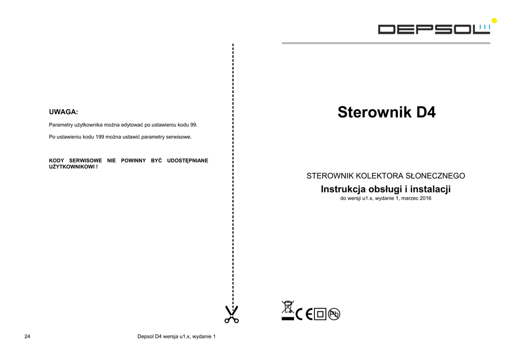 Sterownik D4 UWAGA: Parametry użytkownika można edytować po ustawieniu kodu 99. Po ustawieniu kodu 199 można ustawić parametry serwisowe. KODY SERWISOWE NIE UŻYTKOWNIKOWI ! POWINNY BYĆ UDOSTĘPNIANE STEROWNIK KOLEKTORA SŁONECZNEGO Instrukcja obsługi i instalacji do wersji u1.x, wydanie 1, marzec 2016 24 Depsol D4 wersja u1.x, wydanie 1 Pb Zasady bezpieczeństwa • • • • • • • • • Przed zainstalowaniem regulatora należy starannie przeczytać instrukcję obsługi, oraz zapoznać się z warunkami gwarancji. Nieprawidłowe zamontowanie, używanie i obsługa regulatora powoduje utratę gwarancji. Wszelkie prace przyłączeniowe mogą się odbywać tylko przy odłączonym napięciu zasilania. w pozostałych przy odciętym napięciu zasilania i upewnieniu się, że na zaciskach regulatora nie występuje napięcie niebezpieczne. Prace przyłączeniowe i montaż powinny być wykonane wyłącznie przez osoby z odpowiednimi kwalifikacjami i uprawnieniami, zgodnie z obowiązującymi przepisami i normami. Nie wolno instalować i użytkować regulatora z uszkodzoną mechanicznie obudową. Występuje ryzyko porażenia prądem. Instalacja, w której pracuje regulator powinna być zabezpieczona bezpiecznikami odpowiednimi do stosowanych obciążeń Przed pierwszym uruchomieniem sprawdzić czy podłączenia są zgodne z instrukcją obsługi, oraz czy napięcie zasilające regulator spełnia wszelkie wymogi. Wszelkich napraw regulatorów może dokonywać wyłącznie serwis producenta. Dokonywanie naprawy regulatora przez osobę nieupoważnioną powoduje utratę gwarancji. Regulator nie jest elementem bezpieczeństwa! W układach, w których zachodzi ryzyko wystąpienia szkód w wyniku awarii automatyki, trzeba stosować dodatkowe zabezpieczenia posiadające odpowiednie atesty. W układach, które nie mogą być wyłączone, układ sterowania musi być skonstruowany w sposób umożliwiający jego pracę bez regulatora. Pozbywanie się urządzeń elektrycznych i elektronicznych dotyczy tylko gospodarstw domowych Symbol kosza, który jest umieszczany na wyrobach firmy lub dołączanych instrukcjach obsługi, informuje, że nie wolno wyrzucać wraz z innymi odpadami zużytych lub niesprawnych urządzeń elektrycznych i elektronicznych. Urządzenie tak oznaczone a przeznaczone do utylizacji, powtórnego użycia lub odzysku podzespołów, należy przekazać do wyspecjalizowanego punktu zbiórki, gdzie będzie bezpłatnie przyjęte. Produkt można przekazać lokalnemu dystrybutorowi przy zakupie nowego urządzenia. Prawidłowo przeprowadzona operacja utylizacji pozwala uniknąć negatywnego wpływu na środowisko naturalne lub zdrowie człowieka. Nieprawidłowe składowanie lub utylizacja zagrożona jest karami, przewidzianymi odpowiednimi przepisami. 2 Depsol D4 wersja u1.x, wydanie 1 Instrukcja Depsol D4 wersja u1.x, wydanie 1 23 Zawartość opakowania: Wstęp 1. Regulator Depsol D4 - 1 szt. 2. Czujnik T1 kolektora T1301 - 1 szt. 3. Czujniki zasobnika T1001 - 1 szt. 4. Kołki montażowe - 2 szt. 5. Komplet zaślepek i uchwytów do kabli. 6. Instrukcja obsługi. 7. Karta gwarancyjna. UWAGA: Czujniki T3 oraz T4 są opcjonalne i nie wchodzą w skład zestawu. Regulator Depsol D4 jest przezn aczon y do sterowan ia pracą układu solarn ego. Podstawowe cechy regulatora: 1. Specjalizowany wyświetlacz graficzny - zastosowanie wyświetlacza specjalizowanego w znaczny sposób ułatwia obsługę regulatora. Pozwala w prosty sposób ustalić, który schemat pracy jest realizowany oraz jakie są parametry układu. 2. Licznik ciepła – regulator oblicza ilość ciepła pozyskanego z kolektora słonecznego. 3. Sterowanie pompą w sposób płynny - regulator steruje płynnie pompą ładującą zasobnik, co pozwala na ekonomiczne wykorzystanie energii solarnej (energia może być odzyskiwana z kolektora słonecznego nawet przy niesprzyjających warunkach pogodowych). 4. Zrzut ciepła poprzez kolektor – regulator można łatwo wprowadzić w specjalny Tryb urlopowy zabezpieczający instalację przed przegrzaniem jeśli ciepła woda nie będzie wykorzystywana. 5. Funkcja chłodzenia rewersyjnego – stabilizuje temperaturę zasobnika pozbywając się nadmiaru ciepła przez kolektor. 6. Funkcja okresowej sterylizacji zasobnika CWU – raz na tydzień temperatura zadana zasobnika CWU zostaje podniesiona do ustawionego poziomu aby usunąć mogące pojawić się w zasobniku bakterie z rodzaju Legionella. 7. Funkcja ochrony kolektora przed zamarzaniem – regulator przeciwdziała zamarzaniu płynu solarnego uruchamiając pompę kiedy temperatura kolektora spadnie poniżej ustalonego poziomu. 8. Funkcja ochrony zasobnika przed zamarzaniem – regulator załącza podłączoną grzałkę lub inne źródło ciepła gdy temperatura zasobnika spadnie poniżej 4°C 9. Funkcje zabezpieczające - regulator jest wyposażony w algorytmy chroniące kolektor i zasobnik. Daje to możliwość zabezpieczenia układu przed przegrzaniem kolektora (a co za tym idzie zatrzymania ładowania zasobnika) lub przegrzaniem zasobnika. 10. Sterowanie rozbudowanymi układami - dzięki dodatkowym wyjściom oraz po podłączeniu dodatkowych czujników, regulator może sterować rozbudowanymi układami. 11. Interfejs cyfrowy – umożliwia monitorowanie pracy regulatora. Lista realizowanych schematów Schemat 1 - ładowanie zasobnika z kolektora słonecznego. W tym schemacie regulator pracuje z jednym czujnikiem zasobnika. 22 Depsol D4 wersja u1.x, wydanie 1 Instrukcja Depsol D4 wersja u1.x, wydanie 1 3 Schemat 2 - ładowanie zasobnika z kolektora słonecznego i dogrzewanie zasobnika grzałką. Charakterystyka czujników Temperatura Rezystancja [°C] Schemat 3 - ładowanie zasobnika z kolektora słonecznego i zrzut nadmiaru ciepła. Temperatura Rezystancja [Ω] [°C] [Ω] -40 842,1 30 1116,7 -30 881,7 40 1155,4 -20 921,3 50 1194,0 -10 960,7 60 1232,4 0 1000,0 70 1270,7 10 1039,0 80 1308,9 20 1077,9 90 1347,0 Tabela 1: Przykładowe war