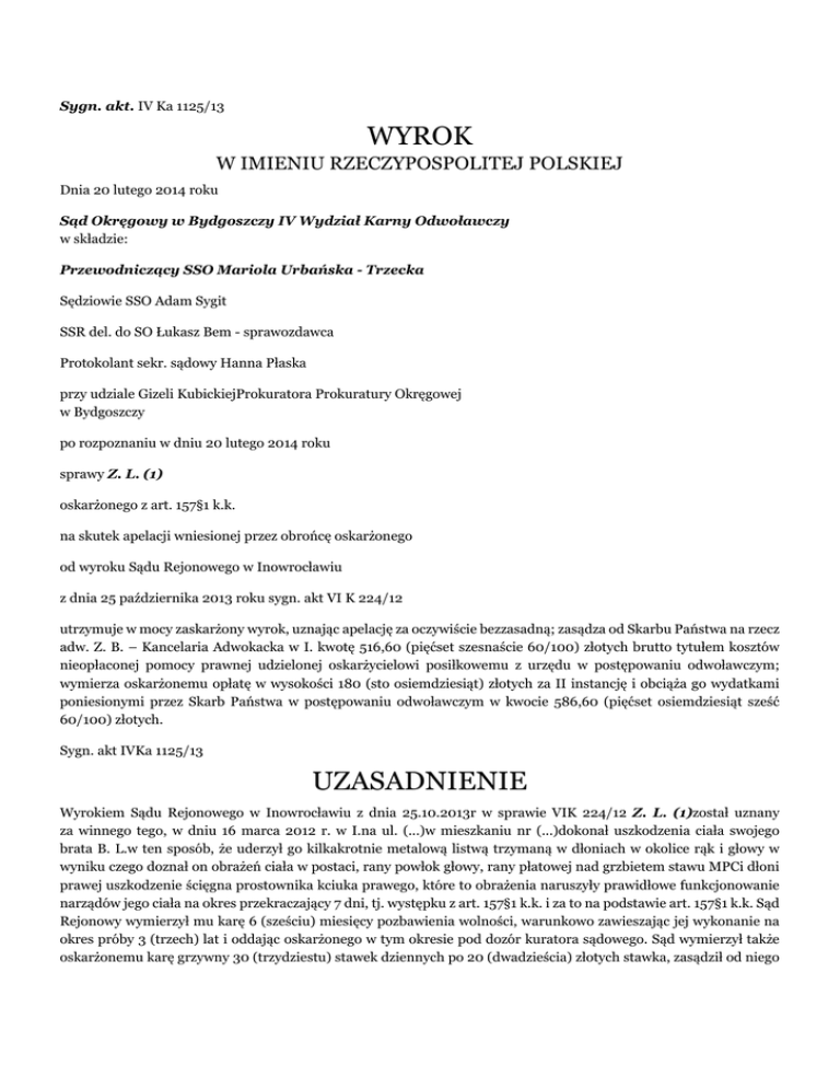Sygn. akt. IV Ka 1125/13 WYROK W IMIENIU RZECZYPOSPOLITEJ POLSKIEJ Dnia 20 lutego 2014 roku Sąd Okręgowy w Bydgoszczy IV Wydział Karny Odwoławczy w składzie: Przewodniczący SSO Mariola Urbańska - Trzecka Sędziowie SSO Adam Sygit SSR del. do SO Łukasz Bem - sprawozdawca Protokolant sekr. sądowy Hanna Płaska przy udziale Gizeli KubickiejProkuratora Prokuratury Okręgowej w Bydgoszczy po rozpoznaniu w dniu 20 lutego 2014 roku sprawy Z. L. (1) oskarżonego z art. 157§1 k.k. na skutek apelacji wniesionej przez obrońcę oskarżonego od wyroku Sądu Rejonowego w Inowrocławiu z dnia 25 października 2013 roku sygn. akt VI K 224/12 utrzymuje w mocy zaskarżony wyrok, uznając apelację za oczywiście bezzasadną; zasądza od Skarbu Państwa na rzecz adw. Z. B. – Kancelaria Adwokacka w I. kwotę 516,60 (pięćset szesnaście 60/100) złotych brutto tytułem kosztów nieopłaconej pomocy prawnej udzielonej oskarżycielowi posiłkowemu z urzędu w postępowaniu odwoławczym; wymierza oskarżonemu opłatę w wysokości 180 (sto osiemdziesiąt) złotych za II instancję i obciąża go wydatkami poniesionymi przez Skarb Państwa w postępowaniu odwoławczym w kwocie 586,60 (pięćset osiemdziesiąt sześć 60/100) złotych. Sygn. akt IVKa 1125/13 UZASADNIENIE Wyrokiem Sądu Rejonowego w Inowrocławiu z dnia 25.10.2013r w sprawie VIK 224/12 Z. L. (1)został uznany za winnego tego, w dniu 16 marca 2012 r. w I.na ul. (...)w mieszkaniu nr (...)dokonał uszkodzenia ciała swojego brata B. L.w ten sposób, że uderzył go kilkakrotnie metalową listwą trzymaną w dłoniach w okolice rąk i głowy w wyniku czego doznał on obrażeń ciała w postaci, rany powłok głowy, rany płatowej nad grzbietem stawu MPCi dłoni prawej uszkodzenie ścięgna prostownika kciuka prawego, które to obrażenia naruszyły prawidłowe funkcjonowanie narządów jego ciała na okres przekraczający 7 dni, tj. występku z art. 157§1 k.k. i za to na podstawie art. 157§1 k.k. Sąd Rejonowy wymierzył mu karę 6 (sześciu) miesięcy pozbawienia wolności, warunkowo zawieszając jej wykonanie na okres próby 3 (trzech) lat i oddając oskarżonego w tym okresie pod dozór kuratora sądowego. Sąd wymierzył także oskarżonemu karę grzywny 30 (trzydziestu) stawek dziennych po 20 (dwadzieścia) złotych stawka, zasądził od niego na rzecz pokrzywdzonego nawiązkę w kwocie 2000 (dwóch tysięcy) złotych w trybie art. 46§2 k.k., obciążył go opłatą w kwocie 180 (stu osiemdziesięciu) złotych i zwolnił od pozostałych kosztów sądowych. Powyższy wyrok został zaskarżony w całości apelacją wywiedzioną przez obrońcę oskarżonego, który wyrokowi temu zarzucił obrazę art. 41§1 k.p.k., mogącą mieć wpływ na treść orzeczenia, polegającą na odmowie wyłączenia od rozpoznawania sprawy sędziego Pawła Manickiego mimo tego, że sędzia ten rozpoznając sprawę VIKp 288/12, która zdaniem skarżącego była ściśle i nierozerwalnie związana z niniejszą sprawą, wyraził już pogląd co do przebiegu zdarzenia i dokonał określonej oceny dowodów, wobec czego trudno aby w niniejszym postępowaniu ocenił te same dowody odmiennie. Apelujący zarzucił także błąd w ustaleniach faktycznych przyjętych za podstawę orzeczenia, a mający wpływ na jego treść, polegający na dowolnym uznaniu, że oskarżony dopuścił się zarzuconego mu czynu, podczas gdy prawidłowa analiza zebranych dowodów, a w szczególności wyjaśnień oskarżonego w powiązaniu z zeznaniami A. L., Z. L. (2), A. Ś. (1) i opinią sądowo-lekarską o obrażeniach oskarżonego, winna była prowadzić do wniosku, iż działał w warunkach obrony koniecznej. W konkluzji obrońca oskarżonego wniósł o uchylenie wyroku i przekazanie sprawy do ponownego rozpoznania sądowi I instancji, ewentualnie o uniewinnienie oskarżonego. Sąd Okręgowy zważył, co następuje: W pierwszej kolejności Sąd pragnie odnieść się do zarzutu związanego z obrazą przepisu art. 41§1 k.p.k., jako najdalej idącego. Zgodnie z jego treścią sędzia ulega wyłączeniu, jeżeli istnieje okoliczność tego rodzaju, że mogłaby wywołać uzasadnioną wątpliwość co do jego bezstronności w danej sprawie. Z taką sytuacją mamy do czynienia m.in. wówczas, gdy sędzia zajął już stanowisko w poprzednio rozpoznawanej sprawie, mającej ścisły i nierozerwalny związek ze sprawą aktualnie rozpoznawaną (tak słusznie Sąd Najwyższy w wyroku z dnia 02.06.2011r w sprawie IIIKK 328/10, Lex nr 860818). O takim związku można mówić, gdy zakres przedmiotowy i podmiotowy dwóch różnych postępowań jest tego samego rodzaju, a także kiedy sędzia już w jednym postępowaniu dokonał ustalenia tych samych okoliczności na podstawie tych samych dowodów, co w kolejnym postępowaniu. W szczególności dotyczy to takiej sytuacji procesowej, kiedy kilku oskarżonym, działającym wspólnie i w porozumieniu, postawiono ten sam zarzut, a następnie materiały dotyczące niektórych z nich wyłączono do odrębnego postępowania. W takiej bowiem sytuacji procesowej oczywistym jest, że te same dowody będą dotyczyły wszystkich oskarżonych w związku z tym samym zdarzeniem faktycznym. Toteż orzekanie przez tego samego sędziego w obydwu sprawach, które są przecież ściśle i nierozerwalnie związane ze sobą, prowadziłoby do wywołania zewnętrznie uzasadnionych wątpliwości co do jego bezstronności. Trudno bowiem zakładać, że raz oceniony materiał dowodowy sędzia ten w innym postępowaniu oceniłby odmiennie. Takiego właśnie stanu faktycznego dotyczyły obydwa przywołane w uzasadnieniu apelacji wyroki (SN z dn. 18.03.2009r w sprawie IVKK 380/08 i SN z dn. 02.06.2011r w sprawie IIIKK 328/10), bowiem w obydwu przypadkach oskarżonym zarzucono popełnienie tego samego przestępstwa: w jednym wypadku wspólnie i w porozumieniu, a w drugim wypadku jeden oskarżony był sprawcą głównym, a drugi podżegaczem do czynu sprawcy głównego. Tym