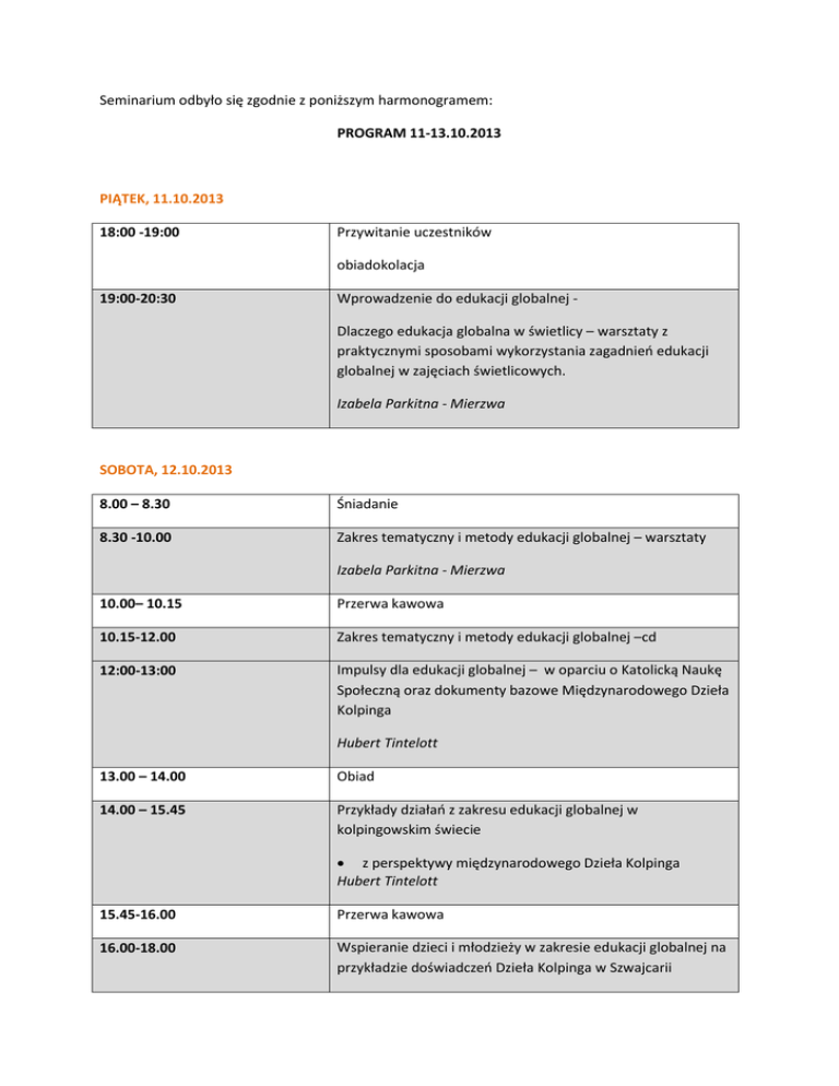Seminarium odbyło się zgodnie z poniższym harmonogramem: PROGRAM 11-13.10.2013 PIĄTEK, 11.10.2013 18:00 -19:00 Przywitanie uczestników obiadokolacja 19:00-20:30 Wprowadzenie do edukacji globalnej Dlaczego edukacja globalna w świetlicy – warsztaty z praktycznymi sposobami wykorzystania zagadnień edukacji globalnej w zajęciach świetlicowych. Izabela Parkitna - Mierzwa SOBOTA, 12.10.2013 8.00 – 8.30 Śniadanie 8.30 -10.00 Zakres tematyczny i metody edukacji globalnej – warsztaty Izabela Parkitna - Mierzwa 10.00– 10.15 Przerwa kawowa 10.15-12.00 Zakres tematyczny i metody edukacji globalnej –cd 12:00-13:00 Impulsy dla edukacji globalnej – w oparciu o Katolicką Naukę Społeczną oraz dokumenty bazowe Międzynarodowego Dzieła Kolpinga Hubert Tintelott 13.00 – 14.00 Obiad 14.00 – 15.45 Przykłady działań z zakresu edukacji globalnej w kolpingowskim świecie z perspektywy międzynarodowego Dzieła Kolpinga Hubert Tintelott 15.45-16.00 Przerwa kawowa 16.00-18.00 Wspieranie dzieci i młodzieży w zakresie edukacji globalnej na przykładzie doświadczeń Dzieła Kolpinga w Szwajcarii Hildegard Holenstein i Ruth Rumo 18.00-18.30 Kolacja NIEDZIELA, 13.10.2013 8.00 – 8.30 Śniadanie 8.30 -10.00 Jak przekazywać wiedzę młodym ludziom, by wzbudzić ich ciekawość? (wykład) Sylwia Gajownik 10.00– 10.15 Przerwa kawowa 10.15-12.00 Wybrana metoda pracy z uczniami – projekty edukacyjne Gdzie szukać i jak przekazywać wiedzę młodym ludziom, by wzbudzić ich ciekawość? (wykład) Sylwia Gajownik Podsumowanie Izabela Parkitna – Mierzwa 12:15 Przedstawienie projektu 13.15-14.00 Obiad Uczestnikami byli liderzy/opiekunie świetlic prowadzonych przez 7 stowarzyszeń z całej Polski tj. z Chełmka, Kłodawy Gdańskiej, Łeby, Jarosławia, Koronowa, Niewieścina i Oświęcimia. Każdą świetlicę, poza Oświęcimiem, z której było 3 przedstawicieli, reprezentowały 2 osoby aktywne w ramach lokalnej działalności świetlicowej. Osoby uczestniczące w seminarium to przede wszystkim wolontariusze, ale również i pracownicy świetlic. Jako zagraniczni prelegenci wystąpili: przedstawiciel SEK e.V. (Sozial- und Entwicklungshilfe des Kolpingwerkes e. V. – Pomoc Społeczno-Rozwojowa Dzieła Kolpinga) - Hubert Tintelott. Uzasadnienie wyboru prelegenta: W latach 1973-2012 sekretarz generalny Międzynarodowego Dzieła Kolpinga, rzecznik ds. europejskich z ramienia Komitetu Centralnego Katolików Niemieckich, członek Niemieckiej Komisji Justitia et Pax, doradca kościelnego dzieła pomocy Adveniat, w latach 1993-2013 członek Komitetu Wykonawczego Renovabis, w latach 1997-2012 przewodniczący Grupy Roboczej ds. Współpracy Rozwojowej, szef grupy dyskusyjnej Justitia et Pax i związków zawodowych, odznaczony Orderem Zasługi Republiki Federalnej Niemiec (Krzyż Zasługi na Wstędze), odznaczony papieskim Orderem św. Grzegorza Wielkiego. Przedstawiciele Kolping Schweiz (Kolping Szwajcaria) Hildegard Holenstein - naukowiec w zakresie pielęgniarstwa, obecnie na emeryturze, uzyskała tytuł doktora pielęgniarstwa, wiele lat pracowała w Szwajcarskim Czerwonym Krzyżu m.in. jako ekspert w zakresie szkolnictwa zawodowego. Od 35 lat działa w Rodzinie Kolpinga w Bern, od roku 1984 jest jej przewodniczącą, zaangażowana w różnych dziedzinach w działania kościelne, społeczne i wolontarystyczne, w których kieruje się duchem bł. Adolpha Kolpinga. Ruth Rumo – wykwalifikowana pedagożka, prowadzaca od wielu lat zajęcia dla dzieci m.in. z zakresu edukacji globalnej, religii Ze strony polskiej do współpracy zaproszono prelegentów, pracowników Fundacji Kultury Chrześcijańskiej Izabelę Parkitną -Mierzwa oraz Sylwię Gajownik. Izabela Parkitna – Mierzwa – ukończyła Uniwersytet Jagielloński, studia na wydziale Instytutu Etnologii i Antropologii Kulturowej oraz studia podyplomowe z zakresu Ekonomii Społecznej. Od roku 2010 zaangażowana w działania Fundacji Znak, a od 2012 r. trener edukacji globalnej, w tym: przeprowadzenie cyklu warsztatów (80 godz. szkoleniowych, we współtrenerstwie), w ramach projektu „Uchodźca – mój sąsiad”, cyklu warsztatów dla nauczycieli z zakresu edukacji międzykulturowej, przeciwdziałania dyskryminacji (6 godz.), cyklu warsztatów dla uczniów gimnazjów i szkół ponadgimnazjalnych z zakresu edukacji globalnej (82 godz. we współtrenerstwie), cyklu warsztatów dla nauczycieli (10 godzin) dot. edukacji globalnej, w ramach projektu „Globalnie – Odpowiedzialnie”, cyklu warsztatów dla młodzieży (64 godziny szkoleniowe) dot. idei Martina Luthera Kinga i praw człowieka, w ramach projektu „Takie mam marzenie: zmienię świat wokół siebie”. Sylwia Gajownik - antropolog kultury, absolwentka Uniwersytetu Jagiellońskiego w Krakowie, zatrudniona w Fundacji Znak od 2002 roku. Od kwietnia 2010 roku członek zarządu Fundacji Kultury Chrześcijańskiej Znak. Autorka i koordynatorka większości projektów edukacyjnych z zakresu wielokulturowości, edukacji globalnej, edukacji obywatelskiej i projektów poświęconych integracji uchodźców i imigrantów z polskim społeczeństwem realizowanych przez Fundację Kultury Chrześcijańskiej Znak.