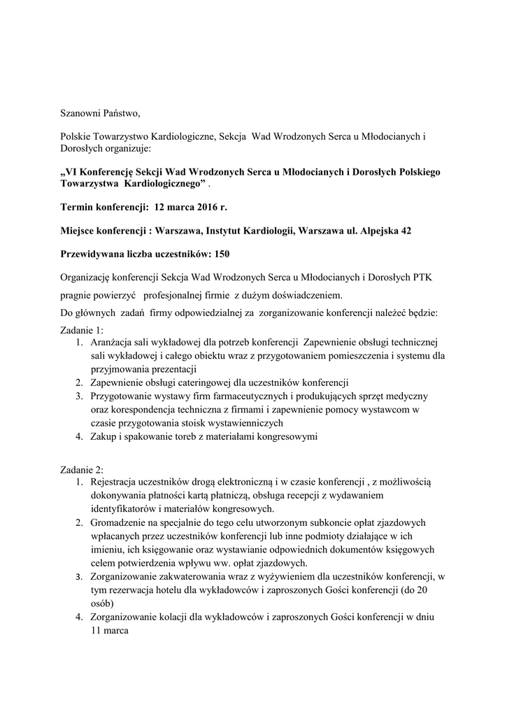 Szanowni Państwo, Polskie Towarzystwo Kardiologiczne, Sekcja Wad Wrodzonych Serca u Młodocianych i Dorosłych organizuje: „VI Konferencję Sekcji Wad Wrodzonych Serca u Młodocianych i Dorosłych Polskiego Towarzystwa Kardiologicznego” . Termin konferencji: 12 marca 2016 r. Miejsce konferencji : Warszawa, Instytut Kardiologii, Warszawa ul. Alpejska 42 Przewidywana liczba uczestników: 150 Organizację konferencji Sekcja Wad Wrodzonych Serca u Młodocianych i Dorosłych PTK pragnie powierzyć profesjonalnej firmie z dużym doświadczeniem. Do głównych zadań firmy odpowiedzialnej za zorganizowanie konferencji należeć będzie: Zadanie 1: 1. Aranżacja sali wykładowej dla potrzeb konferencji Zapewnienie obsługi technicznej sali wykładowej i całego obiektu wraz z przygotowaniem pomieszczenia i systemu dla przyjmowania prezentacji 2. Zapewnienie obsługi cateringowej dla uczestników konferencji 3. Przygotowanie wystawy firm farmaceutycznych i produkujących sprzęt medyczny oraz korespondencja techniczna z firmami i zapewnienie pomocy wystawcom w czasie przygotowania stoisk wystawienniczych 4. Zakup i spakowanie toreb z materiałami kongresowymi Zadanie 2: 1. Rejestracja uczestników drogą elektroniczną i w czasie konferencji , z możliwością dokonywania płatności kartą płatniczą, obsługa recepcji z wydawaniem identyfikatorów i materiałów kongresowych. 2. Gromadzenie na specjalnie do tego celu utworzonym subkoncie opłat zjazdowych wpłacanych przez uczestników konferencji lub inne podmioty działające w ich imieniu, ich księgowanie oraz wystawianie odpowiednich dokumentów księgowych celem potwierdzenia wpływu ww. opłat zjazdowych. 3. Zorganizowanie zakwaterowania wraz z wyżywieniem dla uczestników konferencji, w tym rezerwacja hotelu dla wykładowców i zaproszonych Gości konferencji (do 20 osób) 4. Zorganizowanie kolacji dla wykładowców i zaproszonych Gości konferencji w dniu 11 marca Zadanie 3: 1. Zapewnienie informacji oraz korespondencji z zaproszonymi Gośćmi, wykładowcami 2. Przygotowanie i prowadzenie strony www konferencji (uruchomienie w pierwszej wersji w ciągu miesiąca od podpisania umowy) 3. Szeroka informacja o konferencji (media, strona internetowa, czasopisma medyczne) 4. Przygotowanie i wydanie materiałów konferencyjnych, w tym programu konferencji. 5. Ubezpieczenie konferencji. 6. Przygotowanie niezbędnych dokumentów księgowych i współpraca w rozliczeniu konferencji z Działem Finansowo-Księgowym PTK. Oferta winna zawierać informacje na temat oferenta dotyczące jego dotychczasowych dokonań w zakresie organizowania podobnych konferencji. Zalecane jest dołączenie informacji i dokumentów wykazanych poniżej, niezbędnych w przypadku podjęcia decyzji o zawarciu umowy: 1. Firma, siedziba i adres oferenta oraz dokumenty potwierdzające status prawny oferenta (aktualny odpis z właściwego rejestru albo zaświadczenie o wpisie do ewidencji działalności gospodarczej). 2. Dokumenty stwierdzające, że osoby, które będą działać przy wykonaniu oferty (umowy) posiadają wymagane przepisami prawa uprawnienia. 3. Zaświadczenie z właściwego urzędu skarbowego oraz właściwego oddziału ZUS potwierdzające, że oferent nie zalega z opłacaniem podatków, opłat oraz składek na ubezpieczenie społeczne wystawione nie wcześniej niż na 3 miesiące przed upływem terminu składania ofert. Szczegółowy zakres i warunki współpracy zostaną sprecyzowane przez strony w umowie zawartej z PTK. Oceny ofert dokona Komisja Konkursowa złożona z członków Sekcji Wad Wrodzonych Serca u Młodocianych i Dorosłych. Ocenie podlegać będą: - doświadczenie we współpracy z PTK przy organizacji imprez o podobnej liczbie uczestników - warunki finansowe oferty/rodzaje kosztów. Komisja zastrzega sobie prawo swobodnego wyboru oferty, jak również nie wybrania żadnej ze złożonych ofert bez konieczności uzasadnienia swojej decyzji i bez konieczności zawiadamiania o powziętej decyzji. Do niniejszego zaproszenia do składania ofert nie stosuje się przepisów art. 66-71 kodeksu cywilnego. Oferty w wersji papierowej, podpisane przez osoby umocowane do reprezentowania oferenta, należy składać w terminie do 30.10. 2015 r. do godziny 15-tej na adres: Dr hab. Anna Klisiewicz prof.nadzw. IK Pracownia Echokardiografii Klinicznej KWWS Instytut Kardiologii Ul. Alpejska 42 04-628 Warszawa Z dopiskiem: VI Konferencja Wad Wrodzonych Serca Warszawa 12.03.2016 Harmonogram: Termin składania ofert – do 30.10.2015 r. Otwarcie Ofert: 02.11.2015r. Ogłoszenie wyniku 06.11.2015 r. Podpisanie umowy 09.11.2015 r. Komitet Organizacyjny VI Konferencji Wad Wrodzonych Serca u Młodocianych i Dorosłych – 12.03.2016r. Warszawa Dr hab. n. med. Anna Klisiewicz prof. nadzw .IK Przewodnicząca Zarządu Sekcji Wad Wrodzonych Serca u Młodocianych i Dorosłych PTK Dr hab. n. med. Grażyna Brzezińska-Rajszys prof. nadzw. CZD Kierownik Kardiologii i Pracowni Interwencji Sercowo-Naczyniowych Instytut "Pomnik - Centrum Zdrowia Dziecka" Dr n. med. Piotr Dobrowolski Klinika Wad Wrodzonych Serca Instytutu Kardiologii W Warszawie