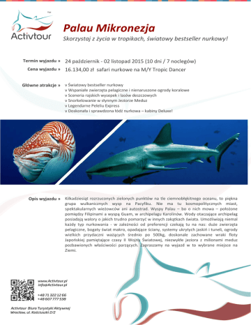 Palau Mikronezja Skorzystaj z życia w tropikach, światowy bestseller nurkowy! Termin wyjazdu » 24 październik - 02 listopad 2015 (10 dni / 7 noclegów) Cena wyjazdu » 16.134,00 zł safari nurkowe na M/Y Tropic Dancer Główne atrakcje » v Światowy bestseller nurkowy v Wspaniałe zwierzęta pelagiczne i nienaruszone ogrody koralowe v Sceneria rajskich wysepek i lasów deszczowych v Snorkelowanie w słynnym Jeziorze Meduz v Legendarne Peleliu Express v Doskonała i sprawdzona łódź nurkowa – kabiny Deluxe! Opis wyjazdu » Kilkadziesiąt rozrzuconych zielonych punktów na tle ciemnobłękitnego oceanu, to piękna grupa wulkanicznych wysp na Pacyfiku. Nie ma tu kosmopolitycznych miast, spektakularnych wieżowców ani autostrad. Wyspy Palau – bo o nich mowa – położone pomiędzy Filipinami a wyspą Guam, w archipelagu Karolinów. Wody otaczające archipelag posiadają walory o jakich trudno pomarzyć w innych zakątkach świata. Umożliwiają niemal każdy typ nurkowania - w zależności od preferencji czekają tu na nas: duże zwierzęta pelagiczne, bogaty świat makro, opadające ściany, systemy ukrytych jaskiń i tuneli, ogrody wielkich przydaczni ważących średnio po 500kg, doskonale zachowane wraki floty Japońskiej pamiętające czasy II Wojny Światowej, niezwykłe jeziora z milionami meduz pozbawionych właściwości parzących. Zapraszamy na wyjazd w to wybrane miejsce na Ziemi. RAMOWY PROGRAM IMPREZY * Dzień 1 » Zbiórka na warszawskim lotnisku na 2h przed wylotem, Spotkanie z opiekunem wyjazdu, rozpoczęcie imprezy, Odprawa paszportowo – bagażowa, Przelot na Palau przez Seul lub Taipei. Dzień 2 » Przylot na Palau/Koror w godzinach wieczornych, Transfer na pokład wybranej łodzi - zakwaterowanie możliwe od godz. 16:00, Oficjalne rozpoczęcie safari nurkowego. Dzień 3 - 8 » Safari nurkowe: 4-5 nurkowań dziennie, w tym 3 nurkowania nocne podczas wyjazdu, Czas wolny na bezludnych wyspach i pokładzie łodzi. Dzień 9 » Śniadanie, Wykwaterowanie z pokładu łodzi - ok. godz. 08:00, Czas wolny - możliwość udziału w nurkowaniach oraz wycieczkach fakultatywnych (szczegóły u organizatora) Przygotowanie do wyjazdu, Przejazd na lotnisko w godzinach wieczornych, Odprawa paszportowo – bagażowa, Wylot do Polski. Dzień 10 » Przylot na warszawskie lotnisko w godzinach południowych, Zakończenie imprezy. Uwaga » Po zakończeniu safari nurkowego istnieje możliwość przedłużenia pobytu na Palau o kilka noclegów w wybranym hotelu – szczegółowe informacje u organizatora. Istnieje także możliwość organizacji noclegu oraz dnia wolnego w jednym z miast tranzytowych: Seulu lub Taipei – szczegółowe informacje u organizatora. * - dokładny program imprezy uzależniony jest od godzin przelotu oraz warunków panujących na Oceanie. OPIS OGÓLNY MY TROPIC DANCER Opis główny łodzi » Tropic Dancer to najnowszy statek należący do floty Dancer. Ten 35 metrowy motorowy katamaran oferuje 7-dniowe safari nurkowe do najlepszych miejsc nurkowych na Palau. Na łodzi znajduje się 9 kabin (1 DBl i 8 deluxe) dla maksymalnie 18 osób. Wszystkie kabiny mają indywidualnie regulowaną klimatyzację podwójne łóżko i nad nim pojedyncze łóżko, łazienkę z prysznicem i suszarką do włosów. Kabiny Deluxe posiadają dodatkowo duże okno i umieszczone są na pokładzie głównym, kabina DBL zaś jest odrobinę mniejsza i wchodzi się do niej z pokładu nurkowego. W dużym, klimatyzowanym salonie serwowane są smaczne posiłki. Jest tu także bar, mała biblioteka, telewizor i DVD. Na łodzi są też 2, częściowo zadaszone pokłady słoneczne. Pokład nurkowy oferuje dużo miejsca, także na sprzęt fotograficzny (oddzielny stół, możliwość ładowania, oddzielne umywalki). Istnieje możliwość nabicia butli nitroksem i wypożyczenia sprzętu (należy to wcześniej zgłosić). OPIS NURKOWANIA NA PALAU Nurkowanie » Nurkowanie wokół wysp Palau gwarantuje możliwość zobaczenie niemal 500 gatunków ryb i 700 gatunków koralowców!! Blue Corner » Blue Corner, to jedno z najlepszych nurkowisk świata o głębokości 32 m. Widoczność pod wodą można oszacować na ok.30-45 m, co jest rewelacyjnym wynikiem w rankingu miejsc do nurkowania. Dzięki temu, możesz bez końca (do czasu aż skończy się powietrze w butli;)) podziwiać dziesiątki żarłaczy szarych, tygrysich i grubych, ławice barakud, makrel królewskich, mant, tuńczyków, karnaksów żółto- i niebieskopłetwych, wszystkie w niebieskiej toni morskiej a co najważniejsze – chelinów napoleońskich czy orleni! Blue Corner, to pierwotnie miejsce połowu ryb ze stosunkowo silnymi prądami. Nie obędzie się bez przypięcia specjalnym hakiem do ściany. Wówczas, należy czekać na prawdziwe, podwodne show morskiej fauny… Nagmelis Wall » Ale na Palau jedno nurkowisko nie wystarczy☺ Nagmelis Wall, znane również jako Big Drop-Off lub German Channel, to miejsce gdzie niemal pewne jest spotkanie mant, a przy okazji spenetrować ok. 60 fantastycznych wraków z okresu wojny, w tym japoński myśliwiec Zero! Tutejsze prądy są nieobliczalne, i często fundują nurkom „jazdę bez trzymanki” pomiędzy stromymi skałami i ławicami. Chandelier Cave » Unikatowe nurkowisko jaskiniowe znajdziecie w Chandelier Cave! Wspaniałe miejsce nurkowe w Rock Islands składa się z 5 komór – najbardziej wewnętrzna z nich ma niesamowity widok i całkiem słusznie została nazwana Temple of Doom (Świątynia Przeznaczenia). Wlot groty Chandelier Cave ma ok 5 m szerokości, jednak po wpłynięciu do systemu jaskiń oczom ukazuje się przestronne wnętrze. Stalaktyty i stalagmity nadają tajemniczy charakter nurkowaniom, a kieszeń powietrzna u sklepienia każdej z 4 „sal” przepuszcza słodką wodę do groty, która spływając po ścianach, tworzy malownicze draperie. Peleliu Wall » Poszukiwacze przygód mogą udać się do Peleliu - miejsca gdzie Ocean Spokojny spotyka się z Morzem Filipi