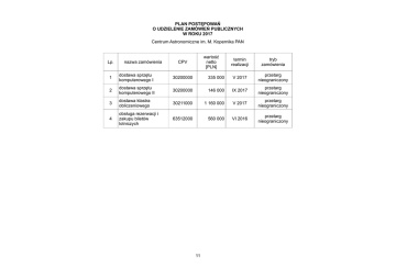 PLAN POSTĘPOWAŃ O UDZIELENIE ZAMÓWIEŃ PUBLICZNYCH W ROKU 2017 Centrum Astronomiczne im. M. Kopernika PAN Lp. nazwa zamówienia wartość netto [PLN] CPV termin realizacji tryb zamówienia 1 dostawa sprzętu komputerowego I 30200000 335 000 V 2017 przetarg nieograniczony 2 dostawa sprzętu komputerowego II 30200000 146 000 IX 2017 przetarg nieograniczony 3 dostawa klastra obliczeniowego 30211000 1 160 000 V 2017 przetarg nieograniczony 4 obsługa rezerwacji i zakupu biletów lotniczych 63512000 560 000 VI 2016 przetarg nieograniczony 11