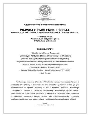 Ogólnopolska konferencja naukowa PRAWDA O SMOLEŃSKU DZISIAJ. MANIPULACJA FAKTAMI O KATASTROFIE SMOLEŃSKIEJ W MASS MEDIACH. 18 marca 2016 r. Warszawa, ul. Wóycickiego 1/3 UKSW, Aula Schumana ORGANIZATORZY: - Ministerstwo Obrony Narodowej - Uniwersytet Kardynała Stefana Wyszyńskiego w Warszawie (Katedra Teologii Pastoralnej i Nauk Pomocniczych WT) - Inspektorat Ministerstwa Obrony Narodowej ds. Bezpieczeństwa Lotów - Wyższa Szkoła Kultury Społecznej i Medialnej w Toruniu - Wydział Studiów nad Rodziną UKSW - Katedra Teologii Pastoralnej i Nauk Pomocniczych WT UKSW - Klub Ronina Konferencja naukowa „Prawda o Smoleńsku dzisiaj. Manipulacja faktami o katastrofie smoleńskiej w masmediach” ma charakter społeczny. Celem jej jest przedstawienie w sposób naukowy o roli i sposobie przekazu medialnego i manipulacją faktami o katastrofie smoleńskiej. Konferencja będzie również płaszczyzną do przekazania informacji o aktualnych badaniach nad katastrofą. Dopełnieniem konferencji będzie debata ekspercko-dziennikarska dotycząca przekazu medialnego, jego wykorzystania i umiejętnością manipulowania faktami. Kontakt: [email protected] RAMOWY PROGRAM Ogólnopolska konferencja naukowa PRAWDA O SMOLEŃSKU DZISIAJ. MANIPULACJA FAKTAMI O KATASTROFIE SMOLEŃSKIEJ W MASS MEDIACH. Warszawa, 18 marca 2016 r. 8.30 – 9.30 Msza święta pod przewodnictwem Ks. Bp ANTONIEGO DYDYCZA Miejsce: Kościół św. Józefa – kampus UKSW ul. Wóycickiego, Warszawa Otwarcie konferencji - ks. prof. dr hab. JAN PRZYBYŁOWSKI (UKSW) 9.30 – 10.00 Słowo wstępne: Ks. Bp Antoni Dydycz 10.00 – 10.20 dr hab. MIECZYSŁAW RYBA, prof. KUL (KUL) "USA, Rosja, Unia Europejska wobec Polski na początku XXI wieku" 10.20 - 10.40 dr HANNA KARP (WSKSIM) "Religia smoleńska" w dyskursie polskojęzycznej prasy mainstreamowej” 10.40 – 11.00 ANTONI KRAUZE – kulisy powstawania filmu „Smoleńsk” 11.00 – 11.20 dr GRZEGORZ OSIŃSKI, inż. JAKUB KOSOWSKI (WSKSIM) – „Rola symulacji i wizualizacji komputerowych w analizie oraz ich znaczenie w przekazie medialnym" 11.20 – 11.40 dr JÓZEF ORZEŁ „Hermeneutyka języka Donalda Tuska” 11.40 – 12.10 przerwa 12.10 – 12.40 Podkomisja do spraw zbadania katastrofy smoleńskiej 12.40 – 13.30 Rodziny smoleńskie wobec doniesień medialnych o katastrofie smoleńskiej EWA BŁASIK, MAGDALENA MERTA, ANDRZEJ MELAK 13.30 – 13.40 DAMIAN ZAKRZEWSKI (UKSW) „Przekaz medialny katastrofie smoleńskiej na przykładzie „Gazety Wyborczej” 13.40 – 14.30 Debata dziennikarska – prowadzenie dr JÓZEF ORZEŁ MARIA DŁUŻEWSKA, DOROTA KANIA, MICHAŁ RACHOŃ, TOMASZ SAKIEWICZ 14.30 – 15.00 Podsumowanie i zakończenie konferencji katastrofy smoleńskiej