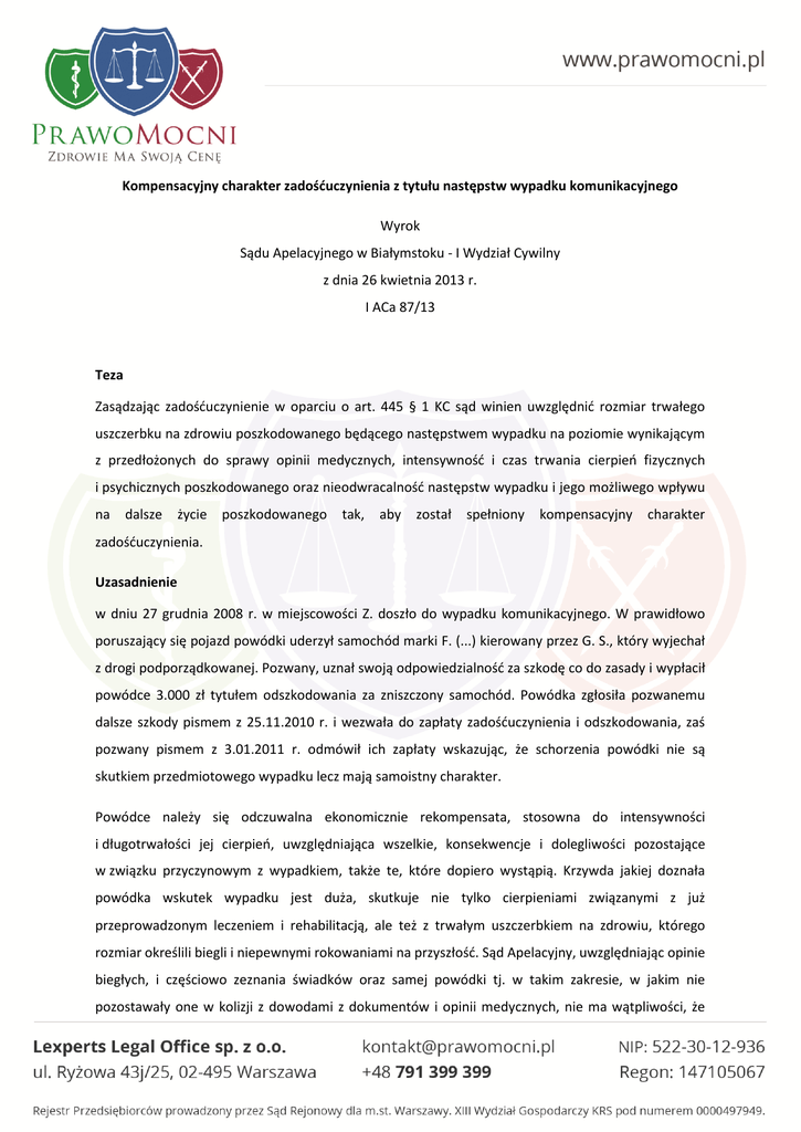Kompensacyjny charakter zadośćuczynienia z tytułu następstw wypadku komunikacyjnego Wyrok Sądu Apelacyjnego w Białymstoku - I Wydział Cywilny z dnia 26 kwietnia 2013 r. I ACa 87/13 Teza Zasądzając zadośćuczynienie w oparciu o art. 445 § 1 KC sąd winien uwzględnić rozmiar trwałego uszczerbku na zdrowiu poszkodowanego będącego następstwem wypadku na poziomie wynikającym z przedłożonych do sprawy opinii medycznych, intensywność i czas trwania cierpień fizycznych i psychicznych poszkodowanego oraz nieodwracalność następstw wypadku i jego możliwego wpływu na dalsze życie poszkodowanego tak, aby został spełniony kompensacyjny charakter zadośćuczynienia. Uzasadnienie w dniu 27 grudnia 2008 r. w miejscowości Z. doszło do wypadku komunikacyjnego. W prawidłowo poruszający się pojazd powódki uderzył samochód marki F. (...) kierowany przez G. S., który wyjechał z drogi podporządkowanej. Pozwany, uznał swoją odpowiedzialność za szkodę co do zasady i wypłacił powódce 3.000 zł tytułem odszkodowania za zniszczony samochód. Powódka zgłosiła pozwanemu dalsze szkody pismem z 25.11.2010 r. i wezwała do zapłaty zadośćuczynienia i odszkodowania, zaś pozwany pismem z 3.01.2011 r. odmówił ich zapłaty wskazując, że schorzenia powódki nie są skutkiem przedmiotowego wypadku lecz mają samoistny charakter. Powódce należy się odczuwalna ekonomicznie rekompensata, stosowna do intensywności i długotrwałości jej cierpień, uwzględniająca wszelkie, konsekwencje i dolegliwości pozostające w związku przyczynowym z wypadkiem, także te, które dopiero wystąpią. Krzywda jakiej doznała powódka wskutek wypadku jest duża, skutkuje nie tylko cierpieniami związanymi z już przeprowadzonym leczeniem i rehabilitacją, ale też z trwałym uszczerbkiem na zdrowiu, którego rozmiar określili biegli i niepewnymi rokowaniami na przyszłość. Sąd Apelacyjny, uwzględniając opinie biegłych, i częściowo zeznania świadków oraz samej powódki tj. w takim zakresie, w jakim nie pozostawały one w kolizji z dowodami z dokumentów i opinii medycznych, nie ma wątpliwości, że bezpośrednio po wypadku i w czasie leczenia powódka doznawała istotnych cierpień fizycznych i psychicznych, które musiały być szczególnie intensywne i dolegliwe w okresie poddania jej dwukrotnemu leczeniu operacyjnemu. W tym czasie powódka bez wątpienia okresowo była też całkowicie zależna od pomocy innych osób, została pozbawiona możliwości czerpania przyjemności wynikających ze swego wieku, z macierzyństwa, pozbawiona szansy normalnego funkcjonowania we wszystkich płaszczyznach życia. Nie może także podlegać wątpliwości, że uszczerbek na zdrowiu powódki rzutuje trwale na jej dalsze życie - musi prowadzić oszczędzający tryb życia, doznawać będzie w nim trwałych ograniczeń w różnych płaszczyznach życia wynikających z konieczności kontynuowania leczenia szyjnego odcinka kręgosłupa i intensywnej rehabilitacji, podjęcia leczenia skutków wypadku w sferze psychiki, korzystania z pomocy innych osób przy wykonywaniu niektórych czynności w codziennym życiu. Kryteria ustalania wysokości zadośćuczynienia Wyrok Sądu Apelacyjnego w Lublinie - I Wydział Cywilny z dnia 24 lipca 2013 r. I ACa 338/13 Uzasadnienie W dniu 28 marca 2009 r. miał miejsce wypadek drogowy, polegający na tym, że kierujący pojazdem M. B. uderzył w prawidłowo poruszającego się lewym poboczem pieszego - powoda D. W. W jego wyniku powód doznał szeregu obrażeń ciała - urazu głowy, stłuczenia mózgu, złamania prawej łopatki, uszkodzenia sploty ramiennego, złamania wyrostka poprzecznego C7, złamania kości łonowej przechodzącego przez panewkę stawu biodrowego. Bezpośrednio po wypadku powód przebywał w szpitalu nieprzerwanie od 28 marca 2009 r. do 23 czerwca 2009 r., a następnie, na rehabilitacji, w okresie od 26 września 2009 r. do 17 października 2009 r. Pomiędzy pobytami w szpitalu powód codziennie był dowożony na rehabilitację oraz wizyty lekarskie. Zniszczona też została w wyniku zdarzenia jego odzież. Powód jest z zawodu blacharzem samochodowym. Przed wypadkiem pracował jako ślusarz, a następnie była zatrudniony w sklepie spożywczym swojej matki jako sprzedawca na część etatu, w okresie od 23 marca 2009 r. do 30 września 2010 r. z wynagrodzeniem 1.500 zł miesięcznie. Zamieszkiwał wspólnie z rodzicami. Obecnie wyprowadził się i mieszka z żoną. Jego trwały uszczerbek na zdrowiu oceniony został na poziomie 45%. Pod względem psychologicznym nie doszło do istotnego pogorszenia się jego funkcjonowanie, choć można zaobserwować spowolnienie psychoruchowe i trudności w zadaniach złożonych, wymagających koncentracji i podzielności uwagi. Psychiatra zaś rozpoznał u powoda zespół psychoorganiczny pourazowy o lekkim nasileniu. Chirurg ortopeda - traumatolog wskazał na potrzebę dokonania w przyszłości endoprotezoplastyki uszkodzonego stawu. Występujące u powoda upośledzenie wzroku, obecnie mało uchwytne, określone zostało na trwające rok i o miernym nasileniu. Sprawca wypadku został skazany wyrokiem Sądu Karnego. Bogata judykatura dostarcza następujących kryteriów, jakimi należy się kierować przy ustalaniu wysokości zadośćuczynienia: - wiek poszkodowanego (zwykle większą krzywdą jest np. kalectwo u młodej osoby), - rodzaj i rozmiar doznanych obrażeń, - stopień i rodzaj cierpień fizycznych i psychicznych, - intensywność (natężenie, nasilenie) i czas trwania tych cierpień, ewentualnie stopień kalectwa, - nieodwracalność następstw uszkodzenia ciała lub wywołania rozstroju zdrowia - kalectwo, oszpecenie (wyrok SN z dnia 23 kwietnia 1969 r., I PR 23/69; wyrok SN z dnia 4 października 1967 r., II PR 338/67), - skutki uszczerbku w zdrowiu na przyszłość (np. niemożność wykonywania ulubionego zawodu, uprawiania sportów, pracy artystycznej, rozwijania swoich zainter