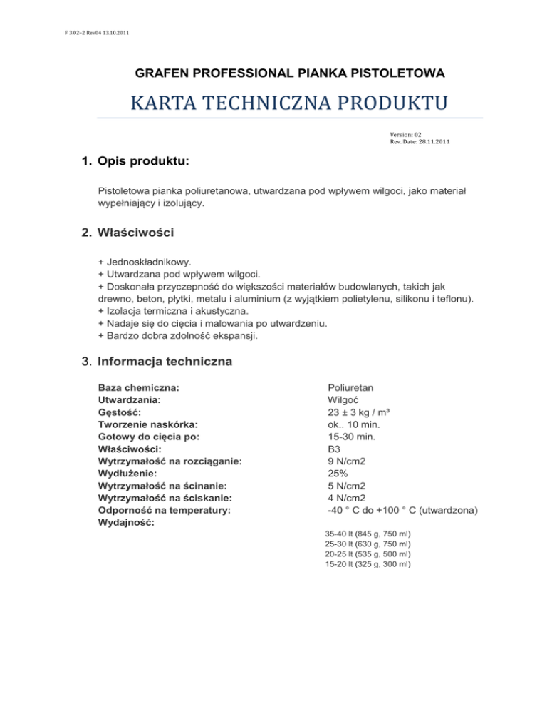 F 3.02–2 Rev04 13.10.2011 GRAFEN PROFESSIONAL PIANKA PISTOLETOWA KARTA TECHNICZNA PRODUKTU Version: 02 Rev. Date: 28.11.2011 1. Opis produktu: Pistoletowa pianka poliuretanowa, utwardzana pod wpływem wilgoci, jako materiał wypełniający i izolujący. 2. Właściwości + Jednoskładnikowy. + Utwardzana pod wpływem wilgoci. + Doskonała przyczepność do większości materiałów budowlanych, takich jak drewno, beton, płytki, metalu i aluminium (z wyjątkiem polietylenu, silikonu i teflonu). + Izolacja termiczna i akustyczna. + Nadaje się do cięcia i malowania po utwardzeniu. + Bardzo dobra zdolność ekspansji. 3. Informacja techniczna Baza chemiczna: Utwardzania: Gęstość: Tworzenie naskórka: Gotowy do cięcia po: Właściwości: Wytrzymałość na rozciąganie: Wydłużenie: Wytrzymałość na ścinanie: Wytrzymałość na ściskanie: Odporność na temperatury: Wydajność: Poliuretan Wilgoć 23 ± 3 kg / m³ ok.. 10 min. 15-30 min. B3 9 N/cm2 25% 5 N/cm2 4 N/cm2 -40 ° C do +100 ° C (utwardzona) 35-40 lt (845 g, 750 ml) 25-30 lt (630 g, 750 ml) 20-25 lt (535 g, 500 ml) 15-20 lt (325 g, 300 ml) F 3.02–2 Rev04 13.10.2011 GRAFEN PROFESSIONAL PIANKA PISTOLETOWA KARTA TECHNICZNA PRODUKTU Version: 02 Rev. Date: 28.11.2011 4. Szczegóły aplikacji Temperatura aplikacji: min. +5 ° C Odporność na temperaturę: -40 ° C do +100 ° C Powierzchnia aplikacji musi być solidna, czysta, sucha, wolna od pyłu, oleju i smaru. Powierzchnia musi być nawilżona przed nałożeniem pianki PU. Najbardziej odpowiednia temperatura do stosowania pianki poliuretanowej wynosi pomiędzy 20-25 ° C. Należy stosować po przechowywaniu w zimnym miejscu przechować w temperaturze pokojowej przez okres(20 minut). Pojemnik energicznie wstrząsnąć około 30 razy przed użyciem. 5. Piankę stosuje się w; - Montaż i uszczelnianie okien i ram drzwiowych, - Wypełnianie ubytków, - Uszczelnianie otworów we wszystkich konstrukcjach dachowych, 6. Pakowanie Puszka 750ml 7. Kolory: 8. Okres ważności Produkt przechowywać w suchym i chłodnym miejscu. Okres przechowywania wynosi 12 miesięcy. 9. Uwaga Przechowywać w miejscu niedostępnym dla dzieci. Unikać kontaktu z oczami i skórą. Stosować w dobrze wentylowanych pomieszczeniach. Nie wdychać oparów. Nie palić podczas używania produktu. F 3.02–2 Rev04 13.10.2011 GRAFEN PROFESSIONAL PIANKA PISTOLETOWA KARTA TECHNICZNA PRODUKTU Version: 02 Rev. Date: 28.11.2011 10. Zdrowie i bezpieczeństwo Aby uzyskać więcej informacji i porad na temat bezpiecznego obchodzenia się, składowania i utylizacji środków chemicznych, odnosi się do najnowszej Karty bezpieczeństwa produktu zawierającego, fizyczne, ekologiczne i toksykologiczne i inne dane związane z bezpieczeństwem.