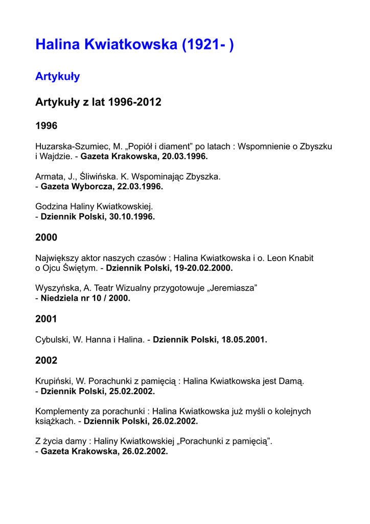 Halina Kwiatkowska (1921- ) Artykuły Artykuły z lat 1996-2012 1996 Huzarska-Szumiec, M. „Popiół i diament” po latach : Wspomnienie o Zbyszku i Wajdzie. - Gazeta Krakowska, 20.03.1996. Armata, J., Śliwińska. K. Wspominając Zbyszka. - Gazeta Wyborcza, 22.03.1996. Godzina Haliny Kwiatkowskiej. - Dziennik Polski, 30.10.1996. 2000 Największy aktor naszych czasów : Halina Kwiatkowska i o. Leon Knabit o Ojcu Świętym. - Dziennik Polski, 19-20.02.2000. Wyszyńska, A. Teatr Wizualny przygotowuje „Jeremiasza” - Niedziela nr 10 / 2000. 2001 Cybulski, W. Hanna i Halina. - Dziennik Polski, 18.05.2001. 2002 Krupiński, W. Porachunki z pamięcią : Halina Kwiatkowska jest Damą. - Dziennik Polski, 25.02.2002. Komplementy za porachunki : Halina Kwiatkowska już myśli o kolejnych książkach. - Dziennik Polski, 26.02.2002. Z życia damy : Haliny Kwiatkowskiej „Porachunki z pamięcią”. - Gazeta Krakowska, 26.02.2002. Na scenie z Wielkim Kolegą : Haliny Kwiatkowskiej „Porachunki z pamięcią” Krakowską Książką Miesiąca. - Dziennik Polski, 17.04.2002. 2003 Opowieść o wielkim koledze : Nowa książka o Karolu Wojtyle. - Gazeta Krakowska, 2/4.05.2003. 69 lat z Wielkim Kolegą : Halina Kwiatkowska wspomina Karola Wojtyłę. - Dziennik Polski, 30.04.2003. 2006 Targoń, J. Jubileusz Haliny Kwiatkowskiej. - Gazeta Wyborcza (Co jest Grane), 26.05.2006. Jubileusz Haliny Kwiatkowskiej. - Gazeta Krakowska (Imprezariusz Krakowski), 26-28.05.2006. Jubileusz amantki. - Gazeta Krakowska, 30.05.2006. 2008 Cybulski, W. Przypadek: Halina K. - Dziennik Polski, 26.06.2008. 2012 Ginka jako narzeczona Karola Wojtyły. - Gazeta Krakowska, 27.01.2012. Felietony 1992-2003 1992 Kwiatkowska, H. Śmiech na scenie : Światowy Dzień Teatru. - Dziennik Polski, 27.03.1992. 1998 Kwiatkowska, H. Jazzowa improwizacja. - Dziennik Polski, 21.08.1998. 2000 Kwiatkowska, H. Epizody z „Popiołu i diamentu”. - Dziennik Polski, 23.03.2000. 2003 Kwiatkowska, H. Wielki Kolega. - Dziennik Polski, 16.05.2003. Wywiady z lat 1995-2007 1995 Stachowicz, K. Rękawiczka czy gorset. - Zwierciadło nr 2, 1995. 1996 Cybulski, W. Rzadko rezygnuję. - Dziennik Polski, 24-26.12.1996. 2001 Ciosek, J. Z górki na górkę. - Dziennik Polski, 6.04.2001. Litak, A. Aktorka i pedagog. - Gazeta Wyborcza (Gazeta w Krakowie), 7/8.04.2001. Ciosek, J. Przeżyliśmy dni dobre i chwile szczęśliwe... : Teatr Rapsodyczny wspominają Halina Kwiatkowska, Danuta Michałowska i Tadeusz Malak w rozmowie z Jolantą Ciosek. - Dziennik Polski, 2.10.2001. 2007 Ciosek, J. „Wielki Kolega” w Ameryce : Halina Kwiatkowska wspomina Karola Wojtyłę. - Dziennik Polski, 16.10.2007.