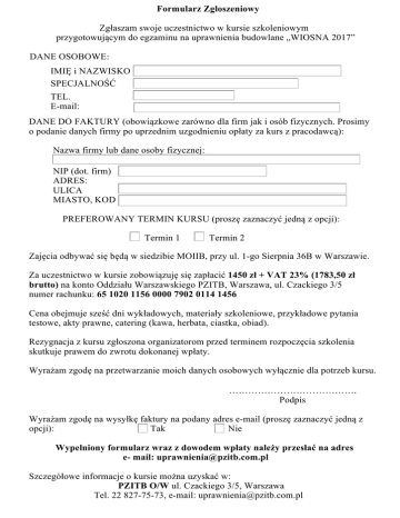 Formularz Zgłoszeniowy Zgłaszam swoje uczestnictwo w kursie szkoleniowym przygotowującym do egzaminu na uprawnienia budowlane „WIOSNA 2017” DANE OSOBOWE: IMIĘ i NAZWISKO SPECJALNOŚĆ TEL. E-mail: DANE DO FAKTURY (obowiązkowe zarówno dla firm jak i osób fizycznych. Prosimy o podanie danych firmy po uprzednim uzgodnieniu opłaty za kurs z pracodawcą): Nazwa firmy lub dane osoby fizycznej: NIP (dot. firm) ADRES: ULICA MIASTO, KOD PREFEROWANY TERMIN KURSU (proszę zaznaczyć jedną z opcji): Termin 1 Termin 2 Zajęcia odbywać się będą w siedzibie MOIIB, przy ul. 1-go Sierpnia 36B w Warszawie. Za uczestnictwo w kursie zobowiązuję się zapłacić 1450 zł + VAT 23% (1783,50 zł brutto) na konto Oddziału Warszawskiego PZITB, Warszawa, ul. Czackiego 3/5 numer rachunku: 65 1020 1156 0000 7902 0114 1456 Cena obejmuje sześć dni wykładowych, materiały szkoleniowe, przykładowe pytania testowe, akty prawne, catering (kawa, herbata, ciastka, obiad). Rezygnacja z kursu zgłoszona organizatorom przed terminem rozpoczęcia szkolenia skutkuje prawem do zwrotu dokonanej wpłaty. Wyrażam zgodę na przetwarzanie moich danych osobowych wyłącznie dla potrzeb kursu. …………………………………. Podpis Wyrażam zgodę na wysyłkę faktury na podany adres e-mail (proszę zaznaczyć jedną z opcji): Tak Nie Wypełniony formularz wraz z dowodem wpłaty należy przesłać na adres e- mail: [email protected] Szczegółowe informacje o kursie można uzyskać w: PZITB O/W ul. Czackiego 3/5, Warszawa Tel. 22 827-75-73, e-mail: [email protected]