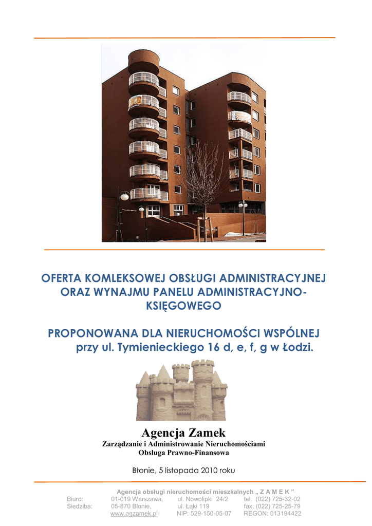 OFERTA KOMLEKSOWEJ OBSŁUGI ADMINISTRACYJNEJ ORAZ WYNAJMU PANELU ADMINISTRACYJNOKSIĘGOWEGO PROPONOWANA DLA NIERUCHOMOŚCI WSPÓLNEJ przy ul. Tymienieckiego 16 d, e, f, g w Łodzi. Agencja Zamek Zarządzanie i Administrowanie Nieruchomościami Obsługa Prawno-Finansowa Błonie, 5 listopada 2010 roku Biuro: Siedziba: Agencja obsługi nieruchomości mieszkalnych „ Z A M E K ” 01-019 Warszawa, ul. Nowolipki 24/2 tel. (022) 725-32-02 05-870 Błonie, ul. Łąki 119 fax. (022) 725-25-79 www.agzamek.pl NIP: 529-150-05-07 REGON: 013194422 1. O NASZEJ FIRMIE: Agencja Zamek zajmuje się zarządzaniem i administrowaniem nieruchomościami wspólnymi od 1998 roku. W trakcie swojej działalności wyspecjalizowała się w świadczeniu kompleksowych usług na rzecz Wspólnot Mieszkaniowych, na które składają się działania administracyjne, księgowe, prawne i informatyczne. W naszej pracy wykorzystujemy własne specjalistyczne oprogramowanie obejmujące pełną księgowość, szczegółowe rozliczenia z właścicielami oraz wspomaganie zarządzania, które powstało na podstawie naszych wieloletnich doświadczeń. Dla lepszego przepływu informacji i większego zadowolenia z współpracy z naszą firmą stworzyliśmy specjalistyczne narzędzie informatyczne dla członków wspólnot mieszkaniowych. Za pomocą Internetu mają oni dostęp do pełnej dokumentacji dotyczącej ich wspólnoty oraz ułatwiony system zgłaszania wad i usterek. Obsługujemy wspólnoty mieszkaniowe z Warszawy i okolic. Pełna obsługa zakresie administrowania nieruchomości, członków zarządu i mieszkańców prowadzona jest na terenie nieruchomości (nie ma potrzeby przyjazdów do siedziby lub biura naszej firmy). W duŜej mierze klientami naszej firmy są nowopowstające wspólnoty właścicieli nowych mieszkań odebranych bezpośrednio od firm deweloperskich. Powodem tego jest fakt, Ŝe posiadamy udokumentowane doświadczenie w przejmowaniu budynków od dewelopera. Mamy opracowaną procedurę polegającą na wykonaniu szczegółowego przeglądu, podczas którego sporządzamy dokładną dokumentację fotograficzną usterek. Dokumentację taką, popartą opisem usterek wykonanym przez administratora lub inspektora nadzoru budowlanego, przekazujemy deweloperowi. Ponad to dokumentacja taka oraz nowe, na bieŜąco zgłaszane przez mieszkańców usterki i wady są w usystematyzowany sposób archiwizowane w internetowym panelu administracyjno księgowym, do którego mają dostęp on line mieszkańcy. Formalną podstawą wykonywanych przez nas usług jest wpis do ewidencji działalności gospodarczej nr 3518 w Urzędzie Miasta i Gminy w Błoniu oraz licencje zawodowe Urzędu Mieszkalnictwa i Rozwoju Miast: Licencja Zarządcy Nieruchomości nr 14058 (OC Zarządcy na 50 tyś EUR.) Licencja Zarządcy Nieruchomości nr 17734 2. OPIS NASZYCH USŁUG I ORGANIZACJI PRACY: 2.1 Dział Administracyjny Obsługą danej nieruchomości kieruje Koordynator zespołu, który ma do dyspozycji administratorów, księgowego, konserwatorów poszczególnych instalacji i wsparcie działu prawnego. Biuro: Siedziba: Agencja obsługi nieruchomości mieszkalnych „ Z A M E K ” 01-019 Warszawa, ul. Nowolipki 24/2 tel. (022) 725-32-02 05-870 Błonie, ul. Łąki 119 fax. (022) 725-25-79 www.agzamek.pl NIP: 529-150-05-07 REGON: 013194422 Administrator do spraw techniczno-eksploatacyjnych wykonuje część pracy, która wymaga codziennej obecności w budynku. Spotyka się z kontrahentami Wspólnoty, czuwa nad przebiegiem prac remontowych, usuwaniem awarii, organizuje przeglądy techniczne nieruchomości, wykonuje własną dokumentację opisowo-fotograficzną dla dalszych prac (napraw) i utrzymania nieruchomości w stanie niepogarszającym się. Współpracuje on z zapleczem w biurze, wprowadza wykonawców lub usługodawców na budynek, w zakresie jego obowiązków jest równieŜ bezpośrednia współpraca z administratorem do spraw bieŜącego nadzoru nieruchomości i konserwatorami instalacji w budynku. Administrator do spraw organizacyjnych i formalnych wykonuje wszelkie prace wymagające dostępu do komputera, Internetu, moŜliwe do wykonania z uŜyciem telefonu i za biurka, organizuje konkurs ofert na wykonanie danej usługi w nieruchomości, prowadzi adnotacje i korespondencje z Zarządem przez internetowy panel administracyjny. Wykonuje to, na co nie posiada juŜ czasu administrator pracujący na terenie nieruchomości. Uczestniczy we współpracy z działem prawnym w przygotowaniu uchwał i korespondencji. Opiekun nieruchomości - zadaniem tej osoby jest przede wszystkim codzienna kontrola jakości usług wykonywanych przez firmy zatrudnione przez Wspólnotę tj. obchód budynku ( w tym pomieszczenia techniczne) i terenu nieruchomości i ocena czystości nieruchomości oraz pracy firmy konserwującej - sprawdzenie wykonania zakontraktowanych w umowie czynności. Dodatkowe zadania to przekazanie korespondencji właścicielom, szybka reakcja w przypadku awarii tj. zabezpieczenie miejsca awarii do czasu przyjazdu konserwatora itp. 2.2 Dział Księgowy Zespół księgowy poza standardowymi rozliczeniami księgowymi udziela równieŜ informacji i wyjaśnień codziennie w dni robocze drogą telefoniczną lub mailowo w godzinach 10:00 – 15:00. Ponadto za kaŜdym razem Księgowy jest delegowany na spotkania roczne lub celowe, podczas których mieszkańcy mogą wyjaśnić nurtujące ich kwestie natury rozliczeniowej. Prezentacje rozliczeń mogą być wykonywane podczas spotkań z mieszkańcami z uŜyciem projektora. Jesteśmy otwarci na moŜliwość organizacji dyŜuru księgowego, który będzie podany do wiadomości mieszkańców. Salda właścicieli widoczne są na wskazanej stronie internetowej. KaŜdy właściciel otrzymuje raz na kwartał pisemne zestawienie zaliczek i dokonanych wpłat wraz z saldem rozliczeń. Rozliczenia mediów wykonywane są rocznie lub częściej w zaleŜności od ustaleń z zarządem. Firma posiada własne specjalistyczne opro