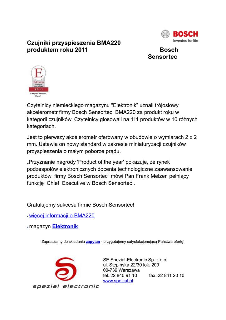 Czujniki przyspieszenia BMA220 produktem roku 2011 Bosch Sensortec Czytelnicy niemieckiego magazynu "Elektronik” uznali trójosiowy akcelerometr firmy Bosch Sensortec BMA220 za produkt roku w kategorii czujników. Czytelnicy głosowali na 111 produktów w 10 różnych kategoriach. Jest to pierwszy akcelerometr oferowany w obudowie o wymiarach 2 x 2 mm. Ustawia on nowy standard w zakresie miniaturyzacji czujników przyspieszenia o małym poborze prądu. „Przyznanie nagrody 'Product of the year' pokazuje, że rynek podzespołów elektronicznych docenia technologiczne zaawansowanie produktów firmy Bosch Sensortec” mówi Pan Frank Melzer, pełniący funkcję Chief Executive w Bosch Sensortec . Gratulujemy sukcesu firmie Bosch Sensortec! więcej informacji o BMA220 magazyn Elektronik Zapraszamy do składania zapytań - przygotujemy satysfakcjonującą Państwa ofertę! SE Spezial-Electronic Sp. z o.o. ul. Stępińska 22/30 lok. 209 00-739 Warszawa tel. 22 840 91 10 fax. 22 841 20 10 www.spezial.pl