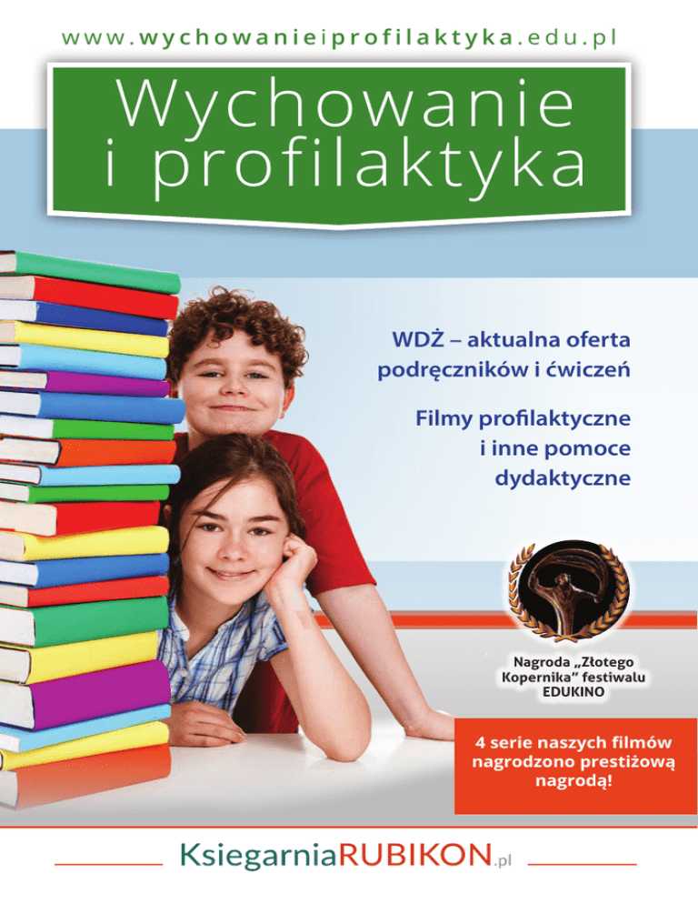 www.wychowanieiprofilaktyka.edu.pl Wychowanie i profilaktyka WDŻ – aktualna oferta podręczników i ćwiczeń Filmy profilaktyczne i inne pomoce dydaktyczne Nagroda „Złotego Kopernika” festiwalu EDUKINO 4 serie naszych filmów nagrodzono prestiżową nagrodą! Szanowni Państwo, Wychowawcy i Nauczyciele WDŻ! W lipcu 2015 roku w Ministerstwie Edukacji Narodowej zostały zaprezentowane wyniki badań dot. odbioru zajęć wychowanie do życia w rodzinie i ich oceny przez uczniów oraz rodziców. Badania przeprowadzone na zlecenie MEN zostały profesjonalnie przygotowane i opracowane przez zespół ekspercki Instytutu Badań Edukacyjnych. Dla nauczycieli intrygująca jest odpowiedź na pytania: czy i w jakim stopniu aktualny program zajęć WDŻ zaspokaja potrzeby poznawcze uczniów, oraz czy „klimat” tych specyficznych zajęć jest sprzyjający? Ku zdumieniu Pani minister edukacji Joanny Kluzik-Rostkowskiej, zajęcia WDŻ otrzymały wysokie notowania: są cenione zarówno przez uczniów, jak i rodziców. Ta wiadomość „dodaje skrzydeł” i pozwala uwierzyć, że nasz nauczycielski trud ma sens, że pomaga młodym ludziom w dorastaniu ku dorosłości. Okazało się, że medialne krytyczne opinie o tym przedmiocie nie są prawdziwe. Niezadowolonych z zajęć było tylko 10% uczniów; 62% gimnazjalistów ocenia je dobrze lub raczej dobrze, w liceach aż 71%. Uczniowie nisko oceniają tylko organizację zajęć (zajęcia odbywają się w mało dogodnych godzinach, tj. zbyt wcześnie lub zbyt późno), a ok. 1/3 badanych stwierdziło, że zajęcia są prowadzone w nudny, nieciekawy sposób. Tych, krytycznych uwag nie należy lekceważyć, trzeba wyciągnąć wnioski zmierzające do poszukiwania dobrych rozwiązań. Realizacja pierwszej uwagi leży w gestii dyrektora szkoły, drugiej – nauczyciela WDŻ, np. przez wprowadzenie interesujących form i metod. Uczniowie domagają się równego traktowania zajęć z innymi przedmiotami, uzasadniając, że informacje przekazywane na WDŻ są przydatne (64% w gimnazjach, 74% w liceach). Propozycja Wydawnictwa Rubikon na rok szkolny 2015/16 została poszerzona o ofertę nowych filmów, nowej poprawionej serii podręczników i ćwiczeń dla klasy I gimnazjum oraz materiałów zamieszczonych na stronie www.wdz.edu.pl. Zamieszczono tam m.in. trzy prezentacje multimedialne (z opisem) dla nauczycieli WDŻ na spotkania z rodzicami – dla wszystkich etapów edukacyjnych. Zespół Wydawnictwa Rubikon 2 Szkoła podstawowa Podręcznik „Wędrując ku dorosłości” taktownie wprowadza chłopców i dziewczynki w okres zmian związanych z dojrzewaniem. Wielu rodziców rozmawia ze swoimi dziećmi na „te” tematy, ale nie wszyscy. Niektórzy odkładają rozmowę „na później”. Tymczasem obserwujemy postępujące zjawisko akceleracji, czyli przyspieszenie dojrzewania płciowego nastolatków, z równocześnie późniejszym osiąganiem przez nich dojrzałości psychicznej i społecznej. podręcznik WYCHOWANIE DO ŻYCIA W RODZINIE Seria Wędrując ku dorosłości program Nr ew. 705/2014 ćwiczenia ćwiecznia www.wychowanieiprofilaktyka.edu.pl WYCHOWANIE DO ŻYCIA W RODZINIE Seria W drodze ku dorosłości Szkoła podstawowa Seria „W drodze ku dorosłości” stanowi alternatywę dla podręcznika, ćwiczeń i programu „Wędrując ku dorosłości”. Czym różnią się te propozycje? „W drodze ku dorosłości” to tylko dwa zeszyty – jeden do klasy V, a drugi do klasy VI. Każdy zeszyt zawiera oprócz ćwiczeń również teksty (fragmenty podręcznika). Wielu nauczycieli wybiera tę opcję; jest ona nieco uboższa, ponieważ zawiera mniej materiału teoretycznego, ale jest bardziej praktyczna. program Szata graficzna – ciekawa: kolorowe zdjęcia, rysunki, różnorodność ćwiczeń. Ta edycja również spełni swoje zadanie i pomoże nauczycielowi WDŻ, aby jego zajęcia były efektywne i ciekawe. Wiadomo, że reżyserem i kreatorem zajęć jest nauczyciel, a powyższa edycja – przeznaczona dla mniej wymagających − może być pożądanym dopełnieniem. Dla nauczyciela został także przygotowany program nauczania pod tym samym tytułem, w którym prowadzący zajęcia znajdzie odwołania do zaproponowanych ćwiczeń i materiałów. ćwiczenia i materiały F I L M Y D L A S Z K O Ł Y Seria: Rodzinne Przeboje WIĘCEJ NA STR. 9 z a m ó w i e n i a tel.: 12 398 18 42 tel.: 12 398 18 43 fax.: 12 398 18 44 e-mail: [email protected] 4 P O D S T A W O W E J : Film „Happy slapping” z serii Zaplątani w sieć WIĘCEJ NA STR. 12 Katarzyna Król Wydawnictwo i Hurtownia Rubikon ul. Na Leszczu 17, 30-376 Kraków Dział handlowy: e-mail: [email protected] wewn.: 10, 11, 12 Pracujemy pn. – pt. 7:00–15:00 Gimnazjum Dotychczasowy podręcznik do gimnazjum otrzymał atrakcyjną szatę graficzną, charakterystyczną dla nowej serii podręczników „Wędrując ku dorosłości”. Dzięki temu nowa edycja stała się bardziej przyjazna dla nastoletniego odbiorcy. podręcznik program Nr ew. 205/2011/z1/2015 Niektóre rozdziały zostały uzupełnione o aktualne treści, np. dotyczące zjawisk cyberprzemocy, sekstingu, stalkingu, trollingu czy hejterstwa. Poszerzono także informacje o zagrożeniach chorobami przenoszonymi drogą płciową i uzależnieniach (dopalacze). Uczniowie znajdą w tym podręczniku odpowiedzi na wiele trudnych i nurtujących pytań charakterystycznych dla okresu adolescencji, nie tylko tych, które są związane z rozwojem psychoseksualnym, ale także tych, które dotyczą relacji międzyludzkich, młodzieńczych uczuć i podejmowania niełatwych decyzji. Ćwiczenia dla klasy I zostały także poszerzone i wzbogacone nową szatą graficzną. NOWOŚĆ ćwiczenia P O L E C A M Y Film „Cyberbulling” z serii Zaplątani w sieć WIĘCEJ NA STR. 12 Seria: Zakochanie i co dalej... WIĘCEJ NA STR. 10 Seria: JA – TY – MY F I L M Y : Filmy Wędrując ku dorosłości Cykl 6 filmów stanowi pomoc dydaktyczną, w których są p