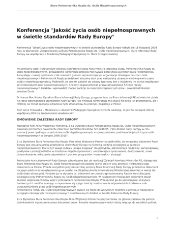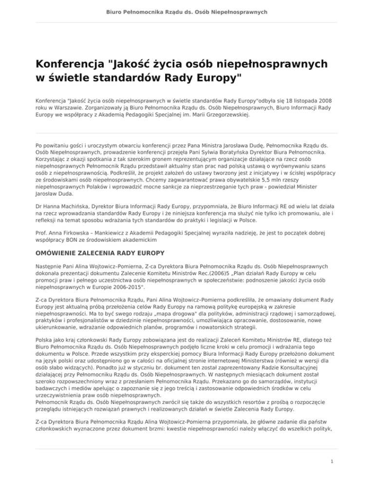 Biuro Pełnomocnika Rządu ds. Osób Niepełnosprawnych Konferencja "Jakość życia osób niepełnosprawnych w świetle standardów Rady Europy" Konferencja "Jakość życia osób niepełnosprawnych w świetle standardów Rady Europy"odbyła się 18 listopada 2008 roku w Warszawie. Zorganizowały ją Biuro Pełnomocnika Rządu ds. Osób Niepełnosprawnych, Biuro Informacji Rady Europy we współpracy z Akademią Pedagogiki Specjalnej im. Marii Grzegorzewskiej. Po powitaniu gości i uroczystym otwarciu konferencji przez Pana Ministra Jarosława Dudę, Pełnomocnika Rządu ds. Osób Niepełnosprawnych, prowadzenie konferencji przejęła Pani Sylwia Boratyńska Dyrektor Biura Pełnomocnika. Korzystając z okazji spotkania z tak szerokim gronem reprezentującym organizacje działające na rzecz osób niepełnosprawnych Pełnomocnik Rządu przedstawił aktualny stan prac nad polską ustawą o wyrównywaniu szans osób z niepełnosprawnością. Podkreślił, że projekt założeń do ustawy tworzony jest z inicjatywy i w ścisłej współpracy ze środowiskami osób niepełnosprawnych. Chcemy zagwarantować prawa obywatelskie 5,5 mln rzeszy niepełnosprawnych Polaków i wprowadzić mocne sankcje za nieprzestrzeganie tych praw - powiedział Minister Jarosław Duda. Dr Hanna Machińska, Dyrektor Biura Informacji Rady Europy, przypomniała, że Biuro Informacji RE od wielu lat działa na rzecz wprowadzania standardów Rady Europy i że niniejsza konferencja ma służyć nie tylko ich promowaniu, ale i refleksji na temat sposobu wdrażania tych standardów do praktyki i legislacji w Polsce. Prof. Anna Firkowska – Mankiewicz z Akademii Pedagogiki Specjalnej wyraziła nadzieję, że jest to początek dobrej współpracy BON ze środowiskiem akademickim OMÓWIENIE ZALECENIA RADY EUROPY Następnie Pani Alina Wojtowicz–Pomierna, Z-ca Dyrektora Biura Pełnomocnika Rządu ds. Osób Niepełnosprawnych dokonała prezentacji dokumentu Zalecenie Komitetu Ministrów Rec.(2006)5 „Plan działań Rady Europy w celu promocji praw i pełnego uczestnictwa osób niepełnosprawnych w społeczeństwie: podnoszenie jakości życia osób niepełnosprawnych w Europie 2006-2015". Z-ca Dyrektora Biura Pełnomocnika Rządu, Pani Alina Wojtowicz–Pomierna podkreśliła, że omawiany dokument Rady Europy jest aktualną próbą przełożenia celów Rady Europy na ramową politykę europejską w zakresie niepełnosprawności. Ma to być swego rodzaju „mapa drogowa" dla polityków, administracji rządowej i samorządowej, praktyków i profesjonalistów w dziedzinie niepełnosprawności, umożliwiająca opracowanie, dostosowanie, nowe ukierunkowanie, wdrażanie odpowiednich planów, programów i nowatorskich strategii. Polska jako kraj członkowski Rady Europy zobowiązana jest do realizacji Zaleceń Komitetu Ministrów RE, dlatego też Biuro Pełnomocnika Rządu ds. Osób Niepełnosprawnych podjęło liczne kroki w celu promocji i wdrażania tego dokumentu w Polsce. Przede wszystkim przy eksperckiej pomocy Biura Informacji Rady Europy przełożono dokument na język polski oraz udostępniono go w całości na oficjalnej stronie internetowej Ministerstwa (również w wersji dla osób słabo widzących). Ponadto już w styczniu br. dokument ten został zaprezentowany Radzie Konsultacyjnej działającej przy Pełnomocniku Rządu ds. Osób Niepełnosprawnych. W następnych miesiącach dokument został szeroko rozpowszechniony wraz z przesłaniem Pełnomocnika Rządu. Przekazano go do samorządów, instytucji badawczych i mediów apelując o zapoznanie się z jego treścią i zastosowanie odpowiednich środków w celu urzeczywistnienia praw osób niepełnosprawnych. Pełnomocnik Rządu ds. Osób Niepełnosprawnych zwrócił się także do wszystkich resortów z prośbą o rozpoczęcie przeglądu istniejących rozwiązań prawnych i realizowanych działań w świetle Zalecenia Rady Europy. Z-ca Dyrektora Biura Pełnomocnika Rządu Alina Wojtowicz-Pomierna przypomniała, że główne zadanie dla państw członkowskich wyznaczone przez dokument brzmi: kwestie niepełnosprawności należy włączyć do wszelkich polityk, 1 Biuro Pełnomocnika Rządu ds. Osób Niepełnosprawnych działań legislacyjnych i praktyki krajowej tak, aby umożliwić osobom niepełnosprawnym pełną integrację i rzeczywiste uczestnictwo w życiu społecznym. Prelegentka przedstawiła kluczowe pojęcia dla rozumienia treści Zalecenia Rady Europy mówiąc o konieczności poprawy jakości życia osób niepełnosprawnych, która jest generalnie niezadowalająca w porównaniu z sytuacją osób pełnosprawnych. Chodzi o szeroką rozumianą integrację osób niepełnosprawnych, ich aktywny udział w życiu publicznym, wzmocnienie równości szans i wyeliminowanie przejawów dyskryminacji, które jeszcze mogą mieć miejsce. Cały dokument osadzony jest w kontekście Praw człowieka i akcentuje takie wartości jak: godność, autonomia i samostanowienie. Istotna wartość tego dokumentu polega na tym, że może on dostarczyć praktycznych narzędzi budowania krajowych strategii pełnego uczestnictwa osób niepełnosprawnych w życiu publicznym, choć oczywiście sposób jego adoptowania zależy od możliwości, zasobów i kontekstu kulturowego danego kraju. Szczególnym walorem dokumentu jest także zwrócenie uwagi na problemy grup osób niepełnosprawnych zagrożonych szczególnie negatywnymi zjawiskami i wykluczeniem społecznym. Ponadto Rada Europy zachęca państwa członkowskie, aby potrzeby osób niepełnosprawnych były zaspokajane poprzez wysokiej jakości usługi i odpowiednie łączenie istniejących środków (płynących z różnych źródeł) w celu realizacji konkretnych przedsięwzięć. Celem strategicznym dokumentu „Plan działań Rady Europy w celu promocji praw i pełnego uczestnictwa osób niepełnosprawnych w społeczeństwie: podnoszenie jakości życia osób niepełnosprawnych w Europie 2006-2015" jest dostarczenie państwom członk