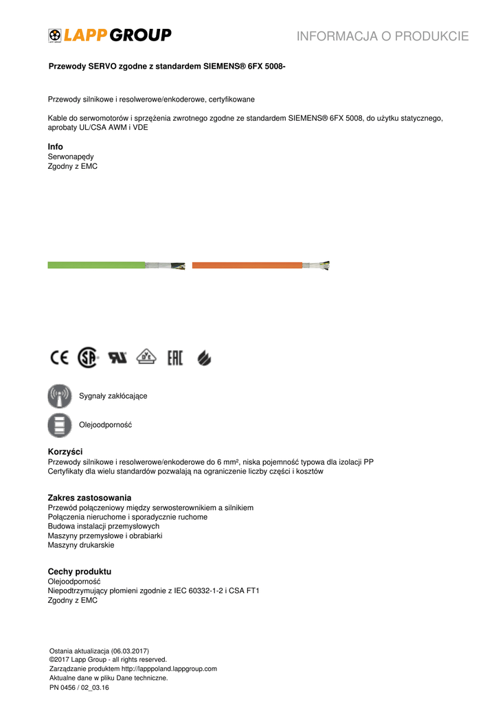 INFORMACJA O PRODUKCIE Przewody SERVO zgodne z standardem SIEMENS® 6FX 5008- Przewody silnikowe i resolwerowe/enkoderowe, certyfikowane Kable do serwomotorów i sprzężenia zwrotnego zgodne ze standardem SIEMENS® 6FX 5008, do użytku statycznego, aprobaty UL/CSA AWM i VDE Info Serwonapędy Zgodny z EMC Sygnały zakłócające Olejoodporność Korzyści Przewody silnikowe i resolwerowe/enkoderowe do 6 mm², niska pojemność typowa dla izolacji PP Certyfikaty dla wielu standardów pozwalają na ograniczenie liczby części i kosztów Zakres zastosowania Przewód połączeniowy między serwosterownikiem a silnikiem Połączenia nieruchome i sporadycznie ruchome Budowa instalacji przemysłowych Maszyny przemysłowe i obrabiarki Maszyny drukarskie Cechy produktu Olejoodporność Niepodtrzymujący płomieni zgodnie z IEC 60332-1-2 i CSA FT1 Zgodny z EMC Ostania aktualizacja (06.03.2017) ©2017 Lapp Group - all rights reserved. Zarządzanie produktem http://lapppoland.lappgroup.com Aktualne dane w pliku Dane techniczne. PN 0456 / 02_03.16 INFORMACJA O PRODUKCIE Przewody SERVO zgodne z standardem SIEMENS® 6FX 5008- Normy i aprobaty Przewody zasilające: rejestracja VDE UL/CSA AWM Style 2570 Przewody sygnałowe: UL/CSA AWM Style 2502 UL File No. E63634 Budowa produktu Budowa według standardu SIEMENS® 6FX 5008 Izolacja żyły: do przekroju 6 mm² (włącznie): PP, od przekroju 10mm²: PVC Żyły i pary skręcone razem Oplot z ocynowanych drucików miedzianych Płaszcz ze specjalnej mieszanki na bazie PVC Przewody sygnałowe: zielone (RAL 6018) Przewody do silników i serwomotorów: kolor pomarańczowy (RAL 2003) Dane techniczne Klasyfikacja: ETIM 5.0 Class-ID: EC000104 Opis klasy ETIM 5.0: Przewód sterowniczy Budowa żyły: Z cienkich drucików według VDE 0295, klasa 5/IEC 60228, klasa 5 Minimalny promień gięcia: Połączenia nieruchome: 5 x średnica zewnętrzna Dla połączeń ruchomych: 15 x średnica zewnętrzna Napięcie nominalne: Przewody sygnałowe: 30 V AC (IEC)30 V AC/DC (UL/CSA) Przewody zasilające:- żyły zasilające: U0/U 600/1000 V (IEC)1000 V (UL/CSA)- żyły sterownicze: 30 V AC (IEC)1000 V (UL/CSA) Napięcie próbne: Przewody zasilające: żyły zasilające: 4000 V żyły sterownicze: 2000 V Przewody sygnałowe: 500 V Zakres temperatury: Połączenia nieruchome: od -20°C do +80°C Połączenia ruchome: od -0°C do +60°C Wskazówka Wszystkie podane wartości dotyczące produktów są wartościami nominalnymi (o ile nie wskazano inaczej). Inne wartości, takie jak np. tolerancje mogą być przedstawione na zamówienie (jeżeli są dostępne i przeznaczone do publikacji). Standardowe odcinki proszę sprawdzić na: www.lapppolska.pl Rodzaj opakowania: krążek ≤ 30 kg lub ≤ 250 m, w przeciwnym razie bęben Prosimy określić wielkość opakowania (np. 1 x 500 m bęben lub 5 x 100 m krążek) Nazwy produktów firmy Siemens (6FX5002/5008, 6FX7002/7008, 6FX8002/8008) są zarejestrowanymi znakami towarowymi firmy Siemens AG i służą tylko do celów porównawczych. DESINA® jest zastrzeżoną marką Związku Niemieckich Fabryk Obrabiarek Numer katalogowy odnosi się do oryginalnych produktów firmy LAPP Fotografie nie mogą być używane do wymiarowania oraz nie stanowią szczegółowego odwzorowania przedstawionych produktów. * Podane ceny to ceny netto bez podatku VAT i dodatkowych opłat. Sprzedaż klientom biznesowym. Ostania aktualizacja (06.03.2017) ©2017 Lapp Group - all rights reserved. Zarządzanie produktem http://lapppoland.lappgroup.com Aktualne dane w pliku Dane techniczne. PN 0456 / 02_03.16 Powered by TCPDF (www.tcpdf.org) Numer referencyjny produktu Średnica zewnętrzna [mm] Indeks miedzi [kg/km] Waga [kg/km] 0025724 4 x 2 x 0,38 + 4 x 0,5 6FX5008-1BD21 9 76,4 120 0025725 3 x (2 x 0,14) + 4 x 0,14 + 2 x 6FX5008-1BD41 0,5 8,9 63 100 0025726 3 x (2 x 0,14) + 4 x 0,14 + 2 x 6FX5008-1BD51 0,5 + 4 x 0,23 9,5 69 139 00257001 4 G 1,5 6FX5008-1BB11 LC 8 88 131 00257011 4 G 2,5 6FX5008-1BB21 LC 9,6 132 219 00257021 4G4 6FX5008-1BB31 LC 11 195 312 00257031 4G6 6FX5008-1BB41 LC 13,1 280 380 0025704 4 G 10 6FX5008-1BB51 19,3 445 620 0025705 4 G 16 6FX5008-1BB61 23,3 715 1060 0025706 4 G 25 6FX5008-1BB25 26,9 1110 1640 0025707 4 G 35 6FX5008-1BB35 30,3 1540 2310 0025708 4 G 50 6FX5008-1BB50 36,5 2160 3240 00257151 4 G 1,5 + (2 x 1,5) 6FX5008-1BA11 LC 10,4 150 248 00257161 4 G 2,5 + (2 x 1,5) 6FX5008-1BA21 LC 12 194 310 00257171 4 G 4 + (2 x 1,5) 6FX5008-1BA31 LC 13,6 272 445 00257181 4 G 6 + (2 x 1,5) 6FX5008-1BA41 LC 15,6 351 554 0025719 4 G 10 + (2 x 1,5) 6FX5008-1BA51 21 536 806 Przewody sygnałowe Przewody silnikowe Serwoprzewody INFORMACJA O PRODUKCIE Liczba żył i przekrój [mm²] Przewody SERVO zgodne z standardem SIEMENS® 6FX 5008- Ostania aktualizacja (06.03.2017) ©2017 Lapp Group - all rights reserved. Zarządzanie produktem http://lapppoland.lappgroup.com Aktualne dane w pliku Dane techniczne. PN 0456 / 02_03.16 Powered by TCPDF (www.tcpdf.org) Numer katalogowy