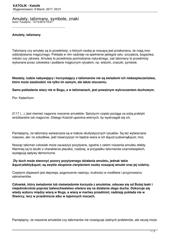 KATOLIK - Katolik Wygenerowano: 8 March, 2017, 03:21 Amulety, talizmany, symbole, znaki Autor: Faustyna - 12/14/2010 15:07 _____________________________________ Amulety, talizmany Talizmany czy amulety są to przedmioty, o których osoba je nosząca jest przekonana, że mają moc oddziaływania magicznego. Pokłada w nim nadzieje na spełnienie jakiegoś celu: szczęścia, bogactwa, miłości czy zdrowia. Amulety to przedmioty pochodzenia naturalnego, zaś talizmany to przedmioty wykonane przez człowieka i poddane magicznym rytuałom, np. wisiorki, znaczki, symbole. Niestety, ludzie nabywający i korzystający z talizmanów nie są świadomi ich niebezpieczeństwa, które może zaszkodzić nie tylko im samym, ale także otoczeniu. Samo pokładanie wiary nie w Bogu, a w talizmanach, jest poważnym wykroczeniem duchowym. Por: Katechizm: 2117 (...) Jest również naganne noszenie amuletów. Spirytyzm często pociąga za sobą praktyki wróżbiarskie lub magiczne. Dlatego Kościół upomina wiernych, by wystrzegali się ich. Pamiętajmy, że talizmany wytwarzane są w trakcie okultystycznych rytuałów. Są też wytwarzane masowo, ale i te szkodliwe, jeśli towarzyszyć im będzie wiara w ich "cudowną" moc. Nosząc talizman człowiek może zauważyć pozytywne, zgodne z celem noszenia amuletu efekty. Niemniej są to skutki o charakterze placebo, rzadziej, w przypadku talizmanów czarnoksięskich, występują wpływy demoniczne. Zły duch może stworzyć pozory pozytywnego działania amuletu, jednak takie "efekty" są zwykle okupione cierpieniem osoby noszącej amulet oraz jej rodziny. Częstymi objawami jest depresja, pogorszenie nastroju, trudności w modlitwie i przyjmowaniu sakramentów. Człowiek, który świadomie lub nieświadomie korzysta z amuletów, odsuwa się od Bożej łaski i niejednokrotnie poprzez bałwochwalstwo otwiera się na działanie złego ducha. Dokonuje się wtedy wyboru między wiarą w Boga, a wiarą w martwy przedmiot; nadzieję pokłada nie w Stwórcy, lecz w przedmiocie albo w tajemnych mocach. Pamiętajmy, że noszenia amuletów czy talizmanów nie rozwiązuje żadnych problemów, ale raczej może 1/3 KATOLIK - Katolik Wygenerowano: 8 March, 2017, 03:21 ich przysparzać. Przed nimi ostrzegają także księża egzorcyści, których praktyka obejmuje także egzorcyzmowanie przedmiotów. ============================================================================ Odp: Amulety, talizmany Autor: sibou - 01/04/2013 22:11 _____________________________________ Witam bardzo serdecznie, Zauważyłem pewien znak na "młocie thora" są to trzy przeplatane pętle czy również ten znak uważany jest za satanistyczny? ============================================================================ Odp: Amulety, talizmany Autor: sylka1989 - 01/04/2013 23:53 _____________________________________ chyba wiem o jaim znaku mowisz jest okultystyczny.Jeśli nosisz jakieś znaki okultystyczne to wiedz ze niema w tym nic dobrego ============================================================================ Odp: Amulety, talizmany Autor: sibou - 01/05/2013 00:10 _____________________________________ Po pierwsze nie noszę i nigdy nie nosiłem żadnych znaków okultystycznych. Chodzi o to , że w nazwie zespołu, jak i w jego logu "P.O.D" (payable on death-płatne przy śmierci) ,który to tworzy muzykę chrześcijańską,ale jego muzycy otwarcie przyznają , że nie chcą być nazywani zespołem chrześcijańskim,występują te pętle. Jak to interpretować? Bardzo proszę o odpowiedź ponieważ, ten temat nurtuje mnie od dawien dawna. ============================================================================ Odp: Amulety, talizmany Autor: sylka1989 - 01/05/2013 00:40 _____________________________________ moge spojrzeć na ten znak??według mni ejest okultystyczny.Czasami można nieświadomie nosić i o tym niewiedzieć ============================================================================ Odp: Amulety, talizmany Autor: sibou - 01/05/2013 00:56 2/3 KATOLIK - Katolik Wygenerowano: 8 March, 2017, 03:21 _____________________________________ independent.pl/images/old_files/root/muzyka/cd/p/pod_logo.jpg www.samliquidation.com/images/podicon.gif ============================================================================ Odp: Amulety, talizmany Autor: sylka1989 - 01/05/2013 17:02 _____________________________________ tak to jest ten znak co myślałam jest zaliczany do poważnych zagrożeń duchowych miałam iśc na studia i ta uczelnia umieścila go jako logo. ============================================================================ Odp: Amulety, talizmany Autor: frater - 01/28/2013 10:21 _____________________________________ ============================================================================ 3/3