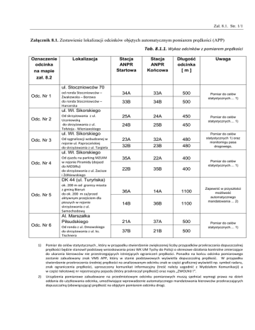 Zał. 8.1. Str. 1/1 Załącznik 8.1. Zestawienie lokalizacji odcinków objętych automatycznym pomiarem prędkości (APP) Tab. 8.1.1. Wykaz odcinków z pomiarem prędkości Oznaczenie odcinka na mapie Lokalizacja Stacja ANPR Startowa Stacja ANPR Końcowa Długość odcinka [m] Uwaga 34A 33A 500 Pomiar do celów statystycznych.... 1) 33B 34B 500 25A 24A 450 24B 25B 450 23A 32A 480 32B 23B 480 35A 22A 400 22B 35B 400 36A 14A 1100 14B 36B 1100 21A 37A 500 37B 21B 500 zał. 8.2 ul. Stoczniowców 70 Odc. Nr 1 od ronda Stoczniowców – Żwakowska – Borowa do ronda Stoczniowców – Harcerska ul. Wł. Sikorskiego Odc. Nr 2 Od skrzyżowania z ul. Uczniowską do skrzyżowania z ul. Tołstoja - Wieniawskiego ul. Wł. Sikorskiego Odc. Nr 3 Od sygnalizacji wzbudzanej w rejonie ul. Paprocańskiej do skrzyżowania z ul. Targiela Pomiar do celów statystycznych.... 1) Pomiar do celów statystycznych 1) oraz monitoringu pasa drogowego, ul. Wł. Sikorskiego Odc. Nr 4 Od zjazdu na parking MZUiM w rejonie Piramidy (dojazd do MOSIRu) do skrzyżowania z ul. Zacisze i Żółkiewskiego Pomiar do celów statystycznych.... 1) DK 44 (ul. Turyńska) Odc. Nr 5 Odc. Nr 6 ok. 200 m od granicy miasta z gminą Bieruń do ok. 200 m za/przed aktywnym przejściem dla pieszych w rejonie skrzyżowania z ul. Samochodową Al. Marszałka Piłsudskiego Od ronda z ul. Dmowskiego do skrzyżowania z ul. ks. Tischnera Zapewnić w przyszłości możliwość automatycznego mandatowania ... 2) Pomiar do celów statystycznych.... 1) 1) Pomiar do celów statystycznych , który w przypadku stwierdzenie zwiększonej liczby przypadków przekraczania dopuszczalnej prędkości będzie stanowił podstawę wnioskowania przez WK UM Tychy do Policji o okresowe działania kontrolne zmierzające do ukarania kierowców nie przestrzegających istniejących ograniczeń prędkości. Ponadto na końcu odcinka pomiarowego zostanie zabudowany znak VMS APP, który w stanie podstawowych wyświetla dopuszczalną prędkość. W przypadku stwierdzenie przekroczenia średniej prędkości na analizowanym odcinku znak w części graficznej wyświetli np. symbol radaru, znak ograniczenia prędkości, uproszczony komunikat informacyjny (treść należy uzgodnić z Wydziałem Komunikacji) a w części tekstowej nr rejestracyjny pojazdu (który przekroczył prędkość) oraz napis „ZWOLNIJ !”. 2) Urządzenia pomiarowe zabudowane na przedmiotowym odcinku pomiarowych muszą spełniać wymogi prawa na dzień oddania do użytkowania odcinka, umożliwiające wprowadzenie automatycznego mandatowania kierowców przekraczających dopuszczalną (obowiązującą) prędkość na objętym pomiarem odcinku drogi.