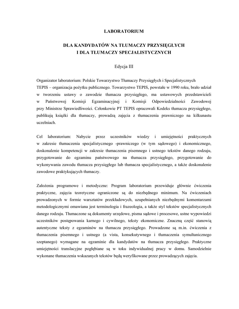 LABORATORIUM DLA KANDYDATÓW NA TŁUMACZY PRZYSIĘGŁYCH I DLA TŁUMACZY SPECJALISTYCZNYCH Edycja III Organizator laboratorium: Polskie Towarzystwo Tłumaczy Przysięgłych i Specjalistycznych TEPIS – organizacja pożytku publicznego. Towarzystwo TEPIS, powstałe w 1990 roku, brało udział w tworzeniu ustawy o zawodzie tłumacza przysięgłego, ma ustawowych przedstawicieli w Państwowej Komisji Egzaminacyjnej i Komisji Odpowiedzialności Zawodowej przy Ministrze Sprawiedliwości. Członkowie PT TEPIS opracowali Kodeks tłumacza przysięgłego, publikują książki dla tłumaczy, prowadzą zajęcia z tłumaczenia prawniczego na kilkunastu uczelniach. Cel laboratorium: Nabycie przez uczestników wiedzy i umiejętności praktycznych w zakresie tłumaczenia specjalistycznego -prawniczego (w tym sądowego) i ekonomicznego, doskonalenie kompetencji w zakresie tłumaczenia pisemnego i ustnego tekstów danego rodzaju, przygotowanie do egzaminu państwowego na tłumacza przysięgłego, przygotowanie do wykonywania zawodu tłumacza przysięgłego lub tłumacza specjalistycznego, a także doskonalenie zawodowe praktykujących tłumaczy. Założenia programowe i metodyczne: Program laboratorium przewiduje głównie ćwiczenia praktyczne, zajęcia teoretyczne ograniczone są do niezbędnego minimum. Na ćwiczeniach prowadzonych w formie warsztatów przekładowych, uzupełnianych niezbędnymi komentarzami metodologicznymi omawiana jest terminologia i frazeologia, a także styl tekstów specjalistycznych danego rodzaju. Tłumaczone są dokumenty urzędowe, pisma sądowe i procesowe, ustne wypowiedzi uczestników postępowania karnego i cywilnego, teksty ekonomiczne. Znaczną część stanowią autentyczne teksty z egzaminów na tłumacza przysięgłego. Prowadzone są m.in. ćwiczenia z tłumaczenia pisemnego i ustnego (a vista, konsekutywnego i tłumaczenia symultanicznego szeptanego) wymagane na egzaminie dla kandydatów na tłumacza przysięgłego. Praktyczne umiejętności translacyjne pogłębiane są w toku indywidualnej pracy w domu. Samodzielnie wykonane tłumaczenia wskazanych tekstów będą weryfikowane przez prowadzących zajęcia. Zajęcia prowadzą: doświadczeni tłumacze przysięgli, w tym nauczyciele akademiccy, z udziałem konsultantów – prawników. Uczestnicy: absolwenci studiów wyższych II stopnia dowolnego kierunku oraz praktykujący tłumacze biegle władający językiem obcym oraz polskim. Grupy językowe: angielska, francuska, niemiecka, rosyjska, włoska – w zależności od liczby zgłoszeń. Czas trwania laboratorium: 9 miesięcy. Zajęcia odbywają się systemem weekendowym (w soboty i niedziele) 1 raz w miesiącu. Łącznie odbędzie się 9 zjazdów po 16 godzin dydaktycznych (144 godziny). Limit miejsc: 15-17 osób w grupie językowej. Miejsce zajęć: Centrum Konferencyjne WILCZA. Warszawa ul. Wilcza 9 Proponowane terminy zjazdów: zjazd 1. 19-20 X 2013 r., zjazd 2. 16-17 XI 2013 r., zjazd 3. 7-8 XII 2013 r., zjazd 4. 11-12 I 2013 r., zjazd 5. 8-9 II 2014 r., zjazd 6. 1-2 III 2014 r., zjazd 7. 22-23 III 2014 r., zjazd 8. 17-18 V 2014 r., zjazd 9. 7-8 VI 2014 r. *Uwaga* - termin 7 zjazdu może zostać przesunięty na kwiecień Odpłatność: 1. Opłata jednorazowa: 4 500 zł płatna do 27 września 2013 r. 2. Opłata w dwóch ratach: 5 000 zł. I rata 2 500 zł płatna do 27 września 2013, II rata 2 500 zł płatna do 15 stycznia 2014 r. 3. Opłata jednorazowa dla członków PT TEPIS: 4 200 zł płatna do 27 września 2013 r. 4. Opłata w dwóch ratach dla członków PT TEPIS: 4 500 zł. I rata 2 250 zł płatna do 28 września 2013 r., II rata 2 250 zł płatna do 15 stycznia 2014 r. Wpłaty na konto PT TEPIS: 43 1020 1026 0000 1802 0214 2495, PKO BP II O/Warszawa Zgłoszenia: Druk zgłoszenia, umieszczony na stronie www.tepis.org.pl należy wypełnić i wysłać na adres: [email protected] do dnia 27. września 2013 r. O przyjęciu decyduje kolejność zgłoszeń. 2 Zaświadczenia: Po ukończeniu laboratorium uczestnicy otrzymają zaświadczenie wydane przez Kolegium Doskonalenia Zawodowego Polskiego Towarzystwa Tłumaczy Przysięgłych i Specjalistycznych TEPIS. Opiekun naukowy Laboratorium: dr Danuta Kierzkowska Koordynatorzy grup językowych: Grupa angielska – mgr Zofia Rybińska Grupa francuska – mgr Barbara Bosek-Szeska Grupa niemiecka – dr Marta Czyżewska Grupa rosyjska – dr Edward Szędzielorz Grupa włoska – mgr Teresa Skrodzka Grupa hiszpańska – (podany wkrótce) Sekretariat: Biuro PT TEPIS, ul. Krasińskiego 16, lok. 134, 01-581 Warszawa tel. +48 (0)22 8394952, faks +48 (0)22 8394952, e-mail: [email protected], website: www.tepis.org.pl Prawa autorskie autorów tekstów i materiałów: Organizatorzy zastrzegają sobie prawa autorskie do udostępnianych tekstów i innych materiałów, uczestnicy zobowiązują się nie publikować ich ani nie udostępniać osobom trzecim. RAMOWY PROGRAM NAUCZANIA Moduł 1. Zawód tłumacza przysięgłego – podstawy prawne i praktyka zawodowa Zajęcia teoretyczne prowadzone dla połączonych grup językowych. Liczba godzin: 16 Treści nauczania: Wstęp do metodologii przekładu. Ustawa o zawodzie tłumacza przysięgłego. Rozporządzenia Ministra Sprawiedliwości dotyczące tłumacza przysięgłego. Etyka zawodu tłumacza przysięgłego. Egzamin państwowy na tłumacza przysięgłego. Kodeks tłumacza przysięgłego – translatoryczne i formalnoprawne zasady tłumaczenia dokumentów poświadczonych. Status prawny i podatkowy tłumacza. Kancelaria tłumacza. Współczesne narzędzia wspomagające pracę tłumacza. 3 Moduł 2. Tłumaczenie tekstów urzędowych, prawniczych i notarialnych Warsztaty przekładowe prowadzone w grupach językowych. Liczba godzin: 36 Treści nauczania: Zapoznanie z podstawową terminologią, frazeologią i stylem tekstów danego rodzaju. Tłumaczenie: fragmentów polskich ustaw (w tym Konstytucji RP), dokumentów stanu cywilnego, dokumentów poświadczających wykształcenie i 