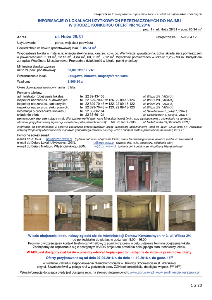 załącznik nr 1 do ogłoszenia-regulaminu konkursu ofert na najem lokali użytkowych INFORMACJE O LOKALACH UŻYTKOWYCH PRZEZNACZONYCH DO NAJMU W DRODZE KONKURSU OFERT NR 10/2016 poz. 1 - ul. Hoża 29/31 – pow. 85,34 m2 Adres: ul. Hoża 29/31 Usytuowanie: parter, wejście z podwórza Obręb/działka: 5-05-04 / 2 Powierzchnia całkowita (podstawowa) lokalu: 85,34 m 2. Wyposażenie lokalu w instalacje: energia elektryczna, kan, zw, ccw, co. Wentylacja: grawitacyjna. Lokal składa się z pomieszczeń o powierzchniach: 6,19 m 2, 12,13 m 2, 4,84 m2, 60,06 m2, 2,12 m 2. Wysokość pomieszczeń w lokalu: 2,25-2,93 m. Budynkiem zarządza Wspólnota Mieszkaniowa. Poprzednia działalność w lokalu: punkt pralniczy. Minimalna stawka czynszu netto za pow. podstawową: 30,00 zł/m2 + VAT Przeznaczenie lokalu: usługowe, biurowe, magazyn/archiwum. Wadium: 2.560,20 zł Okres obowiązywania umowy najmu: 3 lata. Pomocne telefony: administrator (obejrzenie lokalu): tel. 22 89-13-138 ul. Wilcza 2/4 [ ADK-3 ] inspektor nadzoru ds. budowlanych: tel. 22 629-70-43 w.126, 22 89-13-126 ul. Wilcza 2/4 [ ADK-3 ] inspektor nadzoru ds. sanitarnych: tel. 22 629-70-43 w.122, 22 89-13-122 ul. Wilcza 2/4 [ ADK-3 ] inspektor nadzoru ds. elektrycznych: tel. 22 629-70-43 w.123, 22 89-13-123 ul. Wilcza 2/4 [ ADK-3 ] informacja o procedurze konkursu: tel. 22 33-66-164 ul. Szwoleżerów 5, pokój 7 [ ZGN ] składanie ofert: tel. 22 33-66-124 ul. Szwoleżerów 5, pokój 8 [ ZGN ] pełnomocnik reprezentujący m.st. Warszawę we Wspólnocie Mieszkaniowej ( m.in. przy występowaniu o zezwolenie na sprzedaż alkoholu, przy planowanej ingerencji w części wspólne nieruchomości): tel. 22 62-30-106 ul. Mokotowska 55 [ Dział NW ZGN ] Informacja od pełnomocnika w sprawie zastrzeżeń przedstawionych przez Wspólnotę Mieszkaniową (stan na dzień 23.08.2016 r.): „realizacja uchwały Wspólnoty Mieszkaniowej w sprawie generalnego remontu elewacji wraz z dachem została przeniesiona na wiosnę 2017 r.” Pomocne adresy e-mail: e-mail do ADK-3: [email protected] (pytania dot. m.in. obejrzenia lokalu, stanu technicznego lokalu, opłat za media, rzutów lokalu) e-mail do Działu Lokali Użytkowych ZGN: [email protected] (pytania dot. m.in. procedury, składania ofert) e-mail do Działu Nadzoru Właścicielskiego ZGN: [email protected] (pytania dot. kontaktu ze Wspólnotą Mieszkaniową) W celu obejrzenia lokalu należy zgłosić się do Administracji Domów Komunalnych nr 3, ul. Wilcza 2/4 od poniedziałku do piątku, w godzinach 8:00 - 16:00 Prosimy o wcześniejszy kontakt telefoniczny/mailowy z administratorem w celu ustalenia terminu obejrzenia lokalu. Zachęcamy do zapoznania się z dostępnym w ADK projektem protokołu opisującego stan techniczny lokalu. W ADK jest dostępny rzut lokalu – prosimy odebrać kopię – jest to niezbędne do złożenia prawidłowej oferty. Oferty przyjmowane są od dnia 07.09.2016 r. do dnia 11.10.2016 r. do godz. 1600 w siedzibie Zakładu Gospodarowania Nieruchomościami w Dzielnicy Śródmieście m.st. Warszawy przy ul. Szwoleżerów 5 w pokoju nr 8 w godzinach pracy ZGN (od poniedziałku do piątku, w godz. 800-1600). Pełna informacja dotycząca oferty jest dostępna m.in. na stronach internetowych: www.zgn.waw.pl, www.srodmiescie.warszawa.pl 1 z 23 załącznik nr 1 do ogłoszenia-regulaminu konkursu ofert na najem lokali użytkowych INFORMACJE O LOKALACH UŻYTKOWYCH PRZEZNACZONYCH DO NAJMU W DRODZE KONKURSU OFERT NR 10/2016 poz. 2 - ul. M. Kopernika 25 – pow. 22,96 m 2 Adres: ul. M. Kopernika 25 Usytuowanie: parter, wejście z ulicy od strony skarpy Obręb/działka: 5-04-05 / 61/1 Powierzchnia całkowita (podstawowa) lokalu: 22,96 m 2. Wyposażenie lokalu w instalacje: energia elektryczna, co, ccw, wod-kan. Brak licznika elektrycznego. Wentylacja: grawitacyjna. Lokal składa się z pomieszczeń o powierzchniach: 21,47 m 2 (sala sprzedaży), 0,71 m2 (korytarz przy wc), 0,78 m 2 (wc). Wysokość pomieszczeń w lokalu: 3,53 m. Budynek w 100% stanowi własność m.st. Warszawy. Konserwator Zabytków: układ - rejestr zabytków - ochrona prawna - nr rej. 195. W zainteresowaniu Konserwatora Zabytków: budynek – gminna ewidencja zabytków. Zalecenia konserwatorskie dot. lokalu (Stołeczny Konserwator Zabytków – pismo z dnia 15.04.2015 r.): „Przeznaczone do wymiany drzwi wejściowe do lokalu użytkowego znajdują się w elewacji bocznej (północnej) przedmiotowej kamienicy. Stolarka drzwiowa wszystk ich lokali użytkowych parteru (z wyjątkiem drugich drzwi w parterze elewacji północnej wykonanych z blachy) jest spójna stylis tycznie i zgodna z odtworzonym, oryginalnym podziałem. Skrzydła drzwiowe są przeszklone w części górnej z listwą i profilowaną płyciną w częśc i dolnej. Nad skrzydłem znajduje się trójdzielne naświetle o profilowanych ramkach. W odróżnieniu od lokali frontowych zaopatrzonych w witryny przedmiotowa stolarka na prawo od skrzydła drzwiowego ma wąskie okno z naświetlem i partią dolną wypełnioną płytą drewnianą. Organ konserw atorski zaleca odtworzeniową wymianę przedmiotowej stolarki, tj. z zachowaniem materiału, naturalnej kolorystyki, kształtów, proporcji, podziałów oraz detalu. Z uwagi na fakt, iż przedmiotowe drzwi narażone są na niszczące działanie czynników atmosferycznych zaleca się również zabezp ieczenie nowej stolarki drzwiowej bezbarwnym lakierem hydrofobowym.” Poprzednia działalność w lokalu: sklep warzywny kolonialny. Minimalna stawka czynszu netto za pow. podstawową: 30,00 zł/m2 + VAT Przeznaczenie lokalu: handlowe, usługowe w tym pracownia artystyczna, biurowe, magazyn/archiwum. Wadium: 2.066,40 zł Okres obowiązywania umowy najmu: 3 lata. Pomocne telefony: administrator (obejrzenie lokalu): inspektor nadzoru ds. budowlanych: inspektor nadzoru ds. sanitarnych: inspektor nadzoru ds. elektrycznych: informacja o procedurze konkursu: składanie ofert: tel. 22 826-17-74 w.132, 22 66-00-132 tel. 22 66-00-
