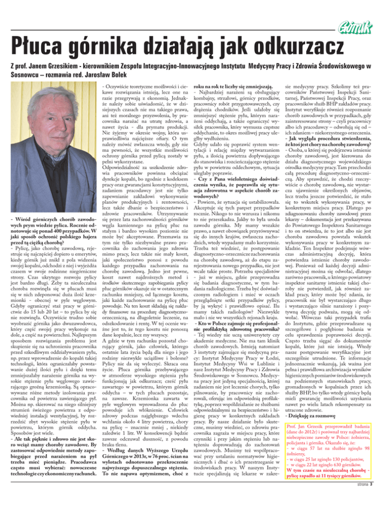 Płuca górnika działają jak odkurzacz Z prof. Janem Grzesikiem - kierownikiem Zespołu Integracyjno-Innowacyjnego Instytutu Medycyny Pracy i Zdrowia Środowiskowego w Sosnowcu – rozmawia red. Jarosław Bolek - Wśród górniczych chorób zawodowych prym wiedzie pylica. Rocznie odnotowuje się ponad 400 przypadków. W jaki sposób ochronić polskiego hajera przed tą ciężką chorobą? - Pylicę, jako chorobę zawodową, rejestruje się najczęściej dopiero u emerytów, kiedy górnik już znikł z pola widzenia swojej kopalni, odchodzi z niej i wyjeżdża czasem w swoje rodzinne niegórniczne strony. Czas ukrytego rozwoju pylicy jest bardzo długi. Żeby ta nieuleczalna choroba rozwinęła się w płucach musi się w nich zdeponować duża ilość krzemionki - obecnej w pyle węglowym. Gdyby ograniczyć staż pracy w górnictwie do 15 lub 20 lat – to pylica by się nie rozwinęła. Oczywiście trudno sobie wyobrazić górnika jako dwuzawodowca, który część swojej pracy wykonuje na dole, a część na powierzchni. Najlepszym sposobem rozwiązania problemu jest skupienie się na uchronieniu pracownika przed szkodliwym oddziaływaniem pyłu, np. przez wprowadzenie do kopalń takiej technologii, która ograniczałaby powstawanie dużej ilości pyłu i dzięki temu zmniejszałaby narażenie górnika na wysokie stężenie pyłu węglowego zawierającego groźną krzemionką. Są opracowywane różne metody izolowania pracownika od powietrza zawierającego pył. Można np. skierować na niego silniejszy strumień świeżego powietrza z odpowiedniej instalacji wentylacyjnej, by rozrzedzić zbyt wysokie stężenie pyłu w powietrzu, którym górnik oddycha. Sposobów jest wiele. - Ale tak pięknie i zdrowo nie jest skoro wciąż mamy choroby zawodowe. By zastosować odpowiednie metody zapobiegające przed narażeniem na pył trzeba mieć pieniądze. Pracodawca często musi wybierać: nowoczesne technologie czy ekonomiczny rachunek. - Oczywiście teoretyczne możliwości i ciekawe rozwiązania istnieją, lecz one na razie przegrywają z ekonomią. Jednakże należy sobie uświadomić, że w dzisiejszych czasach nie ma takiego prawa, ani też moralnego przyzwolenia, by pracownika narażać na utratę zdrowia, a nawet życia - dla prymatu produkcji. Nie żyjemy w okresie wojny, która usprawiedliwia najcięższe ofiary. O tym należy mówić zwłaszcza wtedy, gdy nie ma pewności, że wszystkie możliwości ochrony górnika przed pylicą zostały w pełni wykorzystane. Odpowiedzialność za uszkodzenie zdrowia pracowników powinna obciążać dyrekcje kopalń, bo zgodnie z kodeksem pracy oraz gwarancjami konstytucyjnymi, zadaniem pracodawcy jest nie tylko zapewnianie zakładowi wykonywanie planów produkcyjnych i rentowności, lecz także dbanie o bezpieczeństwo i zdrowie pracowników. Utrzymywanie się przez lata zachorowalności górników węgla kamiennego na pylicę płuc na stałym i bardzo wysokim poziomie nie może być akceptowane. Przemawia za tym nie tylko niezbywalne prawo pracownika do zachowania jego zdrowia mimo pracy, lecz także nie mały koszt, jaki społeczeństwo ponosi z powodu każdego przypadku zachorowania na chorobę zawodową. Jedno jest pewne, koszt nawet najdroższych metod i środków skutecznego zapobiegania pylicy płuc górników okazuje sie w ostatecznym rachunku mniejszy, od łącznego kosztu, jaki każde zachorowanie na pylicę płuc powoduje. Na ten koszt składają się nakłady finansowe na procedurę diagnostycznoorzeczniczą, na długoletnie leczenie, na odszkodowanie i rentę. W tej ocenie ważne jest to, że tego kosztu nie ponoszą dane kopalnie, lecz my wszyscy. A gdzie w tym rachunku pozostał chorujący górnik, jako człowiek, którego ostatnie lata życia będą dla niego i jego rodziny niezwykle uciążliwe i bolesne? Pylicy nie da się wyleczyć. Skraca ona życie. Płuca górnika przebywającego w atmosferze wysokiego stężenia pyłu funkcjonują jak odkurzacz; cześć pyłu zawartego w powietrzu, którym górnik oddycha – w tych płucach pozostaje, na zawsze. Krzemionka zawarta w pyle węglowym wprowadzona do płuc powoduje ich włóknienie. Człowiek zdrowy podczas najgłębszego wdechu wchłania około 4 litry powietrza, chory na pylicę – znacznie mniej , niekiedy zaledwie 1 litr. W konsekwencji będzie zawsze odczuwał duszność, z powodu braku tlenu. - Według danych Wyższego Urzędu Górniczego w 2013r, w 76 proc. ścian na wylotach odnotowano przekroczenie najwyższego dopuszczalnego stężenia. To nie napawa optymizmem, choć z roku na rok te liczby się zmniejszają. - Najbardziej narażeni są obsługujący kombajny, strzałowi, górnicy przodków, pracownicy robót przygotowawczych, czy drążenia chodników. Jeśli udałoby się zmniejszyć stężenie pyłu, którym narażeni oddychają, a także ograniczyć wysiłek pracownika, który wymusza częstsze oddychanie, to okres możliwej pracy uległby wydłużeniu. Gdyby udało się poprawić system wentylacji i relację między wytwarzaniem pyłu, a ilością powietrza dopływającego do stanowiska i rozcieńczającego stężenie pyłu w powietrzu oddechowym, sytuacja uległaby poprawie. - Czy z Pana wieloletniego doświadczenia wynika, że poprawiła się sytuacja zdrowotna w aspekcie chorób zawodowych? - Powiem, że sytuacja się ustabilizowała. Akceptuje się tych paręset przypadków rocznie. Nikogo to nie wzrusza i nikomu to nie przeszkadza. Jakby to była uroda zawodu górnika. My mamy wszakże prawo, a nawet obowiązek przyrównywać się do innych krajów, zwłaszcza zachodnich, wtedy wypadamy mało korzystnie. Trzeba też wiedzieć, że postępowanie diagnostyczno-orzecznicze zachorowania na chorobę zawodową, aż do etapu zarejestrowania nowego przypadku, nie jest wcale takie proste. Potrzeba specjalistów - już w miejscu, gdzie przeprowadza się badania diagnostyczne, w tym badania radiologiczne. Trzeba być doświadczonym radiologiem i mieć w oczach prz