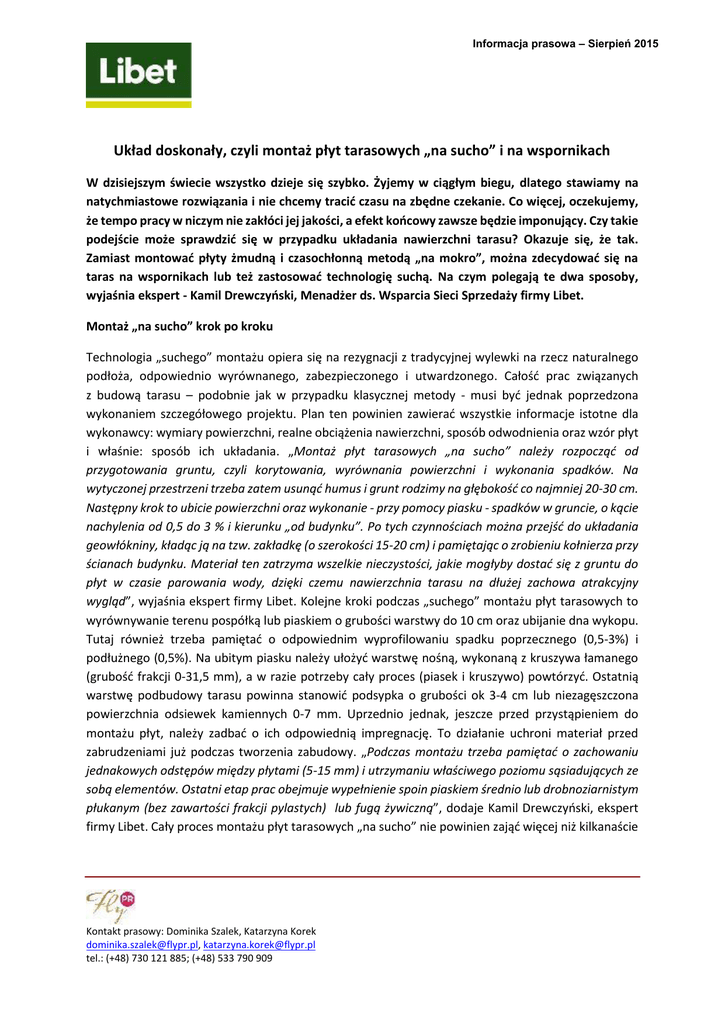 Informacja prasowa – Sierpień 2015 Układ doskonały, czyli montaż płyt tarasowych „na sucho” i na wspornikach W dzisiejszym świecie wszystko dzieje się szybko. Żyjemy w ciągłym biegu, dlatego stawiamy na natychmiastowe rozwiązania i nie chcemy tracić czasu na zbędne czekanie. Co więcej, oczekujemy, że tempo pracy w niczym nie zakłóci jej jakości, a efekt końcowy zawsze będzie imponujący. Czy takie podejście może sprawdzić się w przypadku układania nawierzchni tarasu? Okazuje się, że tak. Zamiast montować płyty żmudną i czasochłonną metodą „na mokro”, można zdecydować się na taras na wspornikach lub też zastosować technologię suchą. Na czym polegają te dwa sposoby, wyjaśnia ekspert - Kamil Drewczyński, Menadżer ds. Wsparcia Sieci Sprzedaży firmy Libet. Montaż „na sucho” krok po kroku Technologia „suchego” montażu opiera się na rezygnacji z tradycyjnej wylewki na rzecz naturalnego podłoża, odpowiednio wyrównanego, zabezpieczonego i utwardzonego. Całość prac związanych z budową tarasu – podobnie jak w przypadku klasycznej metody - musi być jednak poprzedzona wykonaniem szczegółowego projektu. Plan ten powinien zawierać wszystkie informacje istotne dla wykonawcy: wymiary powierzchni, realne obciążenia nawierzchni, sposób odwodnienia oraz wzór płyt i właśnie: sposób ich układania. „Montaż płyt tarasowych „na sucho” należy rozpocząć od przygotowania gruntu, czyli korytowania, wyrównania powierzchni i wykonania spadków. Na wytyczonej przestrzeni trzeba zatem usunąć humus i grunt rodzimy na głębokość co najmniej 20-30 cm. Następny krok to ubicie powierzchni oraz wykonanie - przy pomocy piasku - spadków w gruncie, o kącie nachylenia od 0,5 do 3 % i kierunku „od budynku”. Po tych czynnościach można przejść do układania geowłókniny, kładąc ją na tzw. zakładkę (o szerokości 15-20 cm) i pamiętając o zrobieniu kołnierza przy ścianach budynku. Materiał ten zatrzyma wszelkie nieczystości, jakie mogłyby dostać się z gruntu do płyt w czasie parowania wody, dzięki czemu nawierzchnia tarasu na dłużej zachowa atrakcyjny wygląd”, wyjaśnia ekspert firmy Libet. Kolejne kroki podczas „suchego” montażu płyt tarasowych to wyrównywanie terenu pospółką lub piaskiem o grubości warstwy do 10 cm oraz ubijanie dna wykopu. Tutaj również trzeba pamiętać o odpowiednim wyprofilowaniu spadku poprzecznego (0,5-3%) i podłużnego (0,5%). Na ubitym piasku należy ułożyć warstwę nośną, wykonaną z kruszywa łamanego (grubość frakcji 0-31,5 mm), a w razie potrzeby cały proces (piasek i kruszywo) powtórzyć. Ostatnią warstwę podbudowy tarasu powinna stanowić podsypka o grubości ok 3-4 cm lub niezagęszczona powierzchnia odsiewek kamiennych 0-7 mm. Uprzednio jednak, jeszcze przed przystąpieniem do montażu płyt, należy zadbać o ich odpowiednią impregnację. To działanie uchroni materiał przed zabrudzeniami już podczas tworzenia zabudowy. „Podczas montażu trzeba pamiętać o zachowaniu jednakowych odstępów między płytami (5-15 mm) i utrzymaniu właściwego poziomu sąsiadujących ze sobą elementów. Ostatni etap prac obejmuje wypełnienie spoin piaskiem średnio lub drobnoziarnistym płukanym (bez zawartości frakcji pylastych) lub fugą żywiczną”, dodaje Kamil Drewczyński, ekspert firmy Libet. Cały proces montażu płyt tarasowych „na sucho” nie powinien zająć więcej niż kilkanaście Kontakt prasowy: Dominika Szalek, Katarzyna Korek [email protected], [email protected] tel.: (+48) 730 121 885; (+48) 533 790 909 Informacja prasowa – Sierpień 2015 godzin i można wykonać go samodzielnie. Co więcej, taka metoda jest tańsza o niemal 40% niż tradycyjny sposób układania „na mokro”, zatem można oszczędzić nie tylko czas, ale i pieniądze. Taras wentylowany – o co chodzi? Układanie tarasu wentylowanego to kolejna metoda montażu, która jest prosta, szybka i tania, a przy tym gwarantuje doskonały efekt końcowy. „Sposób ten zakłada wykorzystanie specjalnych wsporników, które ustawia się na stabilnym podłożu, a następnie na nich kładzione są płyty. Do wykonania konstrukcji nie są potrzebne specjalistyczne narzędzia, a całość prac można wykonać samodzielnie i w bardzo krótkim czasie. Co więcej, taras można nie tylko szybko i sprawnie ułożyć, ale w razie konieczności także błyskawicznie zdemontować”, mówi specjalista, Libet, Kamil Drewczyński, Menadżer ds. Wsparcia Sieci Sprzedaży firmy Libet . Z punktu widzenia inwestora ważne jest również, że dzięki zastosowaniu wsporników możliwe jest układanie pod płytami instalacji elektrycznych, alarmowych i wodnych, bez potrzeby wykonywania żmudnych prac budowlanych. Dodatkową zaletą technologii tarasu wentylowanego jest jej uniwersalność. Można wykorzystywać ją na nowych i starych wylewkach, nie zaś na gruncie. Warunek jest jeden: podłoże musi być stabilne, równe oraz ułatwiające odprowadzanie wody. Jak wygląda sam proces montażu płyt? „Pierwszym krokiem jest zabezpieczenie powierzchni przed szkodliwymi czynnikami zewnętrznymi, np. wodą opadową, wykonując hydroizolację wykorzystując np. papę termozgrzewalną. Kolejne zadanie to ustawienie wsporników z tworzyw sztucznych. W zależności od potrzeb można zastosować elementy o wysokości stałej (8 mm) lub regulowanej w zakresach 30-45, 45-70, 70-120 i 120-220 mm. Ostatni etap to już oczywiście układanie wybranych płyt tarasowych”, wyjaśnia ekspert firmy Libet, Kamil Drewczyński. Warto pamiętać, że w przypadku tarasów wentylowanych najlepiej sprawdzają się płyty o regularnych, geometrycznych kształtach, czyli kwadraty i prostokąty. Wykonanie tarasu technologią „na mokro” wymaga minimum 21-30 dni, natomiast metody alternatywne pozwalają na ukończenie prac nawet w ciągu jednej doby. Chociaż każde z tych trzech rozwiązań gwarantuje do