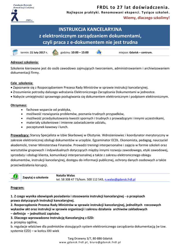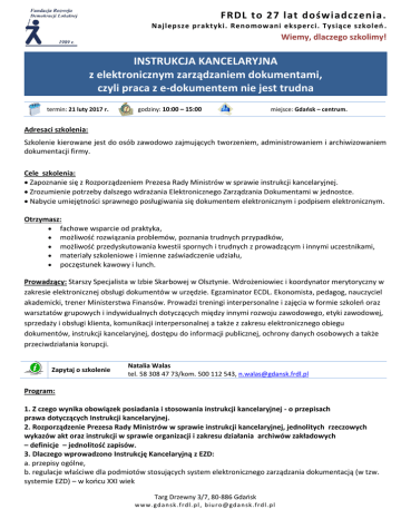 FRDL to 2 7 lat doświadczenia . Najlepsze praktyki. Renomowani eksperci. Tysiące szkoleń . Wiemy, dlaczego szkolimy! INSTRUKCJA KANCELARYJNA z elektronicznym zarządzaniem dokumentami, czyli praca z e-dokumentem nie jest trudna termin: 21 luty 2017 r. godziny: 10:00 – 15:00 miejsce: Gdańsk – centrum. Adresaci szkolenia: Szkolenie kierowane jest do osób zawodowo zajmujących tworzeniem, administrowaniem i archiwizowaniem dokumentacji firmy. Cele szkolenia: Zapoznanie się z Rozporządzeniem Prezesa Rady Ministrów w sprawie instrukcji kancelaryjnej. Zrozumienie potrzeby dalszego wdrażania Elektronicznego Zarządzania Dokumentami w jednostce. Nabycie umiejętności sprawnego posługiwania się dokumentem elektronicznym i podpisem elektronicznym. Otrzymasz: fachowe wsparcie od praktyka, możliwość rozwiązania problemów, poznania trudnych przypadków, możliwość przedyskutowania kwestii spornych i trudnych z prowadzącym i innymi uczestnikami, materiały szkoleniowe i imienne zaświadczenie udziału, poczęstunek kawowy i lunch. Prowadzący: Starszy Specjalista w Izbie Skarbowej w Olsztynie. Wdrożeniowiec i koordynator merytoryczny w zakresie elektronicznej obsługi dokumentów w urzędzie. Egzaminator ECDL. Ekonomista, pedagog, nauczyciel akademicki, trener Ministerstwa Finansów. Prowadzi treningi interpersonalne i zajęcia w formie szkoleń oraz warsztatów grupowych i indywidualnych dotyczących między innymi rozwoju zawodowego, etyki zawodowej, sprzedaży i obsługi klienta, komunikacji interpersonalnej a także z zakresu elektronicznego obiegu dokumentów, instrukcji kancelaryjnej, dostępu do informacji publicznej, ochrony danych osobowych a także przeciwdziałania korupcji. Zapytaj o szkolenie Natalia Walas tel. 58 308 47 73/kom. 500 112 543, [email protected] Program: 1. Z czego wynika obowiązek posiadania i stosowania instrukcji kancelaryjnej - o przepisach prawa dotyczących Instrukcji kancelaryjnej. 2. Rozporządzenie Prezesa Rady Ministrów w sprawie instrukcji kancelaryjnej, jednolitych rzeczowych wykazów akt oraz instrukcji w sprawie organizacji i zakresu działania archiwów zakładowych – definicje – jednolitość zapisów. 3. Dlaczego wprowadzono Instrukcję Kancelaryjną z EZD: a. przepisy ogólne, b. regulacje właściwe dla podmiotów stosujących system elektronicznego zarządzania dokumentacją (w tzw. systemie EZD) – w końcu XXI wiek Targ Drzewny 3/7, 80-886 Gdańsk w w w. gd an sk .f rd l .p l , b iu ro @gd a n sk. frd l.p l c. regulacje dla podmiotów stosujących tradycyjne rozwiązania oparte o akta spraw w postaci papierowej ( tzw. Sposobem tradycyjnym), 4. Obieg dokumentów na podstawie prawidłowo sporządzonych zarządzeń, decyzji, uchwał, oraz innych aktów normatywnych. 5. Właściwe stosowanie Jednolitego Rzeczowego Wykazu Akt a. klasyfikacja dokumentów w organizacji, b. budowanie, stosowanie, rozszerzanie klasyfikacja archiwalna. 6. Obsługa dokumentu elektronicznego i podpisu elektronicznego, w tym: a. dokument papierowy a dokument elektroniczny, b. sposoby podpisywania dokumentów elektronicznych i znakowanie czasem, c. weryfikatory podpisów elektronicznych, d. sposoby walidacji podpisów elektronicznych weryfikatory i ePUAP, e. protokoły kontroli a kilka podpisów. WYŚLIJ ZGŁOSZENIE DO: 16 luty 2017r, 15:00 FORMULARZ ZGŁOSZENIOWY: [email protected] 58 550 32 39 Instrukcja kancelaryjna - 21 lutego 2017r. Nazwa Instytucji/Firmy (dane do FV): Adres: NIP: Telefon: Faks: 1. Imię, nazwisko , stanowisko e-mail Imię, nazwisko , stanowisko e-mail 2. Cena netto: 399,89zł TAK / NIE 339,90zł TAK / NIE Zgłoszenie w terminie do 9 lutego 2017 r. Dla kolejnej osoby zgłoszonej z tej samej instytucji 10% rabatu Udział w szkoleniu jest finansowane przynajmniej w 70 % ze środków publicznych TAK / NIE TAK / NIE Należność należy zapłacić przelewem po szkoleniu po otrzymaniu faktury VAT Zgodnie z Ust. o Ochronie Danych Osobowych z dnia 29.08.1997 r. wyrażam zgodę na przetwarzanie moich danych osobowych dla potrzeb działalności szkoleniowej FRDL Brak pisemnej rezygnacji ze szkolenia na 5 dni przed terminem będzie równoznaczny z obciążeniem Państwa 50 % kosztów ogólnych. Data: Podpis: Uwaga! Braku kontaktu ze strony FRDL minimum 2 dni przed terminem szkolenia może oznaczać, że karta zgłoszeniowa nie dotarła. W takim przypadku prosimy o kontakt telefoniczny lub mailowy: 58 308 47 73/500 112 543 , [email protected] Ta rg Dr ze wn y 3 /7, 8 0 -8 86 Gd ań sk w w w. gd an sk .f rd l .p l , b iu ro @gd a n sk. frd l.p l