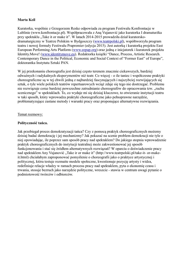 Marta Keil Kuratorka, wspólnie z Grzegorzem Reske odpowiada za program Festiwalu Konfrontacje w Lublinie (www.konfrontacje.pl). Współpracowała z Aną Vujanović jako kuratorka I dramaturżka przy spektaklu „Take it or make it”. W latach 2014-2015 prowadziła dział kuratorskodramaturgiczny w Teatrze Polskim w Bydgoszczy (www.teatrpolski.pl), współtworzyła program teatru i nowej formuły Festiwalu Prapremier (edycja 2015). Jest autorką i kuratorką projektu East European Performing Arts Platform (www.eepap.org) oraz jedną z inicjatorek i kuratorek projektu Identity.Move! (www.identitymove.eu). Redaktorka książki “Dance, Process, Artistic Research. Contemporary Dance in the Political, Economic and Social Context of “Former East” of Europe”, doktorantka Instytutu Sztuki PAN. W jej przekonaniu choreografia jest dzisiaj często terenem znacznie ciekawszych, bardziej odważnych i radykalnych eksperymentów niż teatr. Co więcej - o ile taniec i współczesne praktyki choreograficzne są w tej chwili jedną z najbardziej fascynujących i najszybciej rozwijających się sztuk, o tyle wiele polskich teatrów repertuarowych wciąż zdaje się tego nie dostrzegać. Problemu nie rozwiązuje coraz bardziej powszechne zatrudnianie choreografów do opracowania tzw. „ruchu scenicznego” w spektaklach. To, co wydaje mi się dzisiaj kluczowe, to otwieranie instytucji teatru w taki sposób, który wprowadza praktyki choreograficzne jako pełnoprawne narzędzie, problematyzujące zastane metody i warunki pracy oraz proponujące alternatywne rozwiązania. Temat rozmowy: Polityczność tańca. Jak przebiegał proces demokratyzacji tańca? Czy z pomocą praktyk choreograficznych możemy dzisiaj badać demokrację i jej mechanizmy? Jak pokazać na scenie problem demokracji nie tyle o niej opowiadając, ile poprzez sam sposób pracy nad spektaklem? Do jakiego stopnia wprowadzenie praktyk choreograficznych do instytucji teatralnej może zakwestionować jej sposób funkcjonowania i stać się źródłem alternatywnych rozwiązań? W oparciu o doświadczenie pracy nad spektaklem Any Vujanović „Take ir or make it” (http://www.teatrpolski.pl/take-it- or-makeit.html) chciałabym zaproponować pomyślenie o choreografii jako o praktyce artystycznej i politycznej, która testuje rozmaite modele społeczne, kwestionuje pozycję artysty i widza, redefiniuje relacje władzy w ramach procesu pracy nad spektaklem, pyta o ekonomię czasu i trwania, stosuje bezruch jako narzędzie polityczne, wreszcie - stawia w centrum uwagi pytanie o podmiotowość twórców i odbiorców.