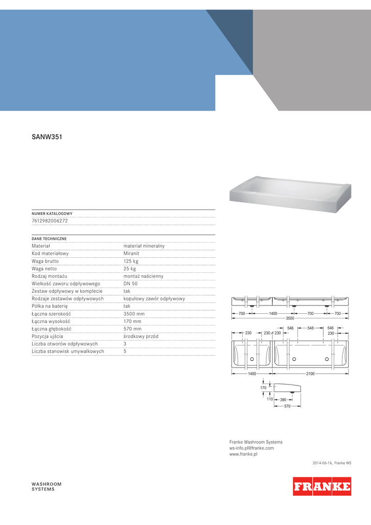 SANW351 NUMER KATALOGOWY 7612982006272 DANE TECHNICZNE Materiał Kod materiałowy Waga brutto Waga netto Rodzaj montażu Wielkość zaworu odpływowego Zestaw odpływowy w komplecie Rodzaje zestawów odpływowych Półka na baterię Łączna szerokość Łączna wysokość Łączna głębokość Pozycja ujścia Liczba otworów odpływowych Liczba stanowisk umywalkowych materiał mineralny Miranit 125 kg 25 kg montaż naścienny DN 50 tak kopułowy zawór odpływowy tak 3500 mm 170 mm 570 mm środkowy przód 3 5 Franke Washroom Systems [email protected] www.franke.pl 2014-06-16, Franke WS