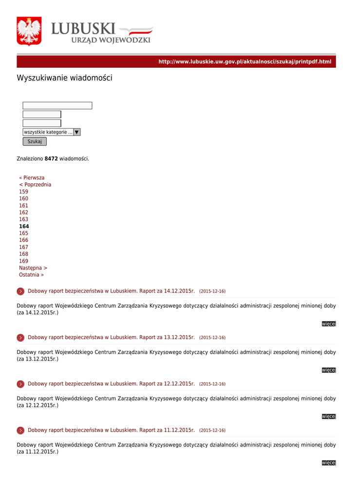 http://www.lubuskie.uw.gov.pl/aktualnosci/szukaj/printpdf.html Wyszukiwanie wiadomości wszystkie kategorie ... ▼ Szukaj Znaleziono 8472 wiadomości. « Pierwsza < Poprzednia 159 160 161 162 163 164 165 166 167 168 169 Następna > Ostatnia » Dobowy raport bezpieczeństwa w Lubuskiem. Raport za 14.12.2015r. (2015-12-16) Dobowy raport Wojewódzkiego Centrum Zarządzania Kryzysowego dotyczący działalności administracji zespolonej minionej doby (za 14.12.2015r.) więcej Dobowy raport bezpieczeństwa w Lubuskiem. Raport za 13.12.2015r. (2015-12-16) Dobowy raport Wojewódzkiego Centrum Zarządzania Kryzysowego dotyczący działalności administracji zespolonej minionej doby (za 13.12.2015r.) więcej Dobowy raport bezpieczeństwa w Lubuskiem. Raport za 12.12.2015r. (2015-12-16) Dobowy raport Wojewódzkiego Centrum Zarządzania Kryzysowego dotyczący działalności administracji zespolonej minionej doby (za 12.12.2015r.) więcej Dobowy raport bezpieczeństwa w Lubuskiem. Raport za 11.12.2015r. (2015-12-16) Dobowy raport Wojewódzkiego Centrum Zarządzania Kryzysowego dotyczący działalności administracji zespolonej minionej doby (za 11.12.2015r.) więcej Dobowy raport bezpieczeństwa w Lubuskiem. Raport za 10.12.2015r. (2015-12-16) Dobowy raport Wojewódzkiego Centrum Zarządzania Kryzysowego dotyczący działalności administracji zespolonej minionej doby (za 10.12.2015r.) więcej Dobowy raport bezpieczeństwa w Lubuskiem. Raport za 09.12.2015r. (2015-12-16) Dobowy raport Wojewódzkiego Centrum Zarządzania Kryzysowego dotyczący działalności administracji zespolonej minionej doby (za 09.12.2015r.) więcej Portal Emp@tia – usługi elektroniczne dla urzędników (2015-12-16) Informujemy, że wszystkie jednostki organizacyjne pomocy społecznej realizujące zadania z zakresu pomocy społecznej będą miały możliwość korzystania z szeregu usług elektronicznych. więcej Wojewoda w Radiu Zielona Góra (2015-12-15) Wojewoda Władysław Dajczak był gościem programu "Wokół miasta" Radia Zielona Góra. więcej Nowi inżynierowie budownictwa (2015-12-14) Ślubowanie oraz uroczyste wręczenie decyzji nadania uprawnień budowlanych dla nowych inżynierów budownictwa miało miejsce w WiMBP w Gorzowie. więcej Spotkanie opłatkowe u gorzowskich Sybiraków (2015-12-14) Wspólna modlitwa, życzenia i kolędowanie – taką, tradycyjną już postać, miało spotkanie opłatkowe gorzowskich Sybiraków. W uroczystości udział wziął wojewoda Władysław Dajczak. więcej « Pierwsza < Poprzednia 159 160 161 162 163 164 165 166 167 168 169 Następna > Ostatnia »