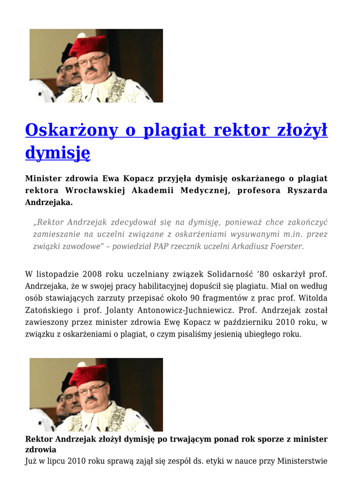 Oskarżony o plagiat rektor złożył dymisję Minister zdrowia Ewa Kopacz przyjęła dymisję oskarżanego o plagiat rektora Wrocławskiej Akademii Medycznej, profesora Ryszarda Andrzejaka. „Rektor Andrzejak zdecydował się na dymisję, ponieważ chce zakończyć zamieszanie na uczelni związane z oskarżeniami wysuwanymi m.in. przez związki zawodowe” – powiedział PAP rzecznik uczelni Arkadiusz Foerster. W listopadzie 2008 roku uczelniany związek Solidarność ’80 oskarżył prof. Andrzejaka, że w swojej pracy habilitacyjnej dopuścił się plagiatu. Miał on według osób stawiających zarzuty przepisać około 90 fragmentów z prac prof. Witolda Zatońskiego i prof. Jolanty Antonowicz-Juchniewicz. Prof. Andrzejak został zawieszony przez minister zdrowia Ewę Kopacz w październiku 2010 roku, w związku z oskarżeniami o plagiat, o czym pisaliśmy jesienią ubiegłego roku. Rektor Andrzejak złożył dymisję po trwającym ponad rok sporze z minister zdrowia Już w lipcu 2010 roku sprawą zajął się zespół ds. etyki w nauce przy Ministerstwie Nauki i Szkolnictwa Wyższego. Jego członkowie po trzymiesięcznym badaniu sprawy orzekli, że praca habilitacyjna prof. Andrzejaka jest plagiatem. Zespół nie mógł jednak pozbawić rektora stanowiska ani tytułu naukowego. Co ciekawe, wcześniej sprawą plagiatu zajął się powołany przez Ministerstwo Zdrowia rzecznik dyscyplinarny, który nie dopatrzył się nadużyć w pracy prof. Andrzejaka. Sam rektor Andrzejak zaprzecza, jakoby miał popełnić plagiat. Jesienią 2010 roku rozpoczęła się głosowań na wrocławskiej uczelni nad odwołaniem prof. Andrzejaka z funkcji rektora. Pierwsze głosowanie odbyło się pod koniec listopada. Wówczas do odwołania rektora zabrakło siedmiu głosów elektorów. Mimo tego, decyzję Kolegium Elektorów zakwestionowała minister zdrowia. Do drugiego głosowania doszło na początku marca 2011 roku. Wówczas do odwołania rektora zabrakło czterech głosów. Jeszcze jesienią 2010 roku, w konsekwencji przeciągającego się postępowania w sprawie plagiatu rektora na uczelni Centralna Komisja do spraw Stopni i Tytułów 30 września zawiesiła Wydziałowi Lekarskiemu wrocławskiej Akademii Medycznej uprawnienia do nadawania habilitacji i prowadzenia procedur profesorskich. Akademia odwołała się od tej decyzji. Prof. Andrzejak poinformował o zamiarze podania się do dymisji dwa tygodnie temu. Dymisję minister Kopacz przyjęła 29 kwietnia. Data publikacji: 05.05.2011r.