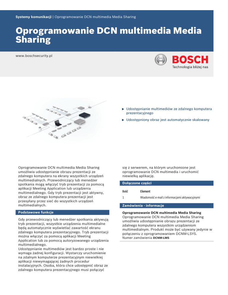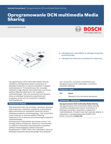 Systemy komunikacji | Oprogramowanie DCN multimedia Media Sharing Oprogramowanie DCN multimedia Media Sharing www.boschsecurity.pl Oprogramowanie DCN multimedia Media Sharing umożliwia udostępnianie obrazu prezentacji ze zdalnego komputera na ekrany wszystkich urządzeń multimedialnych. Przewodniczący lub menedżer spotkania mogą włączyć tryb prezentacji za pomocą aplikacji Meeting Application lub urządzenia multimedialnego. Gdy tryb prezentacji jest aktywny, obraz ze zdalnego komputera prezentacji jest przesyłany przez sieć do wszystkich urządzeń multimedialnych. Podstawowe funkcje Gdy przewodniczący lub menedżer spotkania aktywują tryb prezentacji, wszystkie urządzenia multimedialne będą automatycznie wyświetlać zawartość ekranu zdalnego komputera prezentacyjnego. Tryb prezentacji można włączyć za pomocą aplikacji Meeting Application lub za pomocą autoryzowanego urządzenia multimedialnego. Udostępnianie multimediów jest bardzo proste i nie wymaga żadnej konfiguracji. Wystarczy uruchomienie na zdalnym komputerze prezentacyjnym niewielkiej aplikacji niewymagającej żadnych procedur instalacyjnych. Osoba, która chce udostępnić obraz ze zdalnego komputera prezentacyjnego musi połączyć u Udostępnianie multimediów ze zdalnego komputera prezentacyjnego u Udostępniony obraz jest automatycznie skalowany się z serwerem, na którym uruchomione jest oprogramowanie DCN multimedia i uruchomić niewielką aplikację. Dołączone części Ilość Element 1 Wiadomość e-mail z informacjami aktywacyjnymi Zamówienia - informacje Oprogramowanie DCN multimedia Media Sharing Oprogramowanie DCN multimedia Media Sharing umożliwia udostępnianie obrazu prezentacji ze zdalnego komputera wszystkim urządzeniom multimedialnym. Produkt może być używany jedynie w połączeniu z oprogramowaniem DCNM‑LSYS. Numer zamówienia DCNM-LMS