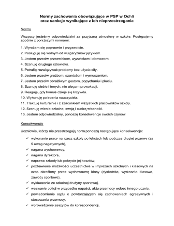 Normy zachowania obowiązujące w PSP w Ochli oraz sankcje wynikające z ich nieprzestrzegania Normy Wszyscy jesteśmy odpowiedzialni za przyjazną atmosferę w szkole. Postępujemy zgodnie z poniższymi normami: 1. Wyrażam się poprawnie i przyzwoicie. 2. Posługuję się wolnym od wulgaryzmów językiem. 3. Jestem przeciw przezwiskom, wyzwiskom i obmowom. 4. Szanuję drugiego człowieka. 5. Potrafię rozwiązywać problemy bez użycia siły. 6. Jestem przeciw groźbom, szantażom i wymuszeniom. 7. Jestem przeciw obraźliwym gestom, popychaniu i pluciu. 8. Szanuję siebie i innych, nie ulegam prowokacji. 9. Reaguję, gdy komuś dzieje się krzywda. 10. Wykonuję polecenia nauczyciela. 11. Traktuję kulturalnie i z szacunkiem wszystkich pracowników szkoły. 12. Szanuję mienie szkolne, swoją i cudzą własność. 13. Jestem odpowiedzialny, ponoszę konsekwencje swoich czynów. Konsekwencje Uczniowie, którzy nie przestrzegają norm ponoszą następujące konsekwencje: wykonanie pracy na rzecz szkoły po lekcjach lub podczas długiej przerwy (za 5 uwag negatywnych), nagana wychowawcy, nagana dyrektora, naprawa szkody lub pokrycie jej kosztów, pozbawienie możliwości uczestnictwa w imprezach szkolnych i klasowych na czas określony przez wychowawcę klasy (dyskoteka, wycieczka klasowa, zawody sportowe), wykluczenie ze szkolnej drużyny sportowej, wezwanie policji w przypadku napaści, aktu przemocy wobec innego ucznia, powiadomienie sądu o powtarzających się zachowaniach agresywnych i stosowaniu przemocy, wprowadzenie zeszytów do korespondencji,