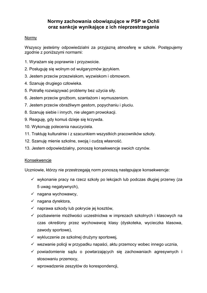 Normy zachowania obowiązujące w PSP w Ochli oraz sankcje