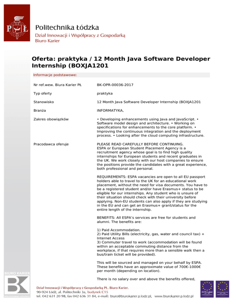 Oferta: praktyka / 12 Month Java Software Developer Internship (BOXJA1201 Informacje podstawowe: Nr ref.wew. Biura Karier PŁ BK-OPR-00036-2017 Typ oferty praktyka Stanowisko 12 Month Java Software Developer Internship (BOXJA1201 Branża INFORMATYKA, Zakres obowiązków • Developing enhancements using Java and JavaScript. • Software model design and architecture. • Working on specifications for enhancements to the core platform. • Improving the continuous integration and the deployment process. • Looking after the cloud computing infrastructure. Pracodawca oferuje PLEASE READ CAREFULLY BEFORE CONTINUING. ESPA or European Student Placement Agency is a recruitment agency whose goal is to find high quality internships for European students and recent graduates in the UK. We work closely with our host companies to ensure the positions provide the candidates with a great experience, both professional and personal. REQUIREMENTS: ESPA vacancies are open to all EU passport holders able to travel to the UK for an educational work placement, without the need for visa documents. You have to be a registered student and/or have Erasmus+ status to be eligible for our internships. Any student who is unsure of their situation should check with their university before applying. Non-EU students can also apply if they are studying in the EU and can get an Erasmus+ grant/status for the entire length of the internship. BENEFITS: All ESPA’s services are free for students and alumni. The benefits are: 1) Paid Accommodation. 2) Paid Utility Bills (electricity, gas, water and council tax) + Internet Access 3) Commuter travel to work (accommodation will be found within an acceptable commuting distance from the workplace, if that requires more than a sensible walk then a bus/train ticket will be provided). This will be sourced and managed on your behalf by ESPA. These benefits have an approximate value of 700€-1000€ per month (depending on location). There is no salary over and above the benefits offered, unless specifically stated. To know more, please visit: www.espauk.com Extra benefits As most of European grants are no longer than 6 months the host company might offer a grant replacement during the second half of the internship (months 7 to the end) in addition to the regular benefits. Miejsce pracy: Kraj WIELKA BRYTANIA, Miejscowość Bristol Wymaganie odnośnie kandydata: Wymagana znajomość języków język - Angielski Dodatkowe umiejętności Essential: • Computer Science, IT related degree or scientific/numerate degree. • Proficiency in Java, with a solid knowledge of its ecosystems, preferably SE7+. • A good understanding of SQL and relational database. • Experience developing well-tested software. • Comfortable working across a team with people of different skills. • Ability to work in a self-directed way. • Ability to pick up and evaluate new technologies. • Conduct code reviews and inspections. znajomość Bardzo dobra Desirable: • Linux or other Unix operating systems. • Experience using cloud platforms, e.g. google cloud, docker. Preferowana forma studiów - I ( studia licencjackie stacjonarne dzienne), Dane kontaktowe: Nazwa firmy/Pracodawcy Kraj Miasto Adres Kod pocztowy ESPA UK WIELKA BRYTANIA Bath Unit 12, Brassmill Enterprise Centre Brassmill Lane BA1 3JN Sposób aplikacji: EMAIL: [email protected] Data umieszczenia: Oferta ważna od 17-01-2017 do 18-04-2017 Politechnika Łódzka, jest wpisana pod numerem 2414 do rejestru podmiotów prowadzących agencje zatrudnienia.