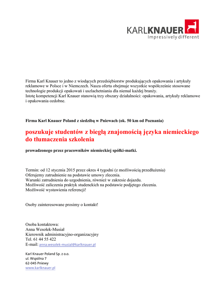 Firma Karl Knauer to jedno z wiodących przedsiębiorstw produkujących opakowania i artykuły reklamowe w Polsce i w Niemczech. Nasza oferta obejmuje wszystkie współcześnie stosowane technologie produkcji opakowań i uszlachetniania dla niemal każdej branży. Istotę kompetencji Karl Knauer stanowią trzy obszary działalności: opakowania, artykuły reklamowe i opakowania ozdobne. Firma Karl Knauer Poland z siedzibą w Pniewach (ok. 50 km od Poznania) poszukuje studentów z biegłą znajomością języka niemieckiego do tłumaczenia szkolenia prowadzonego przez pracowników niemieckiej spółki-matki. Termin: od 12 stycznia 2015 przez okres 4 tygodni (z możliwością przedłużenia) Oferujemy zatrudnienie na podstawie umowy zlecenia. Warunki zatrudnienia do uzgodnienia, również w zakresie dojazdu. Możliwość zaliczenia praktyk studenckich na podstawie podjętego zlecenia. Możliwość wystawienia referencji! Osoby zainteresowane prosimy o kontakt! Osoba kontaktowa: Anna Wesołek-Musiał Kierownik administracyjno-organizacyjny Tel. 61 44 55 422 E-mail: [email protected] Karl Knauer Poland Sp. z o.o. ul. Wspólna 7 62-045 Pniewy www.karlknauer.pl