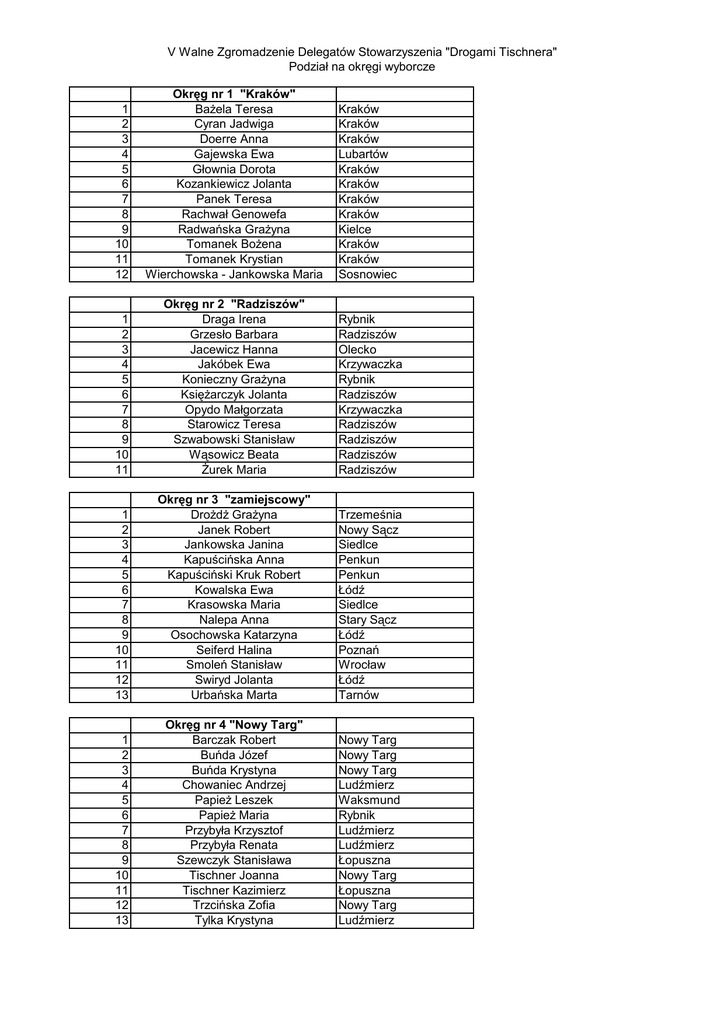V Walne Zgromadzenie Delegatów Stowarzyszenia "Drogami Tischnera" Podział na okręgi wyborcze 1 2 3 4 5 6 7 8 9 10 11 12 Okręg nr 1 "Kraków" Bażela Teresa Cyran Jadwiga Doerre Anna Gajewska Ewa Głownia Dorota Kozankiewicz Jolanta Panek Teresa Rachwał Genowefa Radwańska Grażyna Tomanek Bożena Tomanek Krystian Wierchowska - Jankowska Maria Kraków Kraków Kraków Lubartów Kraków Kraków Kraków Kraków Kielce Kraków Kraków Sosnowiec 1 2 3 4 5 6 7 8 9 10 11 Okręg nr 2 "Radziszów" Draga Irena Grzesło Barbara Jacewicz Hanna Jakóbek Ewa Konieczny Grażyna Księżarczyk Jolanta Opydo Małgorzata Starowicz Teresa Szwabowski Stanisław Wąsowicz Beata Żurek Maria Rybnik Radziszów Olecko Krzywaczka Rybnik Radziszów Krzywaczka Radziszów Radziszów Radziszów Radziszów 1 2 3 4 5 6 7 8 9 10 11 12 13 Okręg nr 3 "zamiejscowy" Drożdż Grażyna Janek Robert Jankowska Janina Kapuścińska Anna Kapuściński Kruk Robert Kowalska Ewa Krasowska Maria Nalepa Anna Osochowska Katarzyna Seiferd Halina Smoleń Stanisław Swiryd Jolanta Urbańska Marta Trzemeśnia Nowy Sącz Siedlce Penkun Penkun Łódź Siedlce Stary Sącz Łódź Poznań Wrocław Łódź Tarnów 1 2 3 4 5 6 7 8 9 10 11 12 13 Okręg nr 4 "Nowy Targ" Barczak Robert Buńda Józef Buńda Krystyna Chowaniec Andrzej Papież Leszek Papież Maria Przybyła Krzysztof Przybyła Renata Szewczyk Stanisława Tischner Joanna Tischner Kazimierz Trzcińska Zofia Tylka Krystyna Nowy Targ Nowy Targ Nowy Targ Ludźmierz Waksmund Rybnik Ludźmierz Ludźmierz Łopuszna Nowy Targ Łopuszna Nowy Targ Ludźmierz V Walne Zgromadzenie Delegatów Stowarzyszenia "Drogami Tischnera" Podział na okręgi wyborcze 1 2 3 4 5 6 7 8 9 10 11 Okręg nr 5 "Łopuszna - Toruń" Bielecka-Skop Małgorzata Chowaniec Dorota Głowa Monika Kamińska Maria Michalik Józef Skowrońska Wiesława Skulmowska Agnieszka Szczepanowicz Zofia Wąsowicz Urszula Wiślicka-Wangin Anna Zontek Lidia 1 2 3 4 5 Okręg nr 6 "Mszana Górna" Domagała Helena Kamiński Leszek Mazur Jarosław Skowronek Marta Wojsław Elżbieta 1 2 3 4 5 Okręg nr 7 "Ratułów" Domagała Daniel Kosakowska Iwona Orszulak Anna Staszel Małgorzata Zając Marek Ciche Czarny Dunajec Ciche Ciche Odrowąż Podhalański 1 2 3 4 5 6 7 8 9 10 11 Okręg nr 8 "Bochnia" Czekaj Piotr Dąbrowska Alicja Gądek Aneta Góra Ewa Krakowska Alina Kupiec Bożena Ludow Joanna Mikulińska Lucyna Pietraszko Małgorzata Różyńska Agnieszka Szewczyk Anna Bochnia Bochnia Bochnia Bochnia Bochnia Bochnia Bochnia Brzesko Bochnia Bochnia Bochnia 1 2 3 4 5 6 7 8 9 10 11 12 13 Okręg nr 9 "Chrzanów" Banasik Elżbieta Boho Bogumiła Dobrzyńska Maria Katra-Koziołek Małgorzata Klimczak Małgorzata Kula Monika Kurek Iwona Lebiedzka -Groń Gabriela Ostrowska Jadwiga Paluch Bernadeta Potoczek Joanna Potoczek Wanda Wyżlic Joanna Toruń Łopuszna Łopuszna Toruń Łopuszna Toruń Toruń Harklowa Ludźmierz Toruń Chabówka Niedźwiedż Mszana Górna Mszana Górna Kasina Wielka Mszana Górna Jaworzno Chrzanów Chrzanów Chrzanów Chrzanów Chrzanów Chrzanów Chrzanów Chrzanów Piła Kościelecka Chrzanów Chrzanów Chrzanów V Walne Zgromadzenie Delegatów Stowarzyszenia "Drogami Tischnera" Podział na okręgi wyborcze 14 Zięba Grażyna 1 2 3 4 5 6 7 8 9 10 11 12 13 14 15 16 Okręg nr 10 "Ligota" Chwastek Renata Chwierut Agata Czopnik-Niesytko Grażyna Dyrda Bożena Dyrda Józef Dziech Janina Jasik Agata Jasik Grzegorz Kluz Grażyna Okrzeszowska Renata Parchańska Barbara Szczypka Elżbieta Twardowska Ewa Twardowski Andrzej Walczy Andrzej Walczy Krystyna Chrzanów Ligota Dankowice Ligota Ligota Ligota Ligota Ligota Ligota Bielsko Biała Mazańcowice Czechowice Dziedzice Czechowice Dziedzice Bielsko-Biała Bielsko-Biała Ligota Ligota Okręg wyborczy nr 11 "Wadowice-Wałcz" 1 Bzowski Rafał Wadowice 2 Ferkowska Anna Wałcz 3 Harańczyk Anna Wadowice 4 Harańczyk Marta Wadowice 5 Kosińska Jolanta Wadowice 6 Matysko Beata Wałcz 7 Molka Leszek Mirosławiec 8 Mońska Maria Wałcz 9 Niewczas Sławomir Wałcz 10 Opidowicz Lucyna Wadowice 11 Pachel Janina Andrychów 12 Rystok Agnieszka Wałcz 13 Skoczylas Jolanta Kalwaria Zebrzydowska 1 2 3 4 5 6 7 8 9 10 11 12 13 Okręg wyborczy nr 12 "Wola" Bandoła Barbara Graczykowska Aleksandra Fajfer Piotr Hatłas Agnieszka Koniecka Małgorzata Kula Henryk Matusik Iwona Motyka Krystyna Opitek Elżbieta Piątek Zdzisława Sojka Maria Tuchowska Maria Zabawa Emilia Wola Wola Wola Jawiszowice Tychy Wola Brzeszcze Wola Gilowice Wola Pszczyna Wola Wola 1 2 3 4 5 Okręg wyborczy nr 13 "Żory" Barczyk Ewa Barczyk Zyta Bober Aleksandra Goździk Tomasz Herman Adam Jastrzębie Zdrój Warszowice Rybnik Wodzisław Śląski Warszowice V Walne Zgromadzenie Delegatów Stowarzyszenia "Drogami Tischnera" Podział na okręgi wyborcze 6 7 8 9 10 11 12 13 14 15 16 17 18 19 20 21 Hetman Anna Kałus Ewa Kawulok Halina Konsek Krzysztof Lewandowska Monika Majewska Małgorzata Piasecka Julitta Pyrchała Janina Raziuk Danuta Satława Janina Staroń Zdzisława Szczurek Katarzyna Szkołda Agnieszka Szymon Barbara Tyniecka Urszula Zimończyk Aleksandra Jastrzębie Zdrój Żory Zory Żory Żory Zory Żory Żory Żory Żory Żory Żory Żory Żory Zory Żory