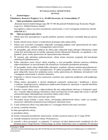 Południowy Koncern Węglowy S.A. w Jaworznie WYMAGANIA OFERTOWE (przetarg) I. Zamawiający: Południowy Koncern Węglowy S.A., 43-600 Jaworzno, ul. Grunwaldzka 37 II. Opis przedmiotu zamówienia: „Remont Ŝurawia budowlanego typu śB 75/100 dla potrzeb Południowego Koncernu Węglowego S.A. Zakład Górniczy Janina” Szczegółowy zakres rzeczowy przedmiotu zamówienia, w tym wymagania techniczne określa załącznik nr 1. III. Opis przygotowania oferty 1. Oferta musi być sporządzona w języku polskim, pismem czytelnym i posiadać datę jej sporządzenia. 2. KaŜdy oferent moŜe złoŜyć w konkretnym przetargu tylko jedną ofertę. 3. Oferta oraz wszystkie wymagane załączniki wymagają podpisu osób uprawnionych do reprezentowania firmy, zgodnie z wymaganiami ustawowymi. 4. W przypadku, gdy oferent dołącza do oferty jako załącznik kopię jakiegoś dokumentu, kopia winna być poświadczona na kaŜdej zapisanej stronie dokumentu klauzulą „za zgodność z oryginałem” przez osoby uprawnione do reprezentowania oferenta. 5. W sytuacji, gdy udzielono pełnomocnictw, oferta winna zawierać oryginały lub kserokopie udzielonych pełnomocnictw. 6. Kilku oferentów moŜe złoŜyć ofertę wspólną, w tym przypadku oferenci ponoszą solidarną odpowiedzialność za niewykonanie lub nienaleŜyte wykonanie przedmiotu przetargu. 7. W przypadku, kiedy ofertę składa kilku oferentów wspólnie, oferenci ustanawiają pełnomocnika do reprezentowania ich w postępowaniu. W takim przypadku oferta oraz wszystkie wymagane załączniki muszą być podpisane przez osobę uprawnioną do składania oświadczeń woli i zaciągania zobowiązań w imieniu oferentów. 8. Poprawki w ofercie muszą być naniesione czytelnie oraz opatrzone podpisem osób podpisujących ofertę. 9. Ofertę naleŜy sporządzić w dwóch odrębnych częściach: technicznej i handlowej i złoŜyć w jednym, nieprzejrzystym, zaklejonym opakowaniu (kopercie), opisanym w sposób określony w wymaganiach ofertowych. 10. KaŜda z części oferty wraz z odpowiednimi dla niej załącznikami ułoŜona w kolejności zgodnie z wzorem odpowiedniego formularza oferty powinna być trwale spięta lub zszyta w sposób uniemoŜliwiający dekompletację zawartości danej części oferty. 11. KaŜda z części oferty musi zawierać spis treści. 12. Wszystkie strony kaŜdej z części oferty, zawierające jakiekolwiek teksty, znaki czy rysunki, muszą być oddzielnie ponumerowane kolejnymi numerami stron. 13. Część techniczna oferty (wg załącznika nr 2 wymagań ofertowych) musi zawierać: a) nazwę i siedzibę oferenta; b) datę sporządzenia oferty; c) przedmiot oferty; d) termin wykonania przedmiotu zamówienia: od dnia zawarcia umowy do 31 maja 2010r. e) warunki transportu (na koszt własny Wykonawcy); f) warunki i okres gwarancji: co najmniej 12 miesięcy od dnia dopuszczenie urządzenia do eksploatacji przez Urząd Dozoru Technicznego na Ŝuraw budowlany oraz co najmniej 24 miesiące Przetarg nr 6/10 „ Remont żurawia budowlanego typu ŻB 75/100 dla potrzeb Południowego Koncernu Węglowego S.A. Zakład Górniczy Janina.” Strona 1 Południowy Koncern Węglowy S.A. w Jaworznie g) h) i) j) k) l) 14. a) b) c) d) e) f) g) h) i) na powłokę lakierniczą. Wykonawca w okresie gwarancji zapewni obsługę serwisową zgodnie z warunkami projektu umowy; oświadczenie oferenta, Ŝe usługa jest wolna od wad prawnych; oświadczenie, Ŝe oferent posiada niezbędną wiedzę i doświadczenie oraz dysponuje potencjałem technicznym i osobami zdolnymi do wykonania zamówienia; oświadczenie, Ŝe naprawa będzie przeprowadzona zgodnie z DTR producenta, a zastosowane części będą fabrycznie nowe; kserokopie: uprawnienia wydanego w formie decyzji administracyjnej przez Urząd Dozoru Technicznego dotyczącej napraw lub modernizacji dźwigów; oświadczenia oferenta zgodnie z wzorem przedstawionym w załączniku nr 2a wymagań ofertowych o: zapoznaniu się z Polityką Zintegrowanego Systemu Zarządzania Południowego Koncernu Węglowego S.A. przedstawioną w załączniku nr 4a wymagań ofertowych, zobowiązaniu się do przestrzegania przepisów prawnych obowiązujących u Zamawiającego w związku z wdroŜonym u niego Zintegrowanym Systemem Zarządzania, wyraŜenie zgody na auditowanie realizacji umowy w zakresie objętym przedmiotem zamówienia, zobowiązaniu się do takiego postępowania z naprawianymi urządzeniami, by było ono przyjazne środowisku i nie stanowiło dla niego zagroŜenia, zobowiązania się, Ŝe w przypadku powstania w procesie naprawy odpadów, Wykonawca ponosi odpowiedzialność za postępowanie z wytworzonymi odpadami. wykaz wykonanych, a w przypadku świadczeń okresowych lub ciągłych równieŜ wykonywanych usług w okresie ostatnich trzech lat przed dniem określonym jako termin złoŜenia ofert, a jeŜeli okres prowadzenia działalności jest krótszy - w tym okresie, odpowiadających swoim rodzajem usługom stanowiącym przedmiot zamówienia, z podaniem ich wartości, przedmiotu, dat wykonania i odbiorców oraz załączenia dokumentów potwierdzających, Ŝe usługi zostały naleŜycie wykonane (wg załącznika nr 4 wymagań ofertowych); Część handlowa oferty (wg załącznika nr 3 wymagań ofertowych) musi zawierać: dane oferenta: pełna nazwa oferenta, skrót nazwy oferenta, NIP, REGON, adres pocztowy, nr telefonu, nr faksu, e-mail., wskazanie osoby upowaŜnionej do kontaktu w sprawie przetargu oraz adres e-mailowy tej osoby; datę sporządzenia oferty; przedmiot oferty; cenę: Cena winna uwzględniać wszystkie koszty niezbędne dla realizacji przedmiotu umowy. warunki płatności: Wymagany minimalny termin płatności faktur wynosi 60 dni od daty otrzymania faktury. Za datę zapłaty przyjmuje się dzień obciąŜenia rachunku bankowego Zamawiającego, termin wykonania przedmiotu zamówienia, okres gwarancji, forma płatności – przelew; termin związania ofertą - 60 dni, przy czym bieg tego terminu roz
