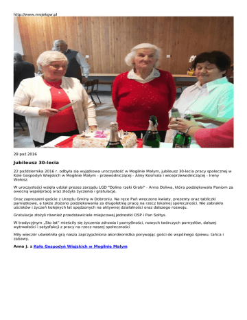 http://www.mojekgw.pl 28 paź 2016 Jubileusz 30-lecia 22 października 2016 r. odbyła się wyjątkowa uroczystość w Mogilnie Małym, jubileusz 30-lecia pracy społecznej w Kole Gospodyń Wiejskich w Mogilnie Małym - przewodniczącej - Aliny Kosmala i wiceprzewodniczącej - Ireny Wołosz. W uroczystości wzięła udział prezes zarządu LGD "Dolina rzeki Grabi" - Anna Doliwa, która podziękowała Paniom za owocną współpracę oraz złożyła życzenia i gratulacje. Oraz zaproszeni goście z Urzędu Gminy w Dobroniu. Na ręce Pań wręczono kwiaty, prezenty oraz tabliczki pamiątkowe, a także złożono podziękowania za długoletnią pracę na rzecz lokalnej społeczności. Nie zabrakło uścisków i życzeń kolejnych lat spędzonych na aktywnej działalności oraz dalszego rozwoju. Gratulacje złożyli również przedstawiciele miejscowej jednostki OSP i Pan Sołtys. W tradycyjnym „Sto lat” mieściły się życzenia zdrowia i pomyślności, nowych twórczych pomysłów, dalszej wytrwałości i satysfakcji z pracy na rzecz naszej społeczności Miły wieczór uświetniła grą nasza zaprzyjaźniona akordeonistka porywając gości do wspólnego śpiewu, tańca i zabawy. Anna J. z Koło Gospodyń Wiejskich w Mogilnie Małym